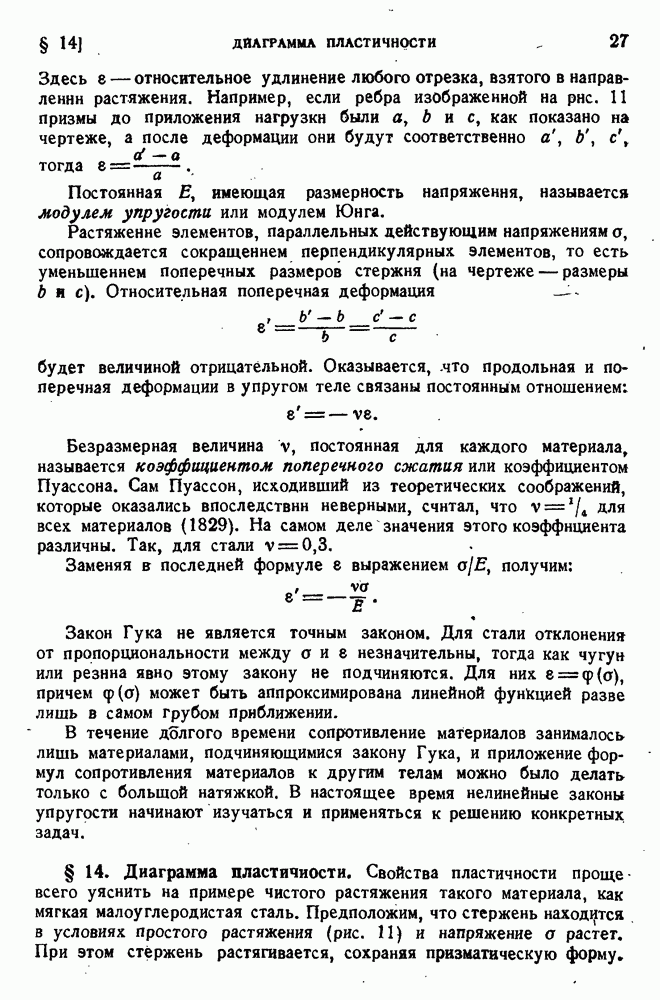 Модуль упругости меняется в гораздо более узких пределах, но все же различен для разных марок стали. Поэтому, для того чтобы использовать материал в сколько-нибудь ответственной конструкции, необходимо определить в лаборатории его механические характеристики. Этим термином мы объединяем всевозможные цифровые показатели, получающиеся в результате опыта, состоящего в деформировании тем или иным способом образца из данного материала. Такие механические характеристики, как модуль упругости и предел упругости или предел текучести, определяются непосредственно и используются при расчетах непосредственно — это некоторые физические константы материалов, имеющие вполне определенный механический смысл.