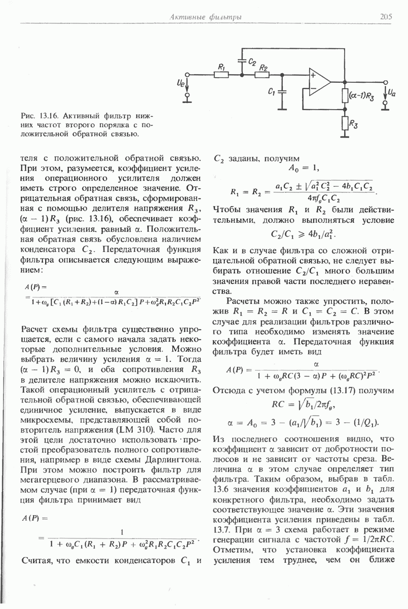Рис. 13.15. Активный фильтр нижних частот второго порядка со сложной отрицательной обратной связью.