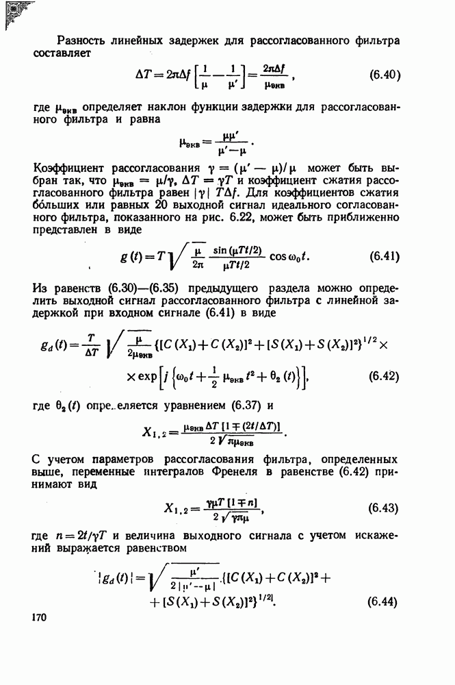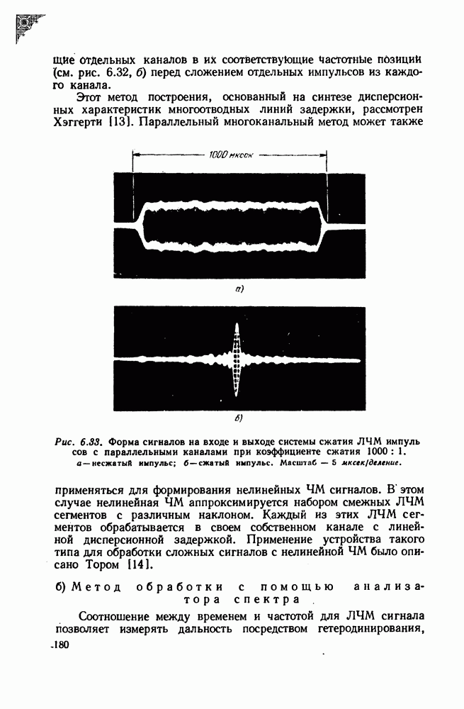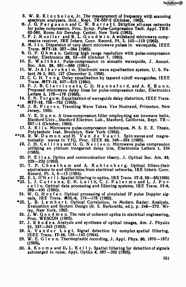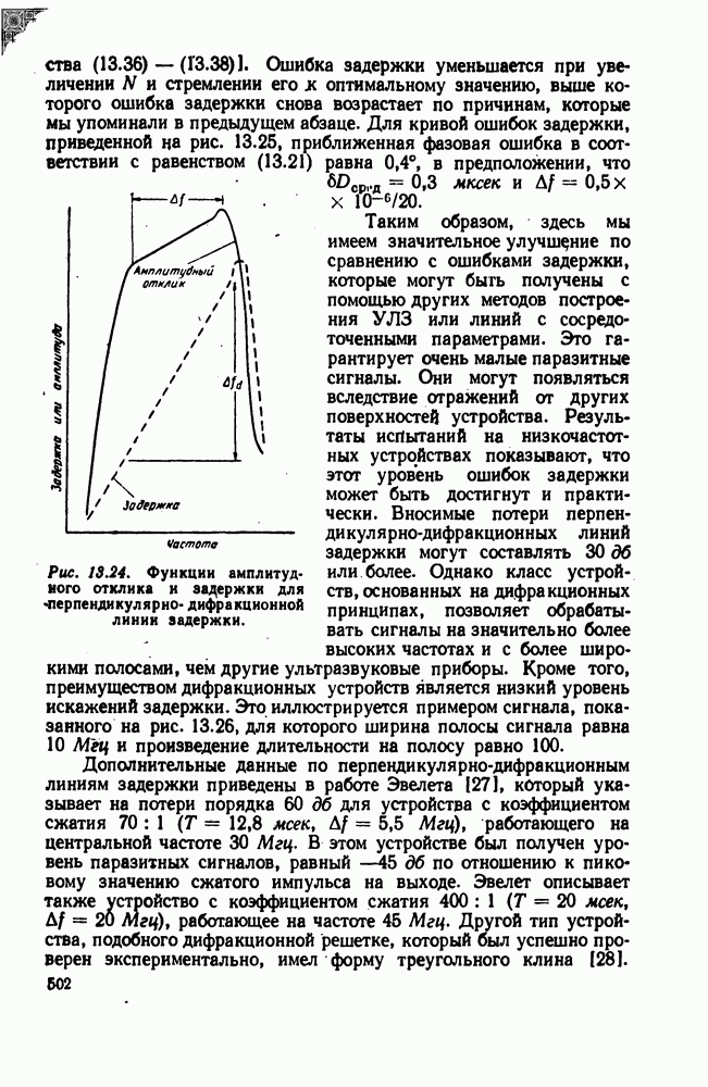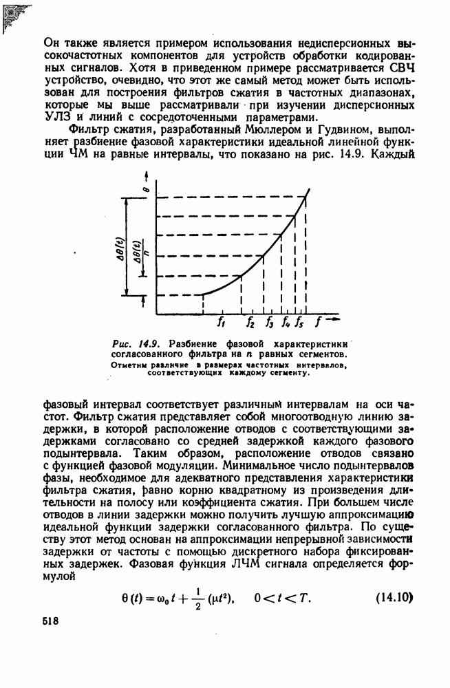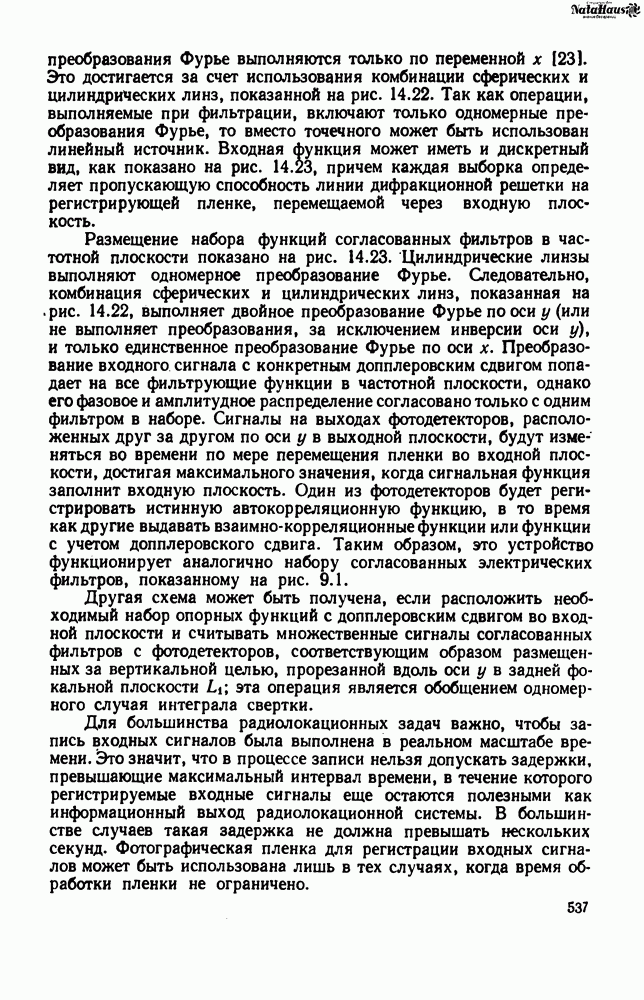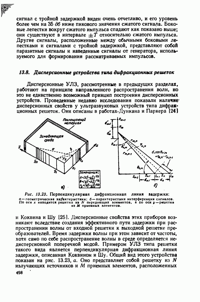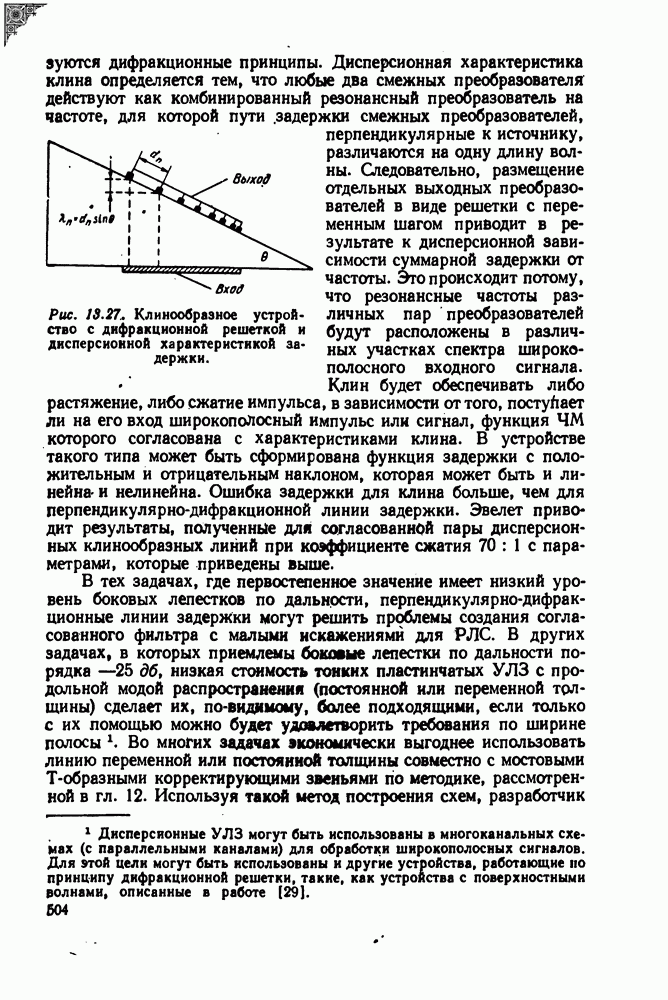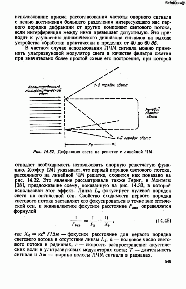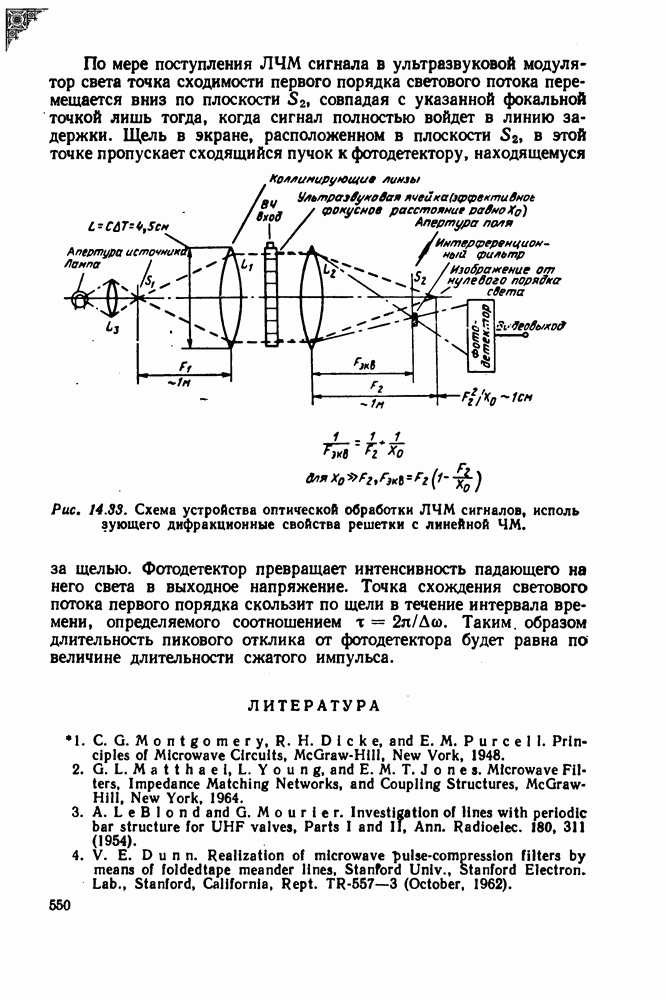 Рис. 14.33. Схема устройства оптической обработки ЛЧМ сигналов, исполь зующего дифракционные свойства решетки с линейной ЧМ. Фотодетектор превращает интенсивность падающего на него света в выходное напряжение. Точка схождения светового потока первого порядка скользит по щели в течение интервала времени, определяемого соотношением ЛИТЕРАТУРА(см. скан) (см. скан) (см. скан) ДОПОЛНИТЕЛЬНАЯ ЛИТЕРАТУРА(см. скан) (см. скан) (см. скан)