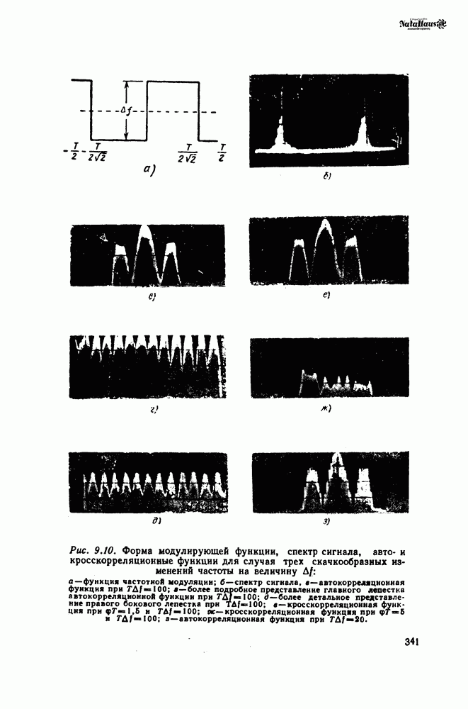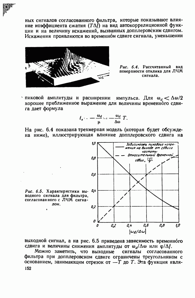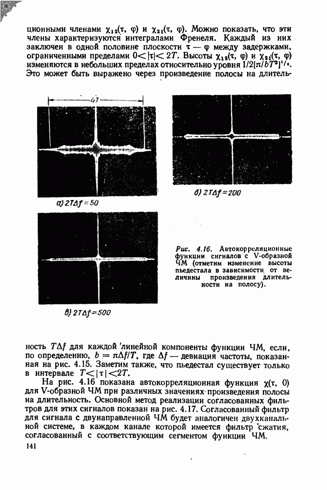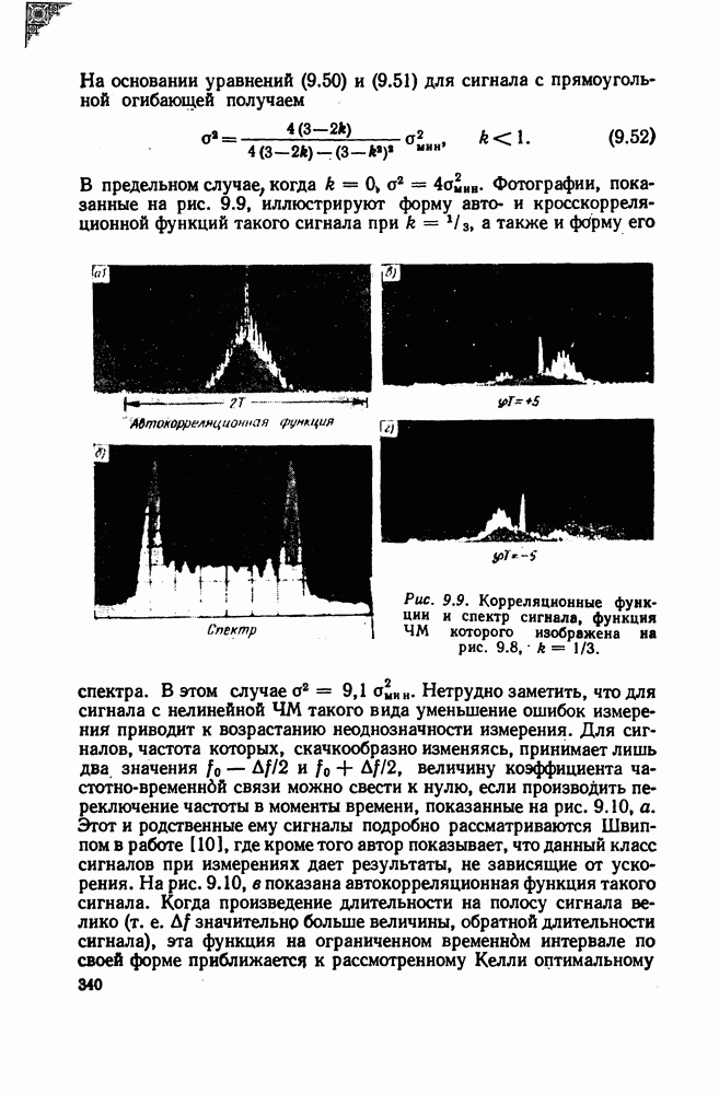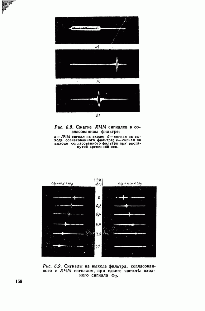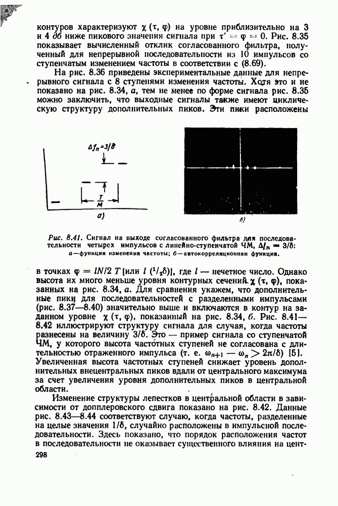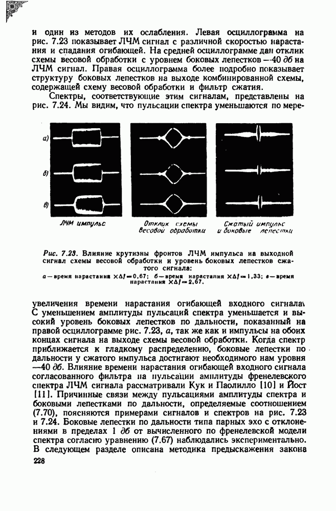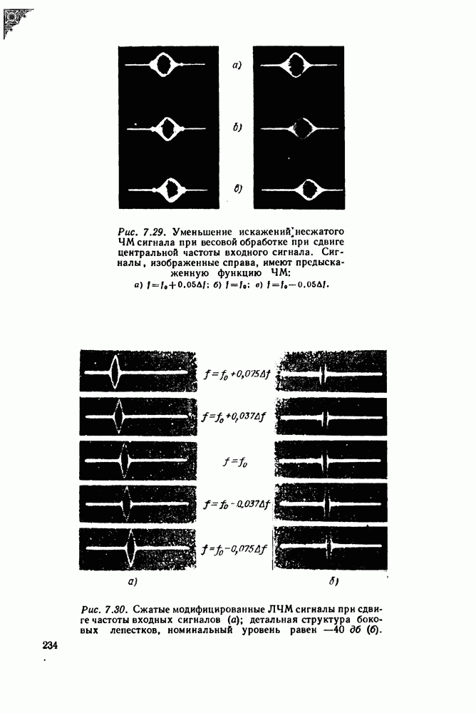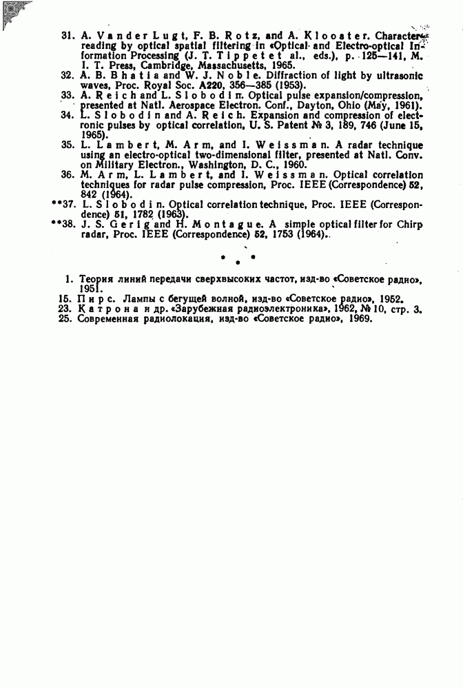 (кликните для просмотра скана) использование приема рассогласования частоты опорного сигнала с целью достижения большего разделения интересующего нас первого порядка дифракции от других компонент светового потока, если интерференция между ними превышает допустимую. Это приводит к улучшению динамического диапазона сигналов на выходе устройства обработки практически в пределах от 40 до 60 дб. В частном случае использования ЛЧМ сигнала можно применять ультразвуковой модулятор света в качестве фильтра сжатия при значительно более простой схеме его построения, при которой отпадает необходимость использовать опорную решетчатую функцию.