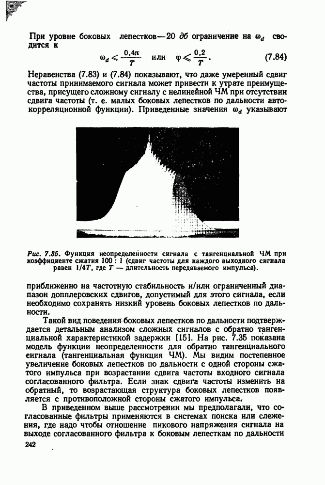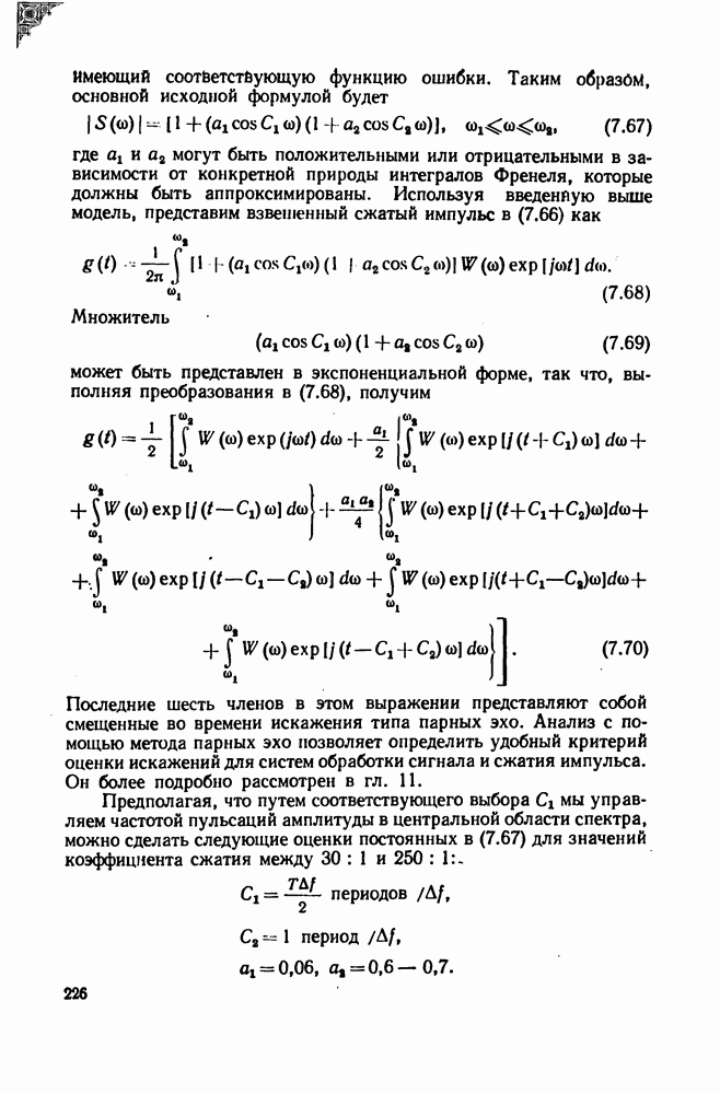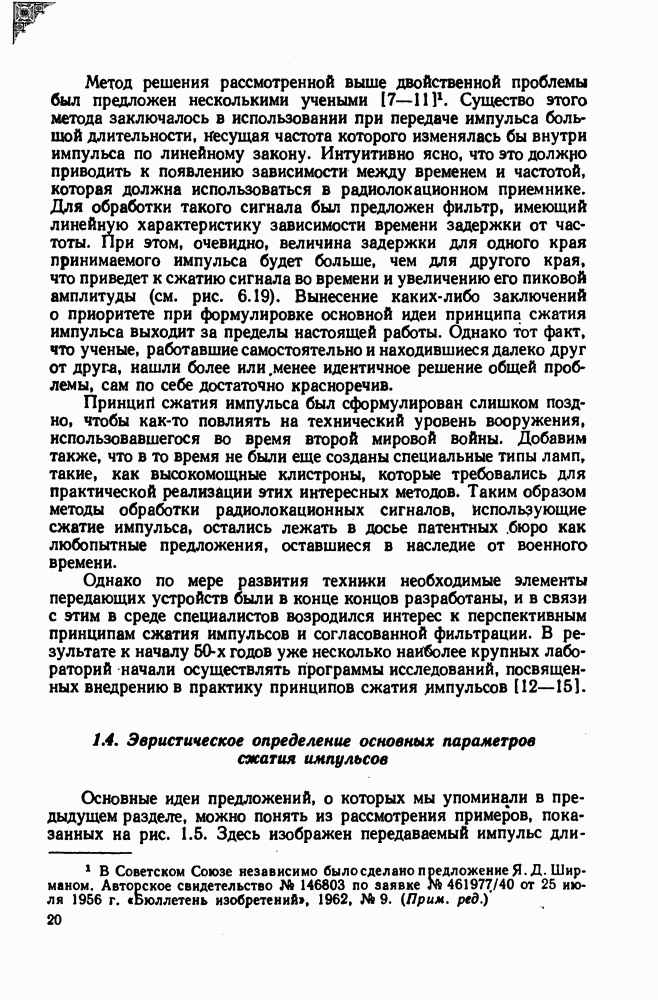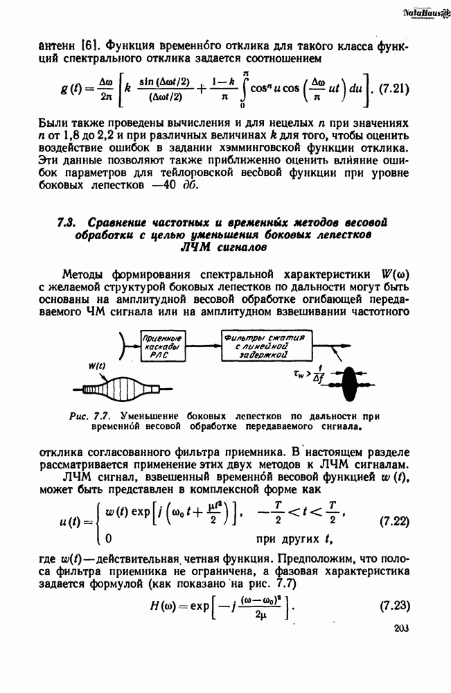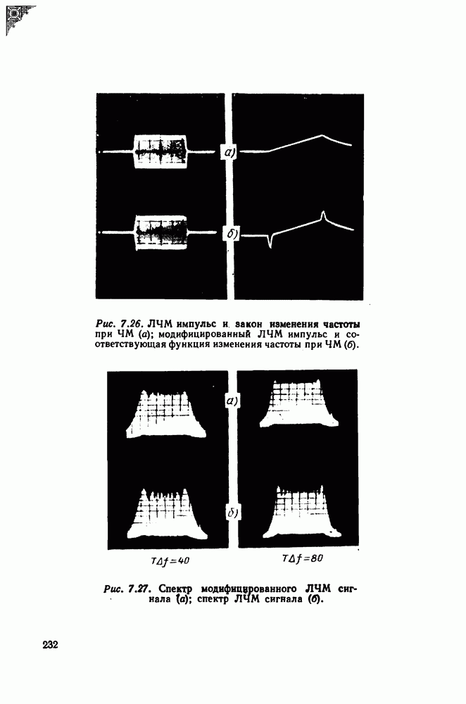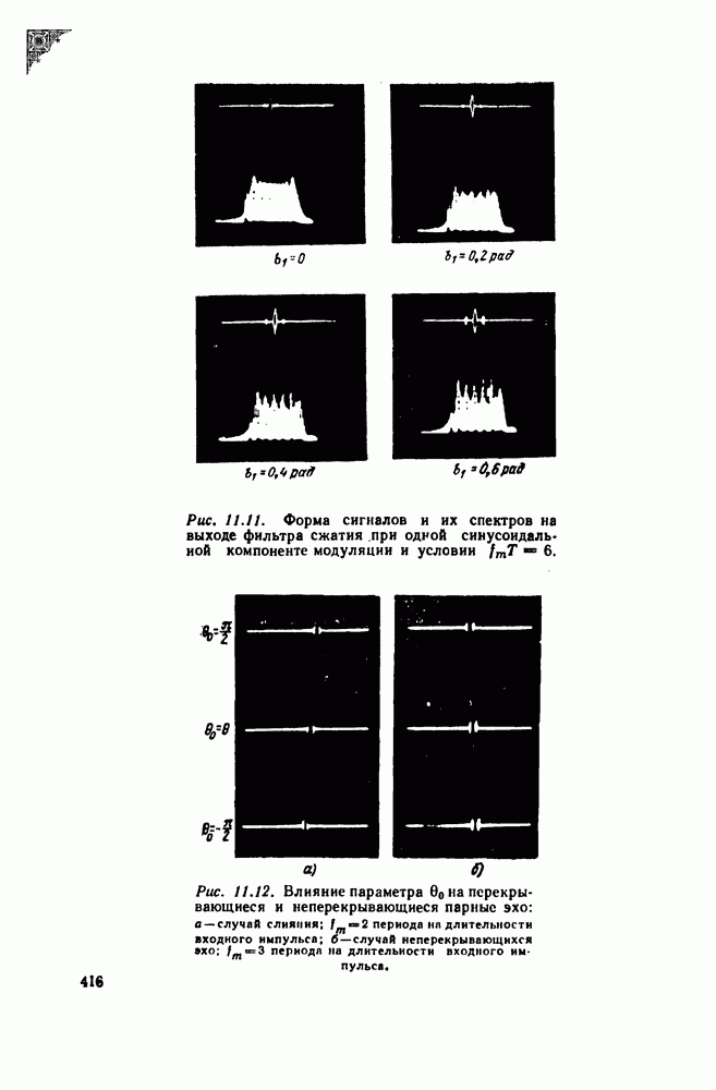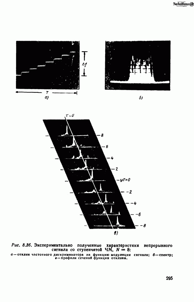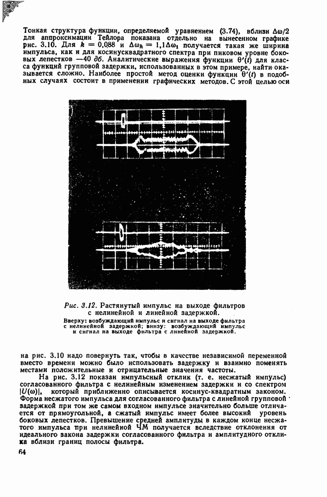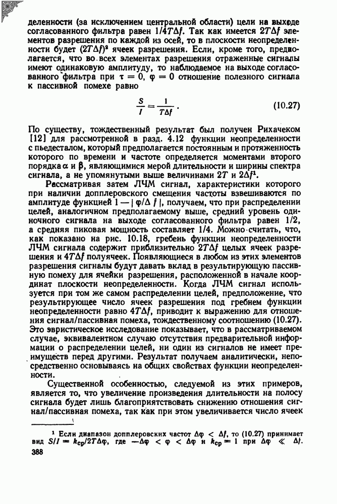(кликните для просмотра скана) использование приема рассогласования частоты опорного сигнала с целью достижения большего разделения интересующего нас первого порядка дифракции от других компонент светового потока, если интерференция между ними превышает допустимую. Это приводит к улучшению динамического диапазона сигналов на выходе устройства обработки практически в пределах от 40 до 60 дб. В частном случае использования ЛЧМ сигнала можно применять ультразвуковой модулятор света в качестве фильтра сжатия при значительно более простой схеме его построения, при которой отпадает необходимость использовать опорную решетчатую функцию.