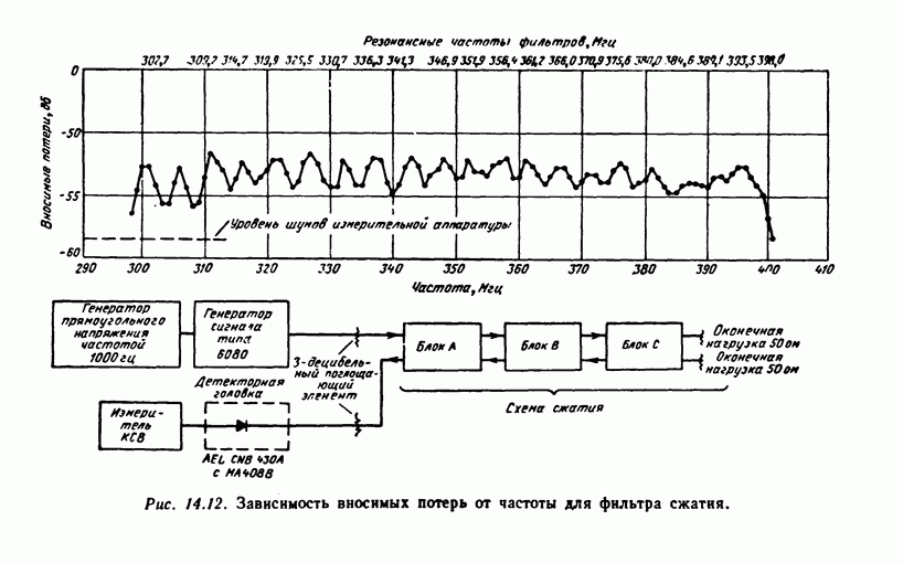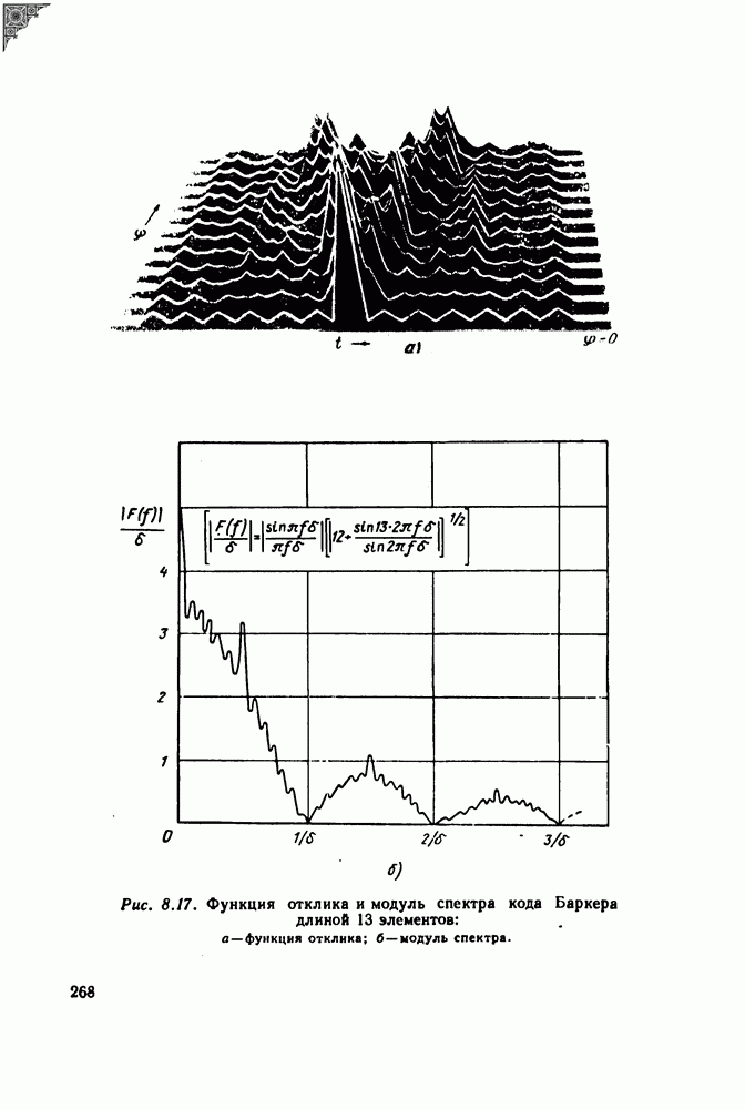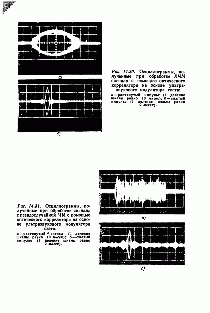 Рис. 14.29. Схема устройства для обработки сигналов с помощью ультразвукового модулятора света. Опорная решетчатая функция может быть расположена внутри или рядом с задерживающей средой; в рассматриваемых случаях такой средой служила вода. В оптическом фильтре, рассмотренном Слободиным, использовались ЛЧМ сигналы и сигналы с псевдослучайной ЧМ при значениях произведения длительности на полосу 120, при длительности сигнала 60 мксек и ширине полосы 2 Мгц. Ширина сжатого импульса составляла 0,5 мксек. Опорная решетчатая функция была получена на основе фотографического метода и оптическая система была использована для формирования кодированного сигнала путем подачи импульсов на вход ультразвукового модулятора света. На рис. 14.30, а показан растянутый ЛЧМ импульс, полученный Слободиным, а на рис. 14.30, б — соответствующий ему сжатый импульс. Сужающаяся по сторонам форма растянутого импульса возникает вследствие неидеальности общих полосовых характеристик устройства обработки. На рис. 14.31, а и б показаны растянутый и сжатый импульсы для сигнала с псевдослучайной ЧМ. Сжатый импульс на выходе фотоэлемента содержит ультразвуковую несущую, так что для дальнейшего превращения его в видеосигнал необходимо детектирование. В работе Арма и др. [36] обсуждается