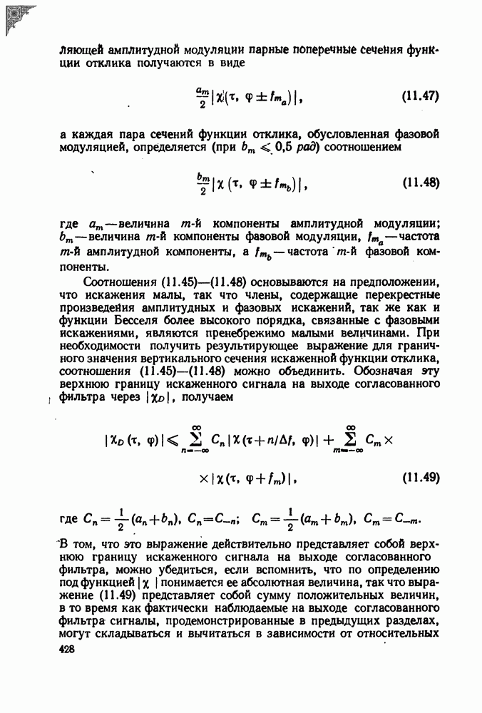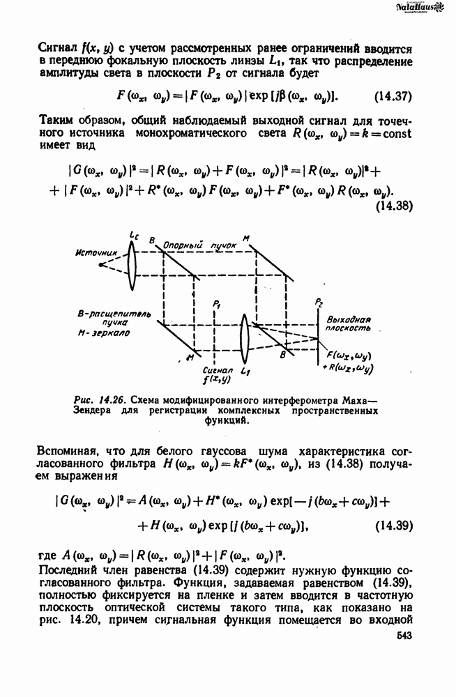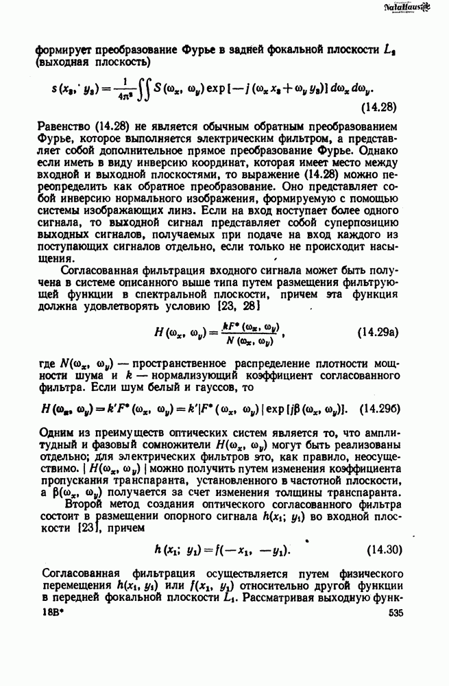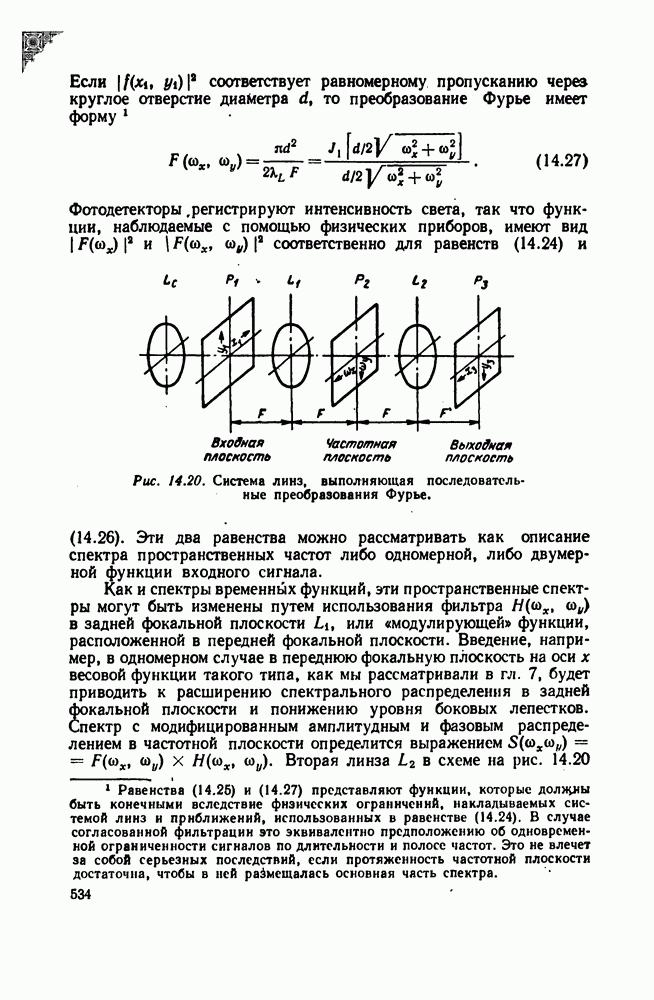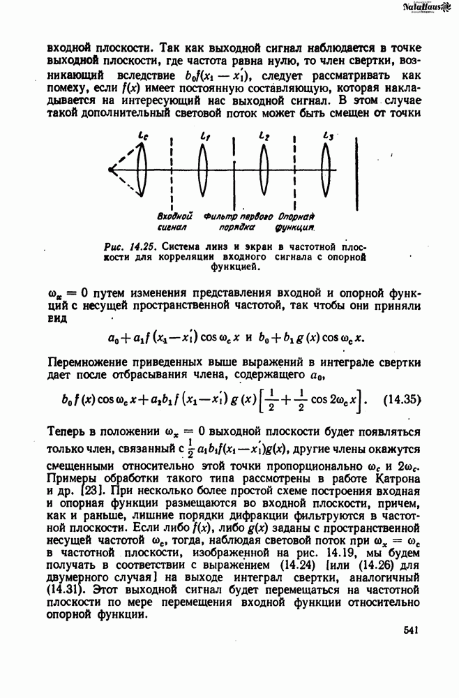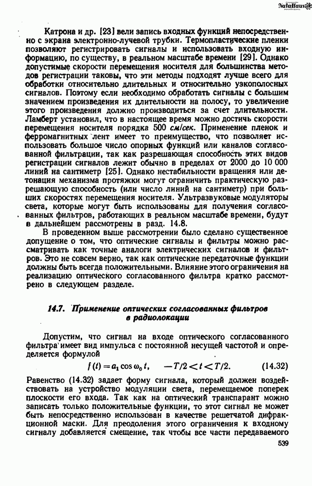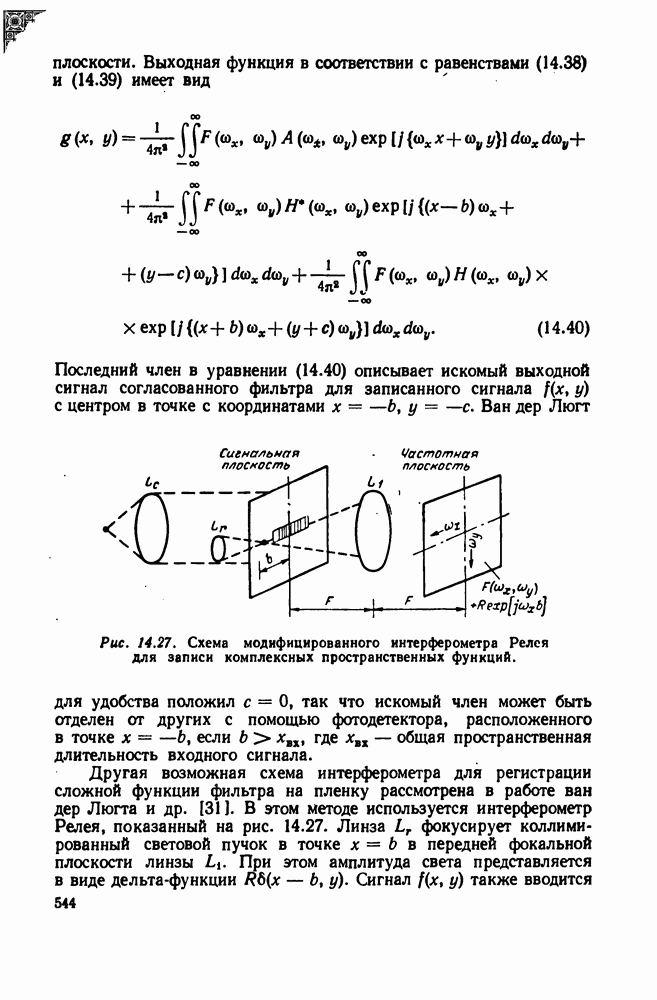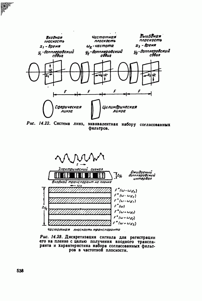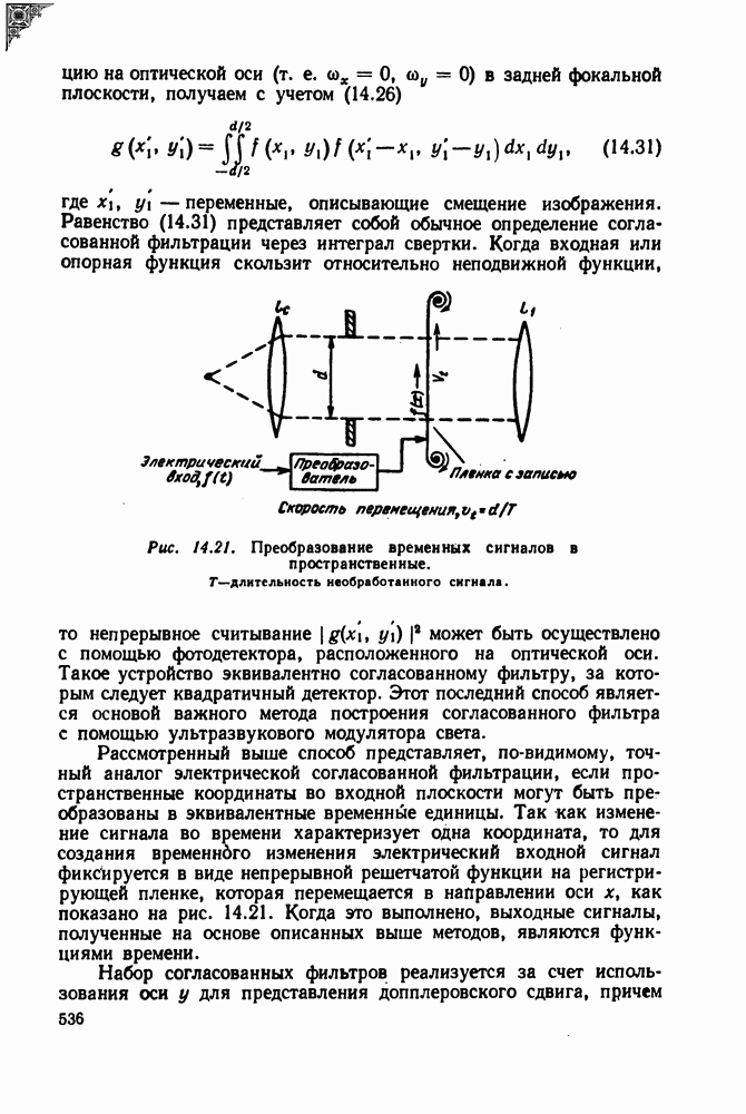 Учитывая свойства рассеянного светового потока, можно найти такую пространственную область вблизи ультразвукового модулятора, где члены равенства (14.44), содержащие то другими членами в равенства (14.44) нельзя пренебрегать, так как в результате могут возникнуть модуляционные искажения, на что указывалось в разд. 11.5 при рассмотрении случая перекрытия входных сигналов. В литературе описано несколько методов использования ультразвуковых модуляторов света в радиолокационных согласованных фильтрах. Райх и Слободин [33, 34] применили их в системе общего типа, показанной на рис. 14.28. Ламберт и др. [35], Арм и др. [36] и Слободин и др. [37] описали использование таких модуляторов в устройствах обработки сигнала, действующих на основе свертки, которые содержат опорную согласованную функцию во входной плоскости, как показано на рис. 14.29.