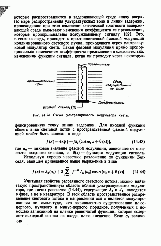 Рис. 14.28. Схема ультразвукового модулятора света. Для входной функции общего вида световой поток с пространственной фазовой модуляцией может быть записан в виде