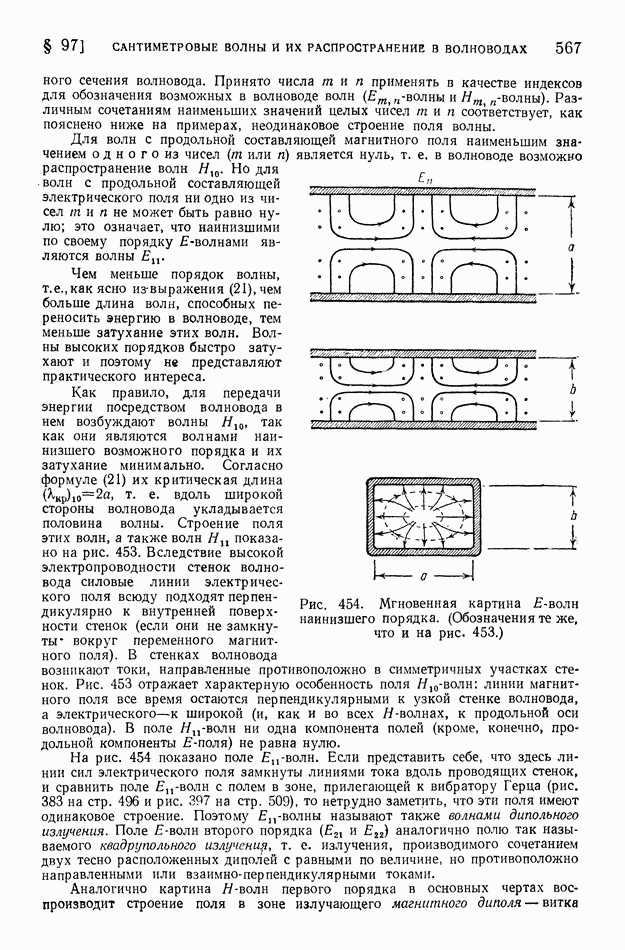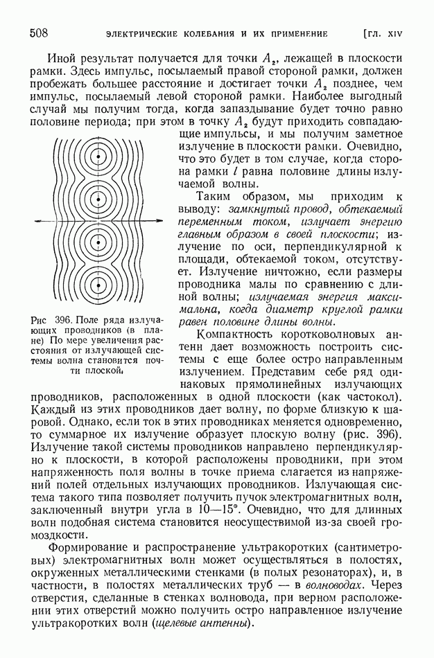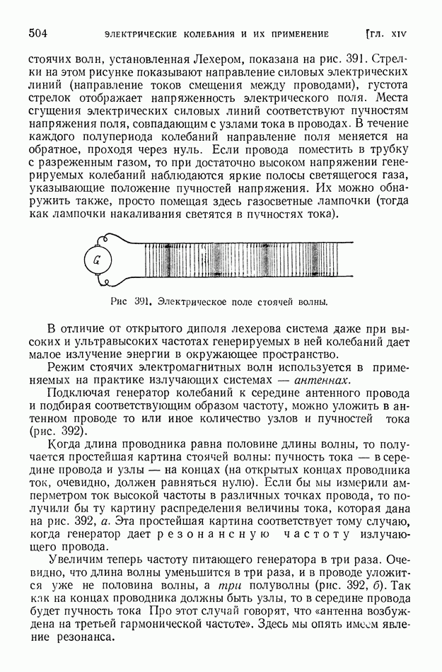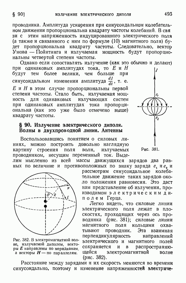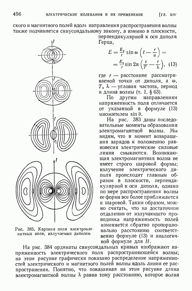 Рис. 397. Электрическое поле (в вертикальном разрезе) излучения вертикальной антенны,