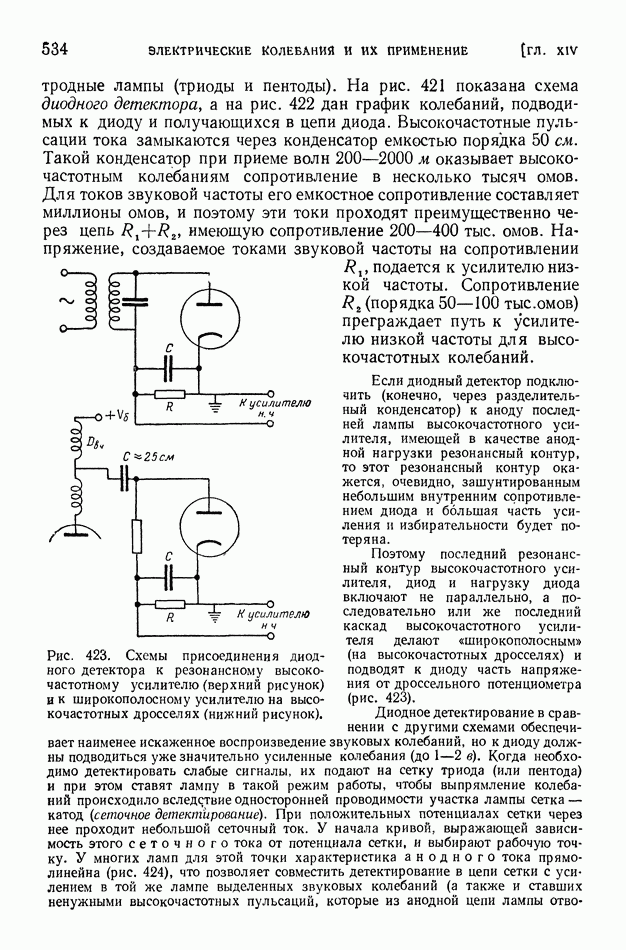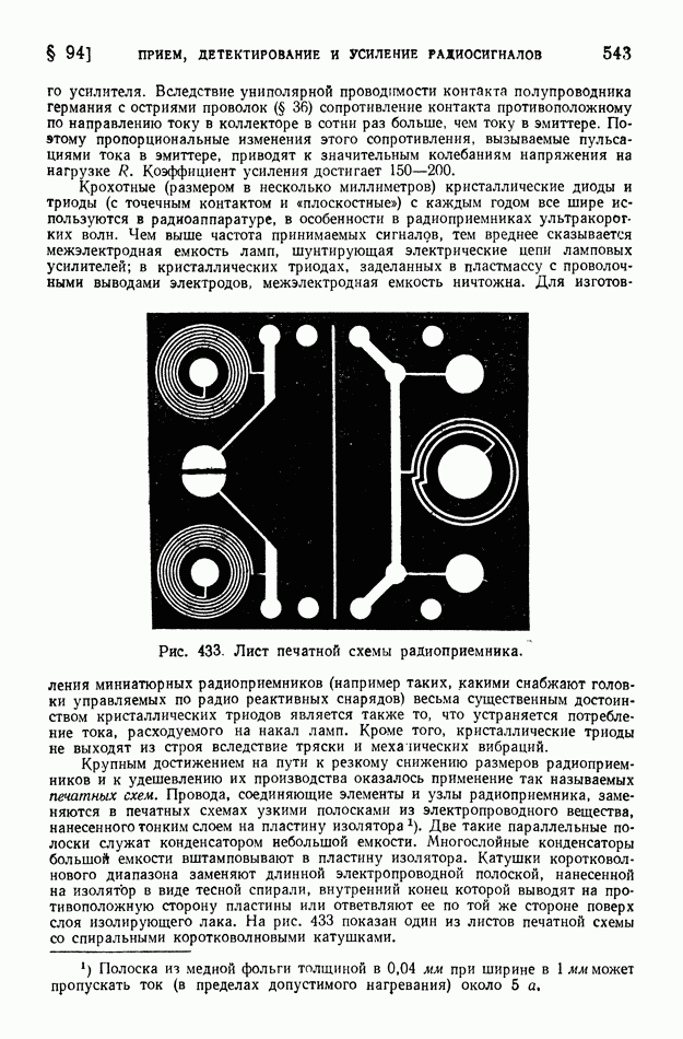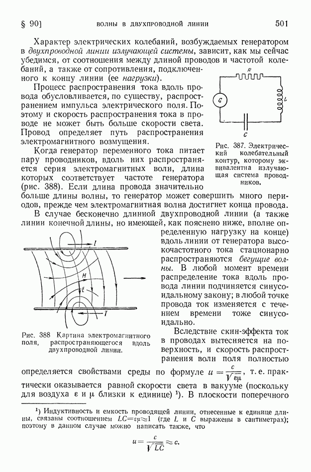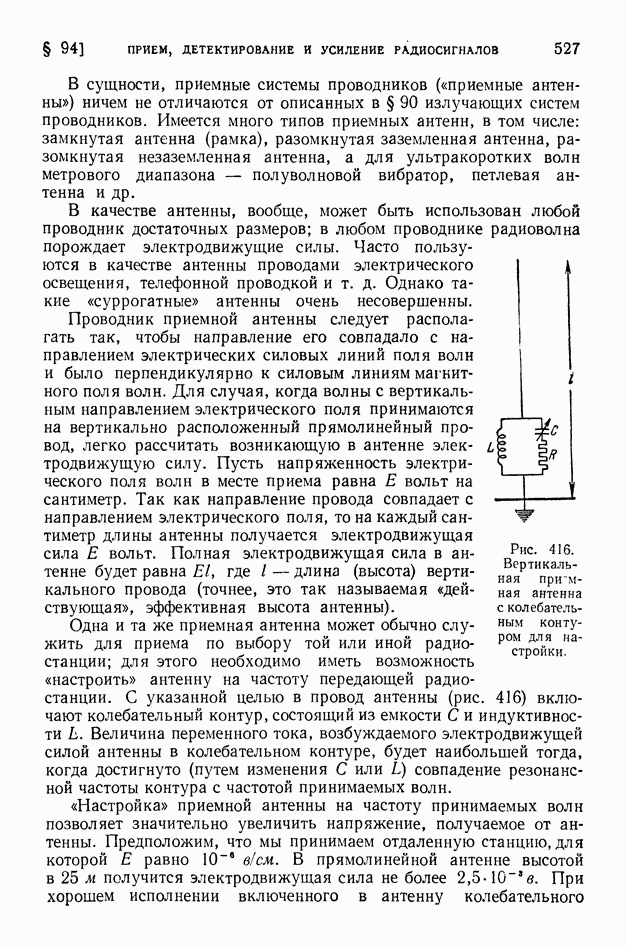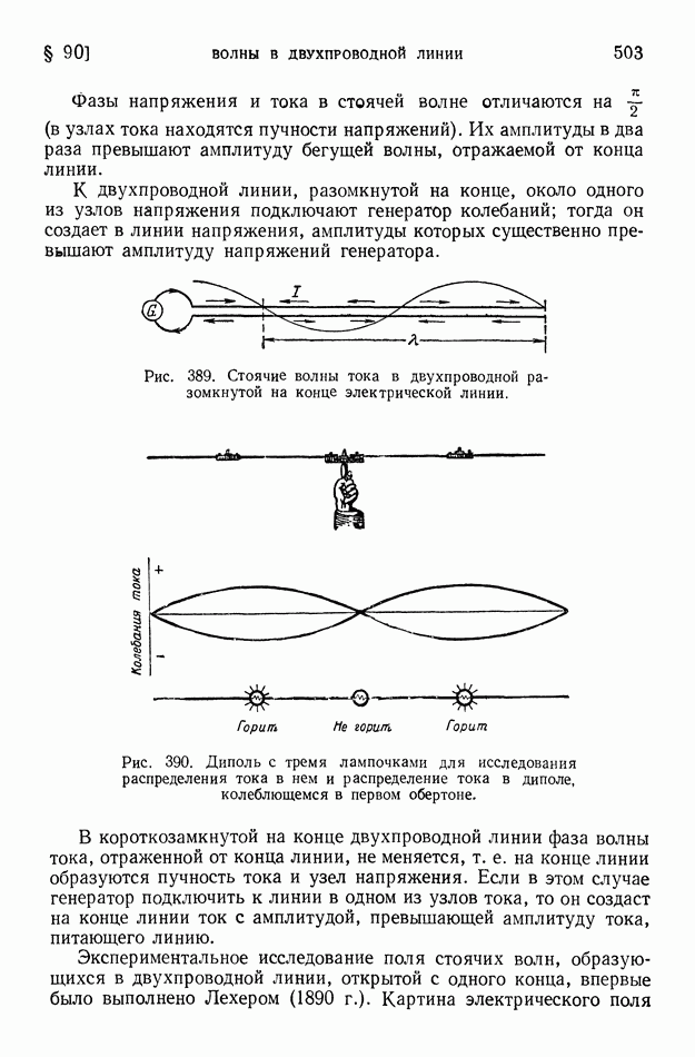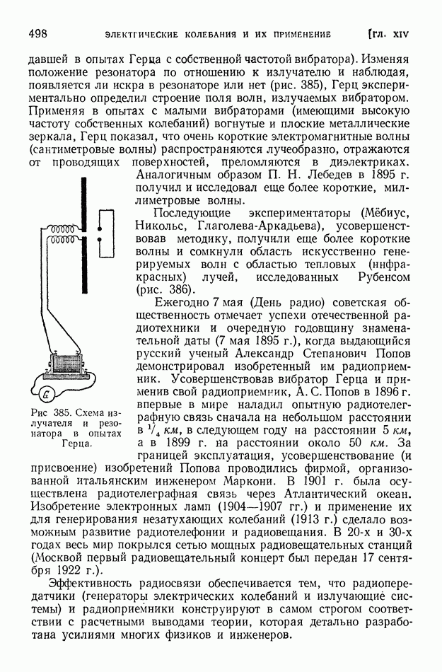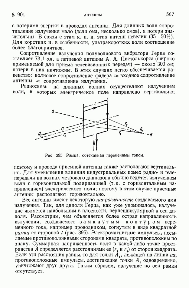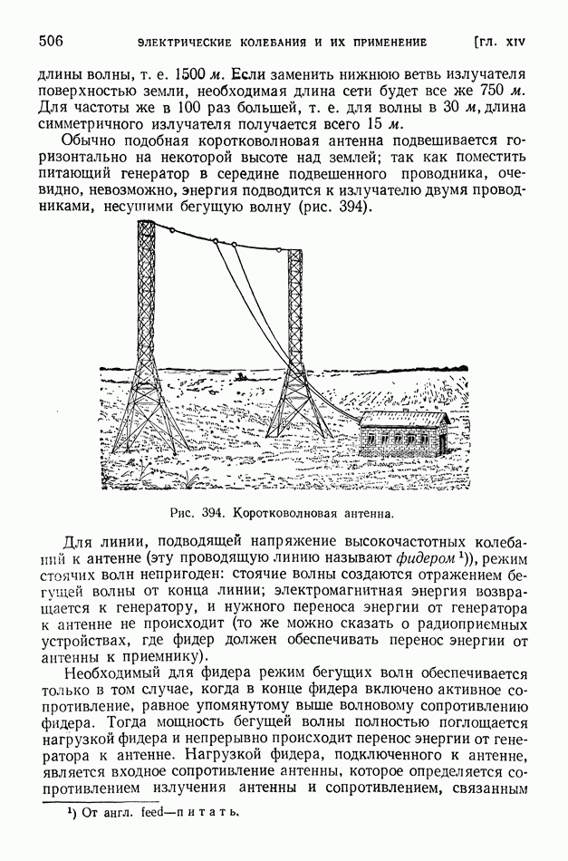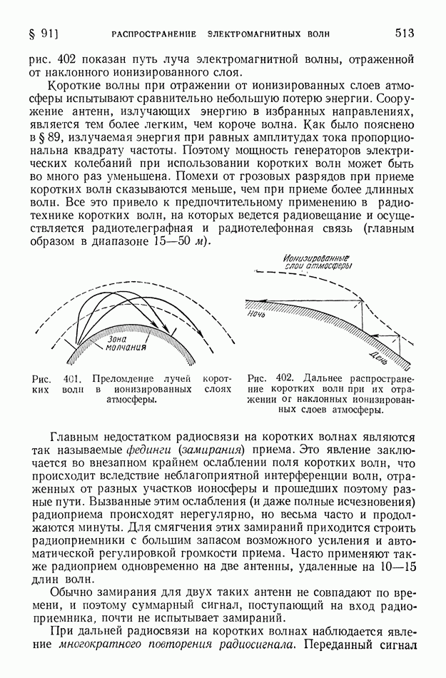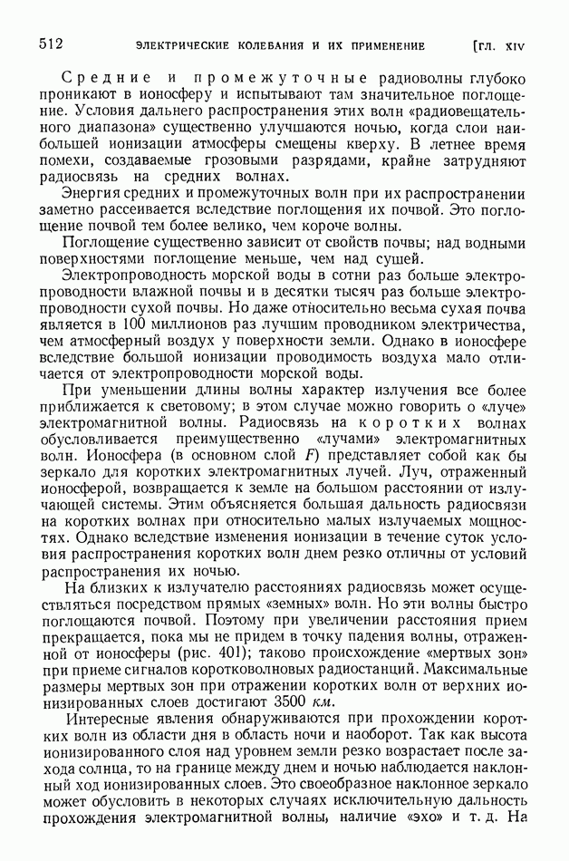 где Средние и промежуточные радиоволны глубоко проникают в ионосферу и испытывают там значительное поглощение. Условия дальнего распространения этих волн «радиовещательного диапазона» существенно улучшаются ночью, когда слои наибольшей ионизации атмосферы смещены кверху. В летнее время помехи, создаваемые грозовыми разрядами, крайне затрудняют радиосвязь на средних волнах. Энергия средних и промежуточных волн при их распространении заметно рассеивается вследствие поглощения их почвой. Это поглощение почвой тем более велико, чем короче волны. Поглощение существенно зависит от свойств почвы; над водными поверхностями поглощение меньше, чем над сушей. Электропроводность морской воды в сотни раз больше электропроводности влажной почвы и в десятки тысяч раз больше электропроводности сухой почвы. Но даже относительно весьма сухая почва является в 100 миллионов раз лучшим проводником электричества, чем атмосферный воздух у поверхности земли. Однако в ионосфере вследствие большой ионизации проводимость воздуха мало отличается от электропроводности морской воды. При уменьшении длины волны характер излучения все более приближается к световому; в этом случае можно говорить о «луче» электромагнитной волны. Радиосвязь на коротких волнах обусловливается преимущественно «лучами» электромагнитных волн. Ионосфера (в основном слой На близких к излучателю расстояниях радиосвязь может осуществляться посредством прямых «земных» волн. Но эти волны быстро поглощаются почвой. Поэтому при увеличении расстояния прием прекращается, пока мы не придем в точку падения волны, отраженной от ионосферы (рис. 401); таково происхождение «мертвых зон» при приеме сигналов коротковолновых радиостанций. Максимальные размеры мертвых зон при отражении коротких волн от верхних ионизированных слоев достигают 3500 км. Интересные явления обнаруживаются при прохождении коротких волн из области дня в область ночи и наоборот. Так как высота ионизированного слоя над уровнем земли резко возрастает после захода солнца, то на границе между днем и ночью наблюдается наклонный ход ионизированных слоев. Это своеобразное наклонное зеркало может обусловить в некоторых случаях исключительную дальность прохождения электромагнитной волны, наличие «эхо» и т. д. На рис. 402 показан путь луча электромагнитной волны, отраженной от наклонного ионизированного слоя. Короткие волны при отражении от ионизированных слоев атмосферы испытывают сравнительно небольшую потерю энергии. Сооружение антенн, излучающих энергию в избранных направлениях, является тем более легким, чем короче волна. Как было пояснено в § 89, излучаемая энергия при равных амплитудах тока пропорциональна квадрату частоты. Поэтому мощность генераторов электрических колебаний при использовании коротких волн может быть во много раз уменьшена. Помехи от грозовых разрядов при приеме коротких волн сказываются меньше, чем при приеме более длинных волн. Все это привело к предпочтительному применению в радиотехнике коротких волн, на которых ведется радиовещание и осуществляется радиотелеграфная и радиотелефонная связь (главным образом в диапазоне 15-50 м).