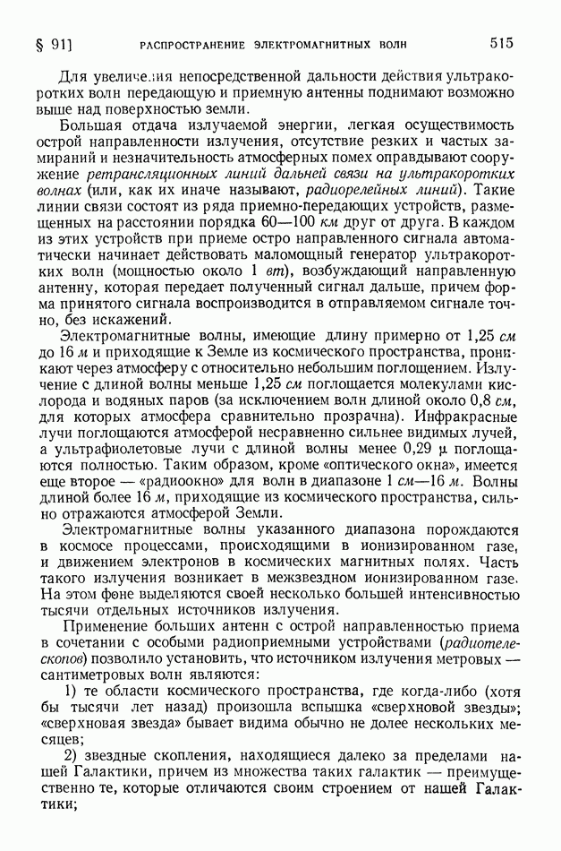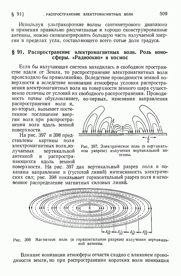§ 91. Распространение электромагнитных волн. Роль ионосферы. «Радиоокно» в космосЕсли бы излучающая система находилась в свободном пространстве вдали от Земли, то распространение электромагнитных волн происходило бы прямолинейно. Вследствие проводимости земной поверхности и вследствие ионизации атмосферы условия распространения электромагнитных волн на поверхности земного шара существенно отличны от условий их свободного распространения. Проводимость почвы обусловливает, во-первых, изменения направления распространения волн и, во-вторых, вызывает постепенное поглощение энергии волн при распространении волн вдоль земной поверхности.