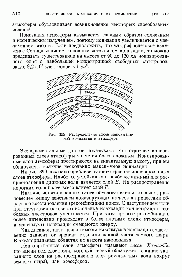 Рис. 399. Распределение слоев максимальной ионизации в атмосфере. На рис. 399 показано приблизительное строение ионизированных слоев атмосферы. Наиболее устойчивым и наиболее важным для распространения длинных волн является слой На распространение коротких волн более всего влияет слой Наличие ионизированных слоев обусловливается, конечно, равновесием между действием ионизирующих агентов и процессами обратного восстановления (рекомбинации) ионов. С наступлением ночи при отсутствии основного источника ионизации концентрация свободных электронов уменьшается. При этом процесс рекомбинации более интенсивно происходит в более плотных слоях атмосферы, и максимумы ионизации смещаются кверху. Как дневная, так и ночная высота максимумов ионизации существенно зависит от времени года для данной части земного шара. В экваториальных областях их высота наименьшая. Ионизированные слои атмосферы называют слоем Хевисайда (по имени исследователя, который первый обнаружил влияние указанного слоя на распространение электромагнитных волн вокруг земного шара), или ионосферой. Картина распространения электромагнитных волн существенно зависит от длины волны. В радиотехнике электромагнитные волны условно делят на диапазоны, указанные в помещенной ниже таблице. (см. скан) Для длинных радиоволн электропроводность ионосферы (в основном слоя