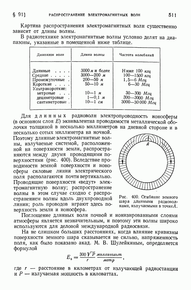 Рис. 400. Огибание земного шара длинными радиоволнами, излучаемыми в точке А. Поглощение длинных волн почвой и ионизированными слоями атмосферы является незначительным, и поэтому эти волны широко используются для деловой международной радиосвязи. На не слишком больших расстояниях, когда влияние кривизны поверхности земного шара сказывается не сильно, напряженность поля, как было показано акад. М. В. Шулейкиным, определяется формулой