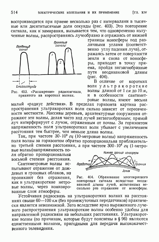 Рис. 402. Дальнее распространение коротких волн при их отражении от наклонных ионизированных слоев атмосферы. Главным недостатком радиосвязи на коротких волнах являются так называемые фединги (замирания) приема. Это явление заключается во внезапном крайнем ослаблении поля коротких волн, что происходит вследствие неблагоприятной интерференции волн, отраженных от разных участков ионосферы и прошедших поэтому разные пути. Вызванные этим ослабления (и даже полные исчезновения) радиоприема происходят нерегулярно, но весьма часто и продолжаются минуты. Для смягчения этих замираний приходится строить радиоприемники с большим запасом возможного усиления и автоматической регулировкой громкости приема. Часто применяют также радиоприем одновременно на две антенны, удаленные на 10—15 длин волн. Обычно замирания для двух таких антенн не совпадают по времени, и поэтому суммарный сигнал, поступающий на вход радиоприемника, почти не испытывает замираний. При дальней радиосвязи на коротких волнах наблюдается явление многократного повторения радиосигнала. Переданный сигнал воспроизводится при приеме несколько раз с интервалами в тысячные или десятитысячные доли секунды (рис. 403). Это повторение сигнала, как и замирания, вызывается тем, что одновременно излученные волны, распространяясь лучеобразно и отражаясь от нижней границы ионосферы под различными углами (соответственно углу падения луча), отражаясь затем от поверхности земли и снова от ионосферы, приходят в точку приема, пройдя зигзагообразные пути неодинаковой длины (рис. 404).