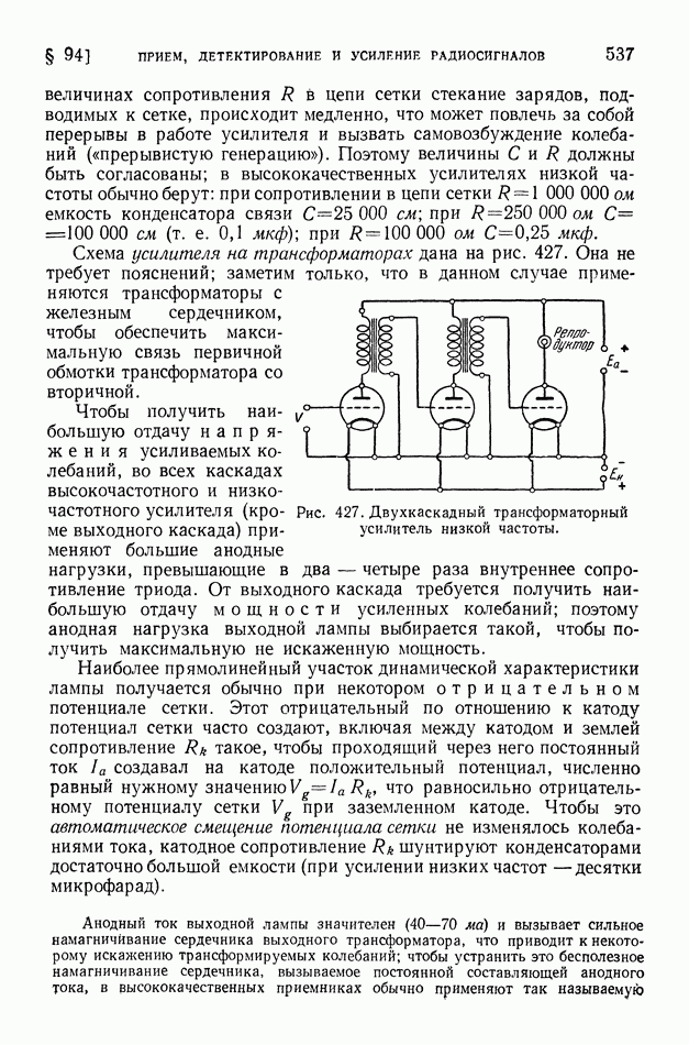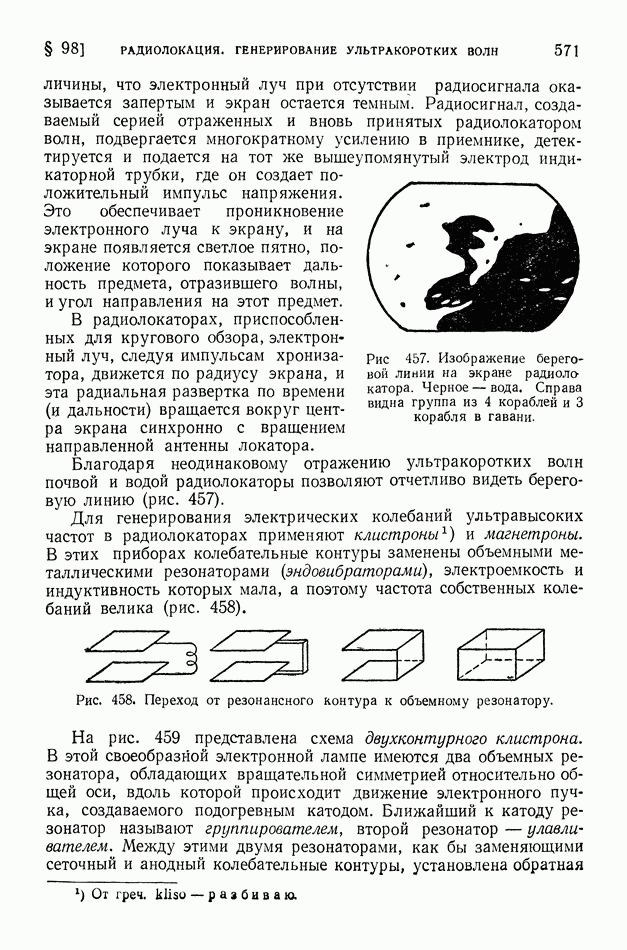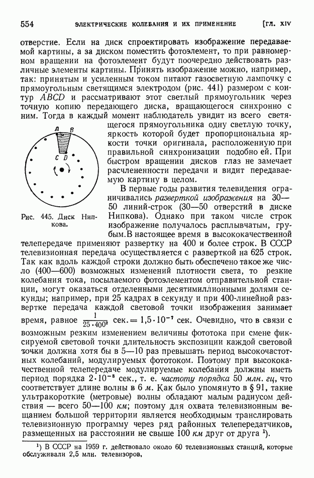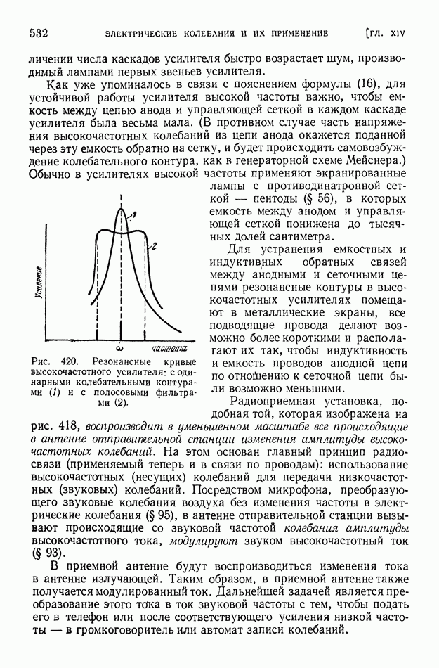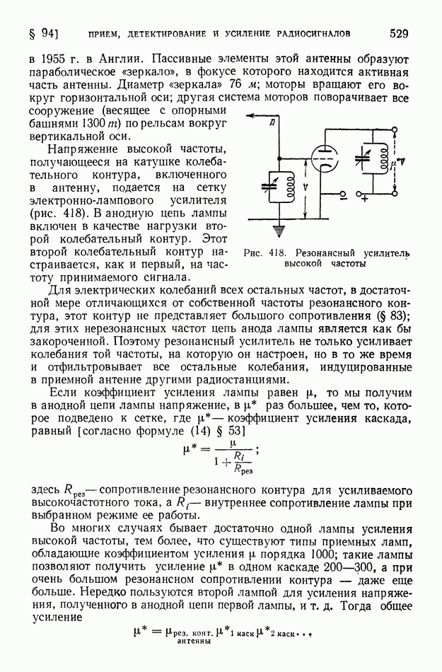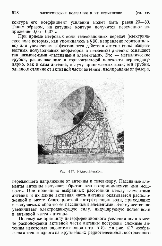 Рис. 404. Образование многократного повторения сигнала вследствие неодинаковой длины лучей, испытавших несколько раз отражение от ионосферы. В отличие от коротких волн ультракороткие волны длиной от 1 см до Так, при частоте Сантиметровые волны испытывают отражение от дождевых и грозовых облаков, но проникают без отражения, как и ультракороткие метровые волны, через ионизированные слои атмосферы. Устойчивая радиосвязь на ультракоротких волнах на расстояниях свыше Для увеличения непосредственной дальности действия ультракоротких волн передающую и приемную антенны поднимают возможно выше над поверхностью земли. Большая отдача излучаемой энергии, легкая осуществимость острой направленности излучения, отсутствие резких и частых замираний и незначительность атмосферных помех оправдывают сооружение ретрансляционных линий дальней связи на ультракоротких волнах (или, как их иначе называют, радиорелейных линий). Такие линии связи состоят из ряда приемно-передающих устройств, размещенных на расстоянии порядка 60-100 км друг от друга. В каждом из этих устройств при приеме остро направленного сигнала автоматически начинает действовать маломощный генератор ультракоротких волн (мощностью около 1 вт), возбуждающий направленную антенну, которая передает полученный сигнал дальше, причем форма принятого сигнала воспроизводится в отправляемом сигнале точно, без искажений. Электромагнитные волны, имеющие длину примерно от 1,25 см до Электромагнитные волны указанного диапазона порождаются в космосе процессами, происходящими в ионизированном газе, и движением электронов в космических магнитных полях. Часть такого излучения возникает в межзвездном ионизированном газе. На этом фоне выделяются своей несколько большей интенсивностью тысячи отдельных источников излучения. Применение больших антенн с острой направленностью приема в сочетании с особыми радиоприемными устройствами (радиотелескопов) позволило установить, что источником излучения метровых — сантиметровых волн являются: 1) те области космического пространства, где когда-либо (хотя бы тысячи лет назад) произошла вспышка «сверхновой звезды»; «сверхновая звезда» бывает видима обычно не долее нескольких месяцев; 2) звездные скопления, находящиеся далеко за пределами нашей Галактики, причем из множества таких галактик — преимущественно те, которые отличаются своим строением от нашей Галактики; 3) скопления ионизированного газа — газовые туманности в нашей Галактике. Атмосфера Солнца не прозрачна для метровых — сантиметровых волн. Поэтому к нам приходит только та часть этих волн, которая излучается короной Солнца и слоями хромосферы, расположенными на высоте 2000-3000 км над поверхностью фотосферы Солнца. Это излучение Солнца колеблется, возрастая и убывая пропорционально площади пятен на Солнце.