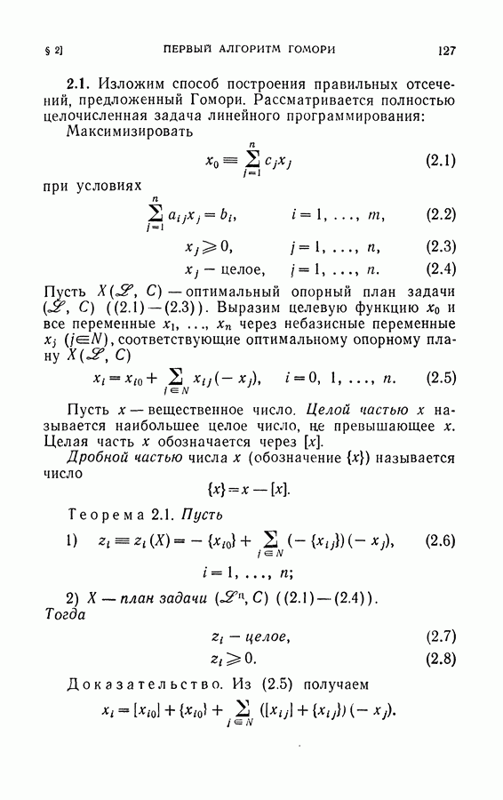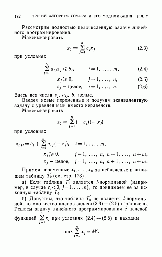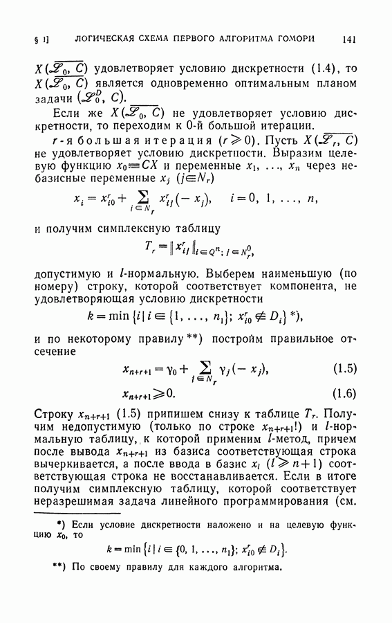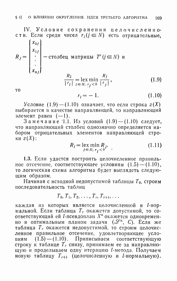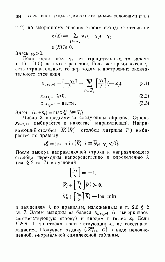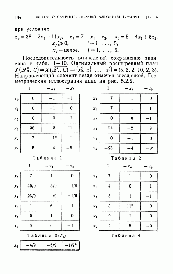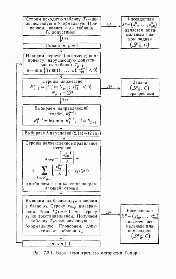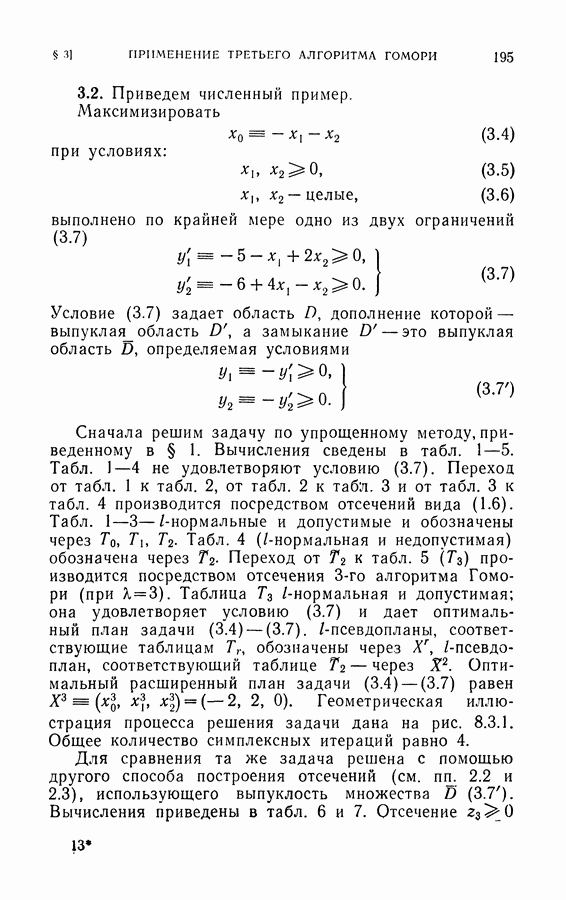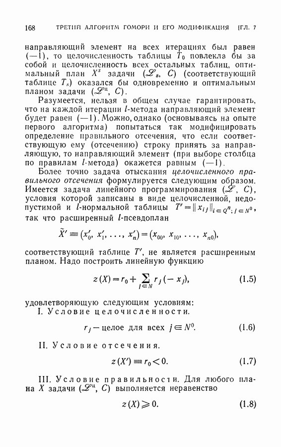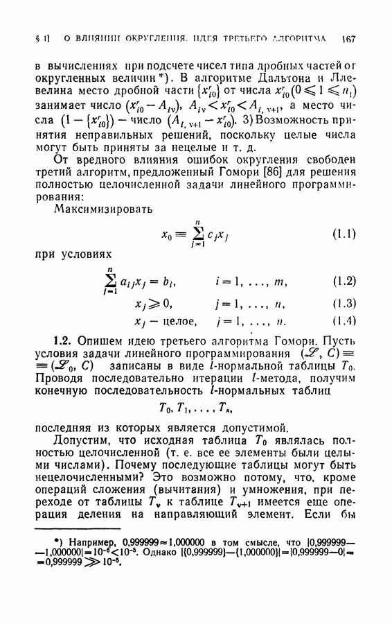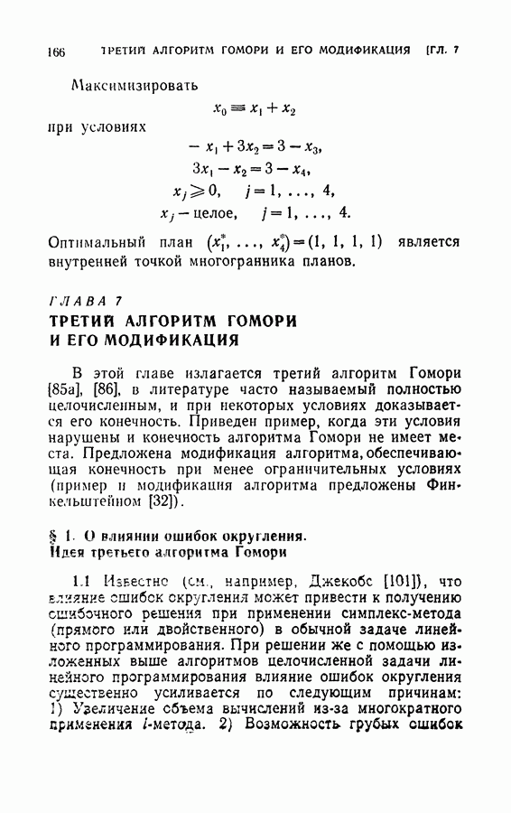 ГЛАВА 7. ТРЕТИЙ АЛГОРИТМ ГОМОРИ И ЕГО МОДИФИКАЦИЯВ этой главе излагается третий алгоритм Гомори [85а], [86], в литературе часто называемый полностью целочисленным, и при некоторых условиях доказывается его конечность. Приведен пример, когда эти условия нарушены и конечность алгоритма Гомори не имеет места. Предложена модификация алгоритма, обеспечивающая конечность при менее ограничительных условиях (пример и модификация алгоритма предложены Финкельштейном [32]). § 1 О влиянии ошибок округления. Идея третьего алгоритма Гомори1.1. Известно (см., например, Джекобе [101]), что влияние ошибок округления может привести к получению ошибочного решения при применении симплекс-метода (прямого или двойственного) в обычной задаче линейного программирования. При решении же с помощью изложенных выше алгоритмов целочисленной задачи линейного программирования влияние ошибок округления существенно усиливается по следующим причинам: 1) Увеличение объема вычислений из-за многократного применения в вычислениях при подсчете чисел типа дробных частей от округленных величин. В алгоритме Дальтона и Ллевелина место дробной части От вредного влияния ошибок округления свободен третий алгоритм, предложенный Гомори [86] для решения полностью целочисленной задачи линейного программирования: Максимизировать