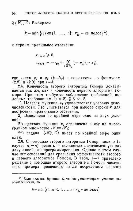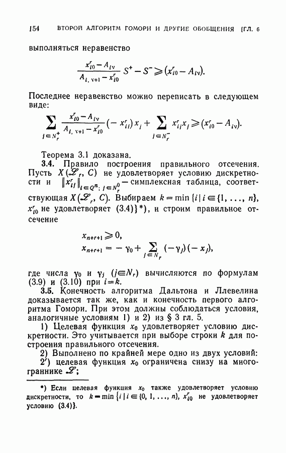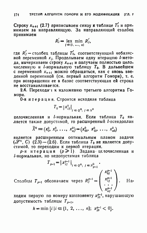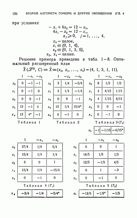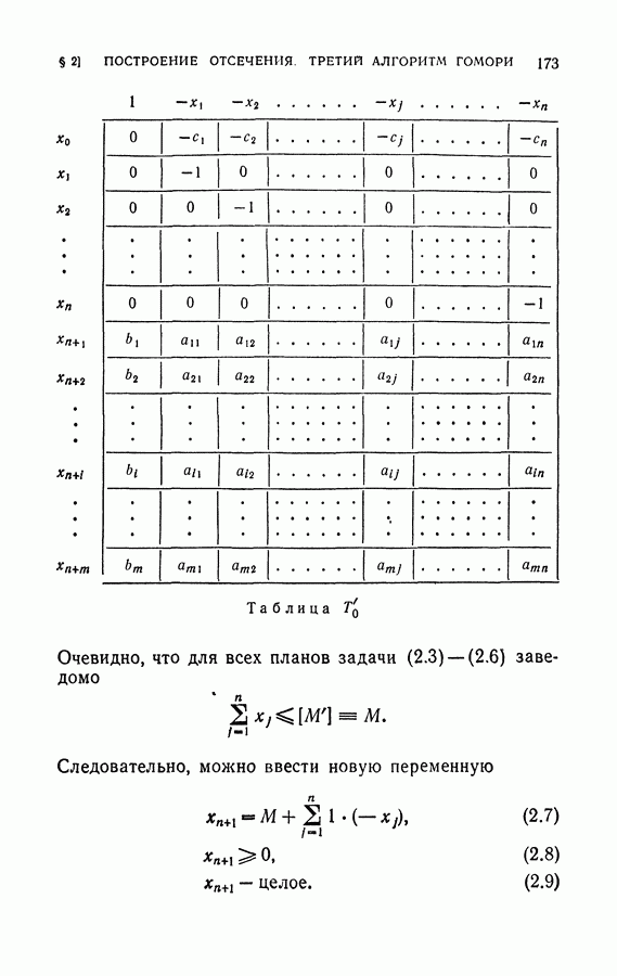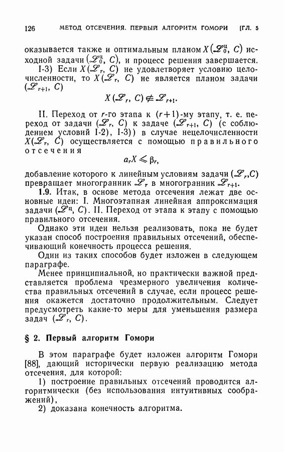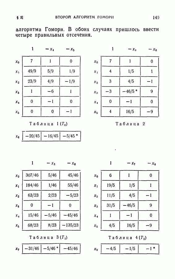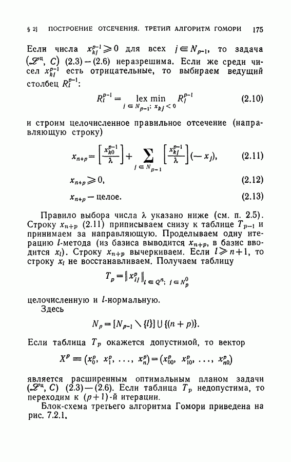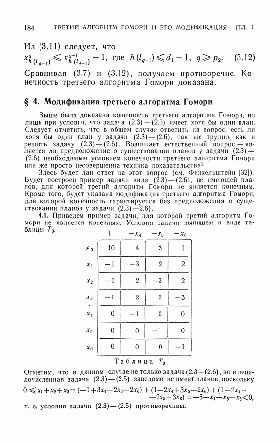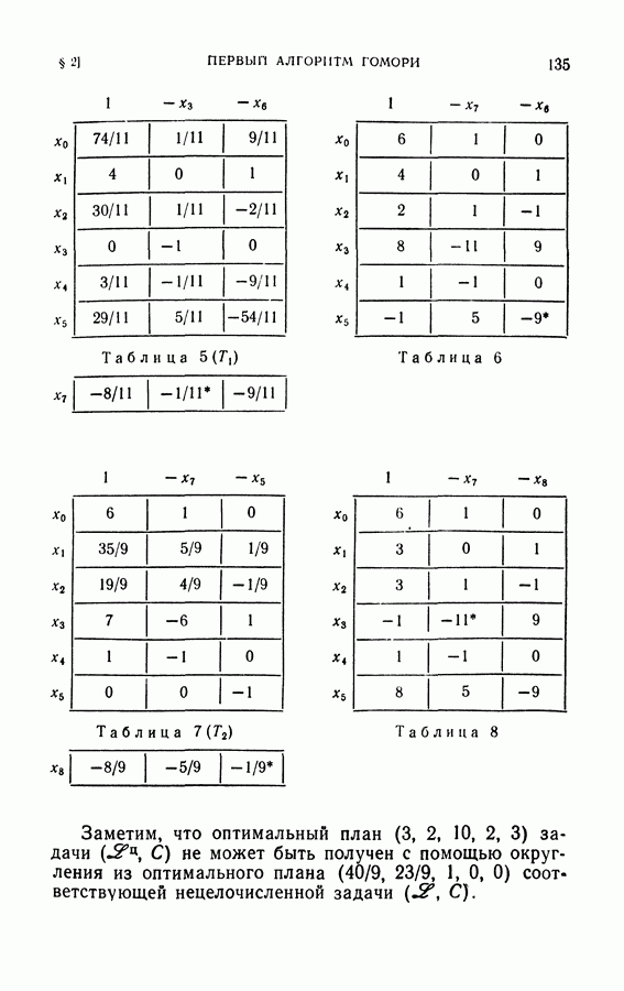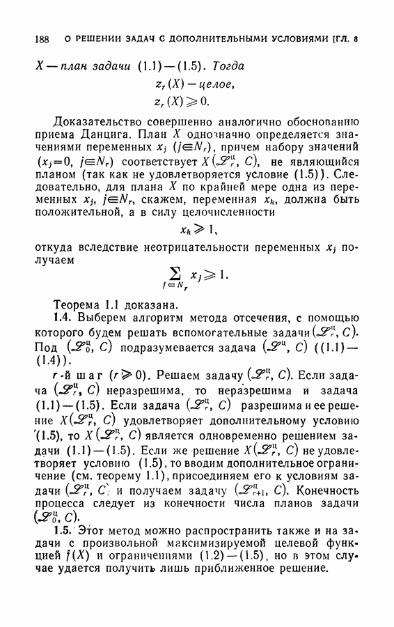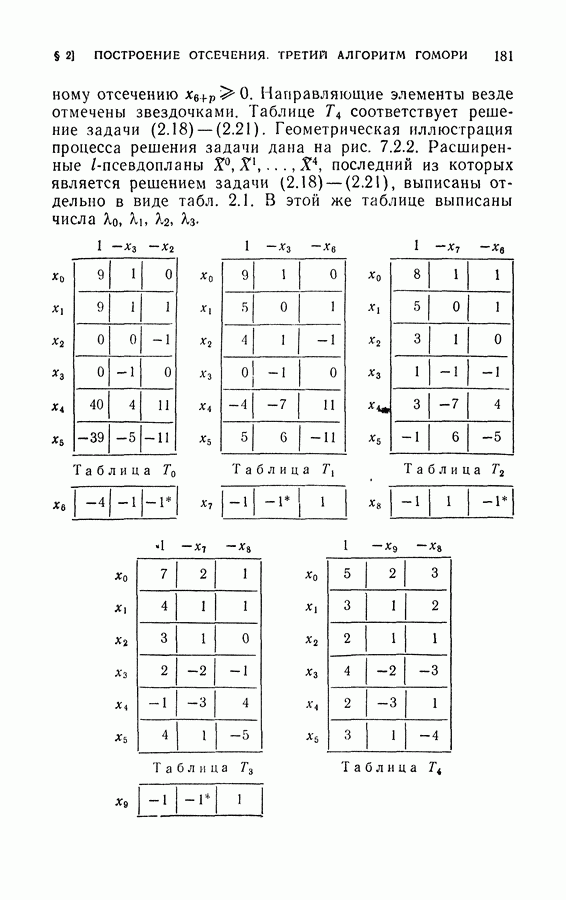 ГЛАВА 7. ТРЕТИЙ АЛГОРИТМ ГОМОРИ И ЕГО МОДИФИКАЦИЯВ этой главе излагается третий алгоритм Гомори [85а], [86], в литературе часто называемый полностью целочисленным, и при некоторых условиях доказывается его конечность. Приведен пример, когда эти условия нарушены и конечность алгоритма Гомори не имеет места. Предложена модификация алгоритма, обеспечивающая конечность при менее ограничительных условиях (пример и модификация алгоритма предложены Финкельштейном [32]). § 1 О влиянии ошибок округления. Идея третьего алгоритма Гомори1.1. Известно (см., например, Джекобе [101]), что влияние ошибок округления может привести к получению ошибочного решения при применении симплекс-метода (прямого или двойственного) в обычной задаче линейного программирования. При решении же с помощью изложенных выше алгоритмов целочисленной задачи линейного программирования влияние ошибок округления существенно усиливается по следующим причинам: 1) Увеличение объема вычислений из-за многократного применения в вычислениях при подсчете чисел типа дробных частей от округленных величин. В алгоритме Дальтона и Ллевелина место дробной части От вредного влияния ошибок округления свободен третий алгоритм, предложенный Гомори [86] для решения полностью целочисленной задачи линейного программирования: Максимизировать