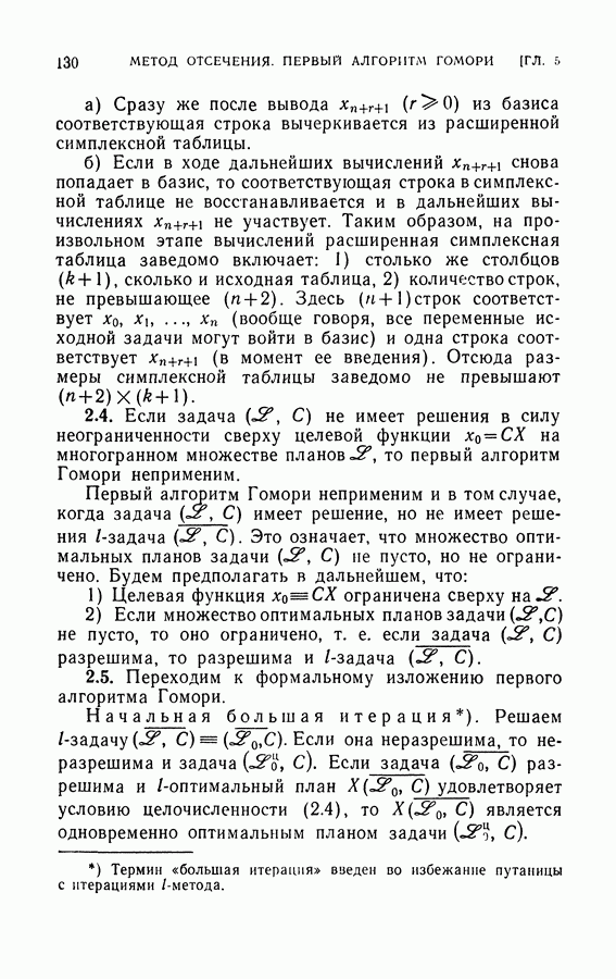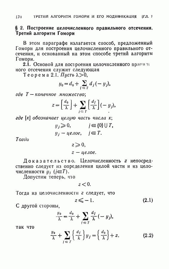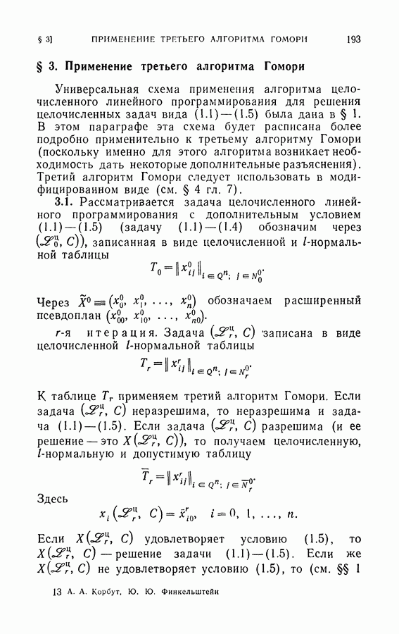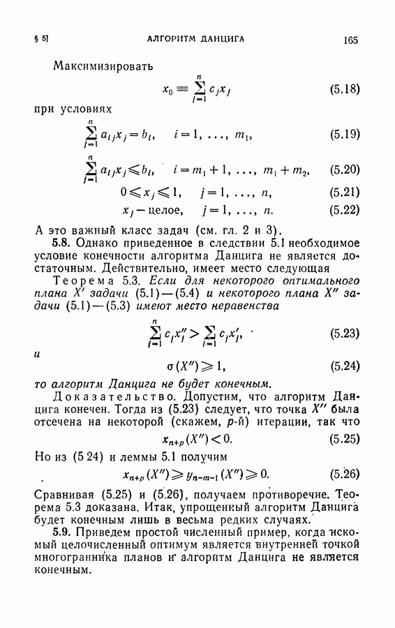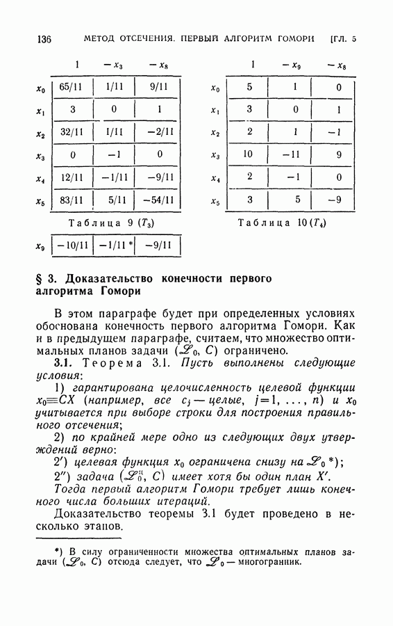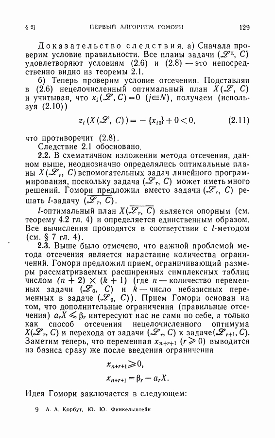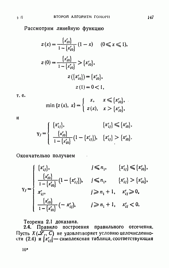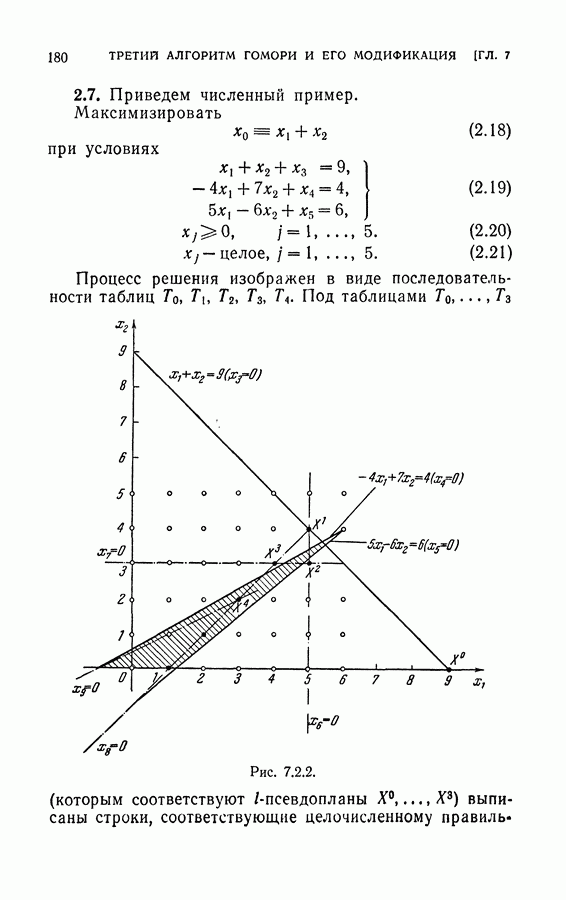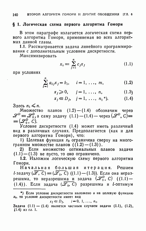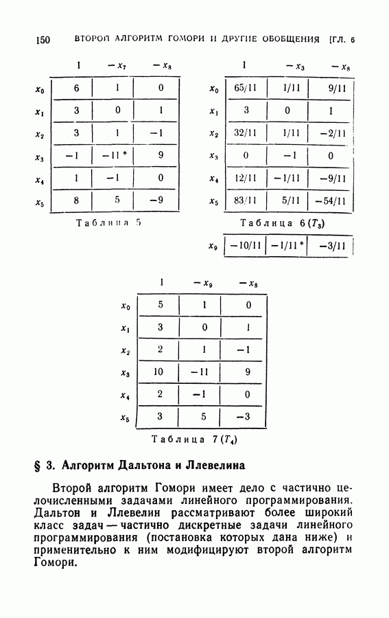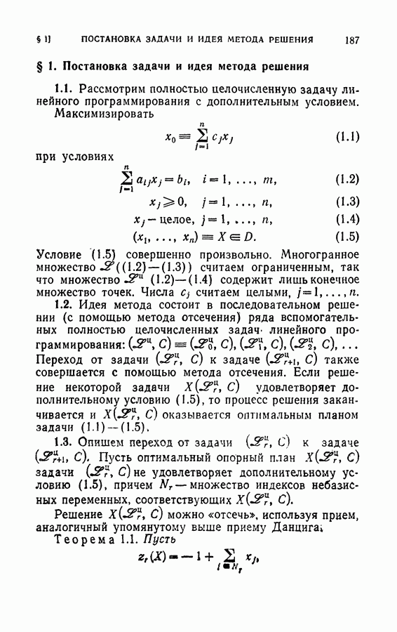 ГЛАВА 7. ТРЕТИЙ АЛГОРИТМ ГОМОРИ И ЕГО МОДИФИКАЦИЯВ этой главе излагается третий алгоритм Гомори [85а], [86], в литературе часто называемый полностью целочисленным, и при некоторых условиях доказывается его конечность. Приведен пример, когда эти условия нарушены и конечность алгоритма Гомори не имеет места. Предложена модификация алгоритма, обеспечивающая конечность при менее ограничительных условиях (пример и модификация алгоритма предложены Финкельштейном [32]). § 1 О влиянии ошибок округления. Идея третьего алгоритма Гомори1.1. Известно (см., например, Джекобе [101]), что влияние ошибок округления может привести к получению ошибочного решения при применении симплекс-метода (прямого или двойственного) в обычной задаче линейного программирования. При решении же с помощью изложенных выше алгоритмов целочисленной задачи линейного программирования влияние ошибок округления существенно усиливается по следующим причинам: 1) Увеличение объема вычислений из-за многократного применения в вычислениях при подсчете чисел типа дробных частей от округленных величин. В алгоритме Дальтона и Ллевелина место дробной части От вредного влияния ошибок округления свободен третий алгоритм, предложенный Гомори [86] для решения полностью целочисленной задачи линейного программирования: Максимизировать