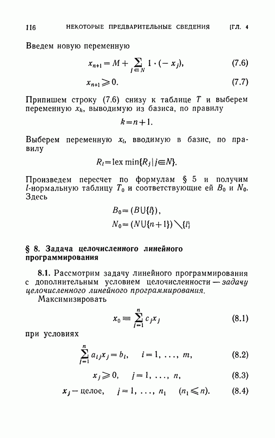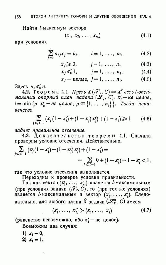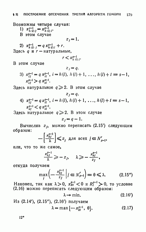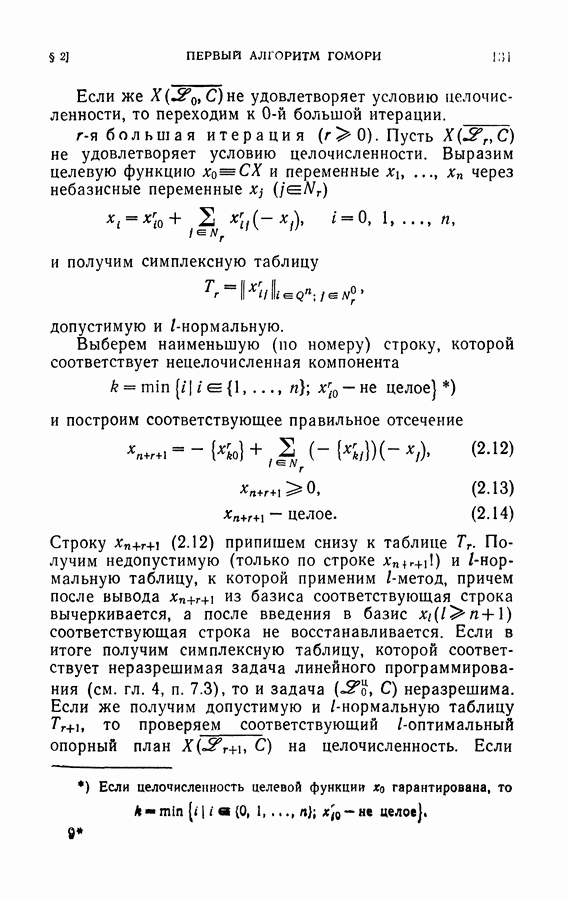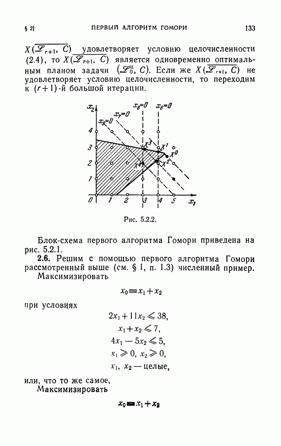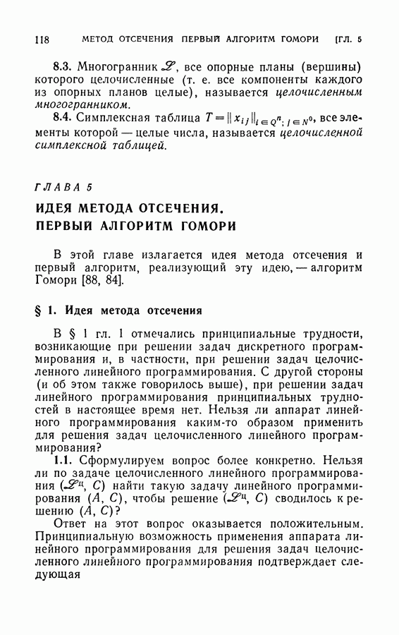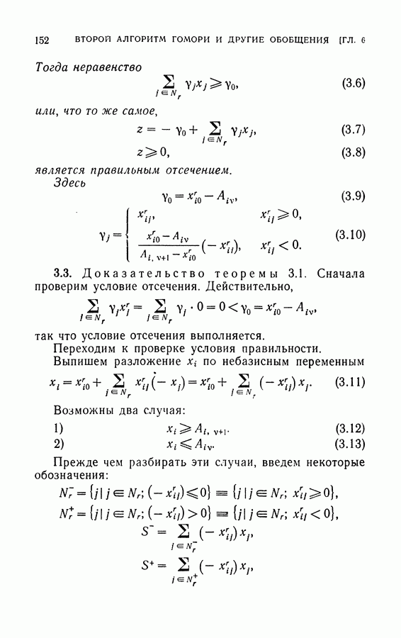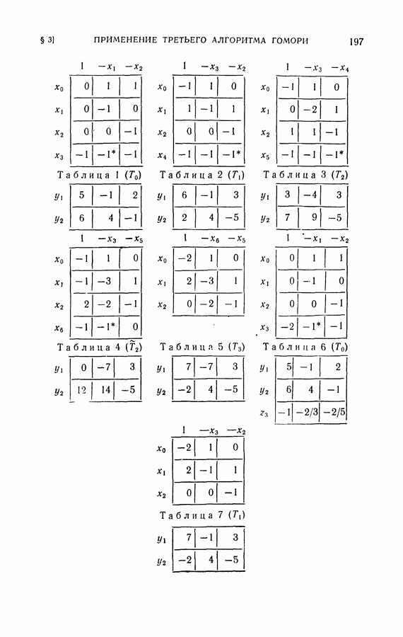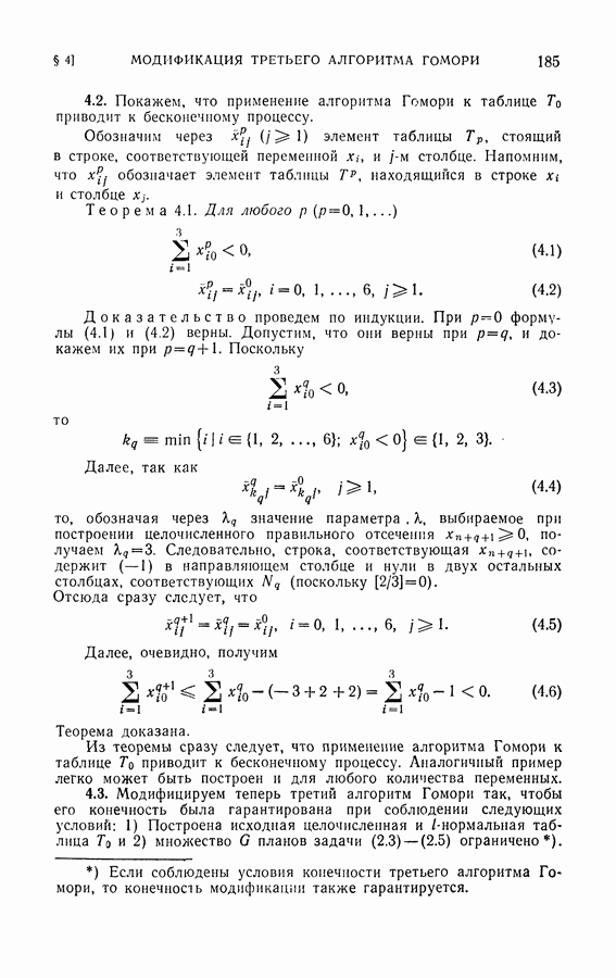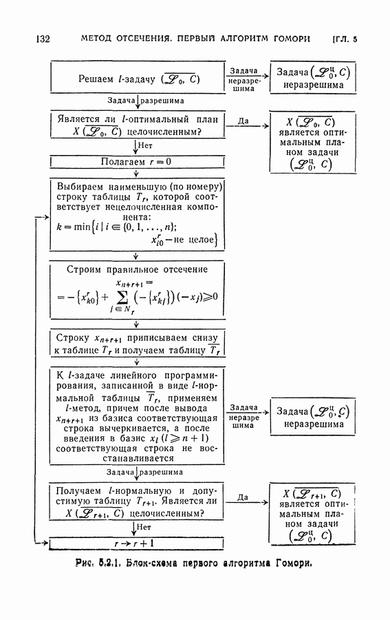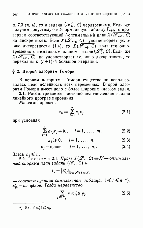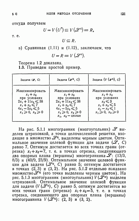 ГЛАВА 7. ТРЕТИЙ АЛГОРИТМ ГОМОРИ И ЕГО МОДИФИКАЦИЯВ этой главе излагается третий алгоритм Гомори [85а], [86], в литературе часто называемый полностью целочисленным, и при некоторых условиях доказывается его конечность. Приведен пример, когда эти условия нарушены и конечность алгоритма Гомори не имеет места. Предложена модификация алгоритма, обеспечивающая конечность при менее ограничительных условиях (пример и модификация алгоритма предложены Финкельштейном [32]). § 1 О влиянии ошибок округления. Идея третьего алгоритма Гомори1.1. Известно (см., например, Джекобе [101]), что влияние ошибок округления может привести к получению ошибочного решения при применении симплекс-метода (прямого или двойственного) в обычной задаче линейного программирования. При решении же с помощью изложенных выше алгоритмов целочисленной задачи линейного программирования влияние ошибок округления существенно усиливается по следующим причинам: 1) Увеличение объема вычислений из-за многократного применения в вычислениях при подсчете чисел типа дробных частей от округленных величин. В алгоритме Дальтона и Ллевелина место дробной части От вредного влияния ошибок округления свободен третий алгоритм, предложенный Гомори [86] для решения полностью целочисленной задачи линейного программирования: Максимизировать