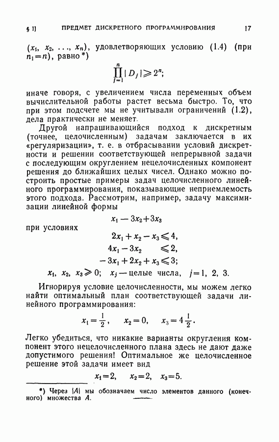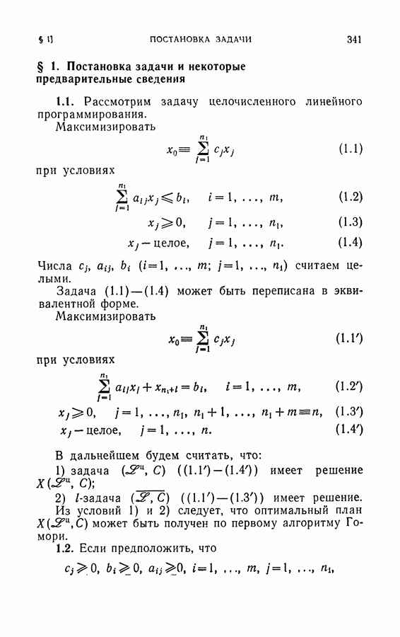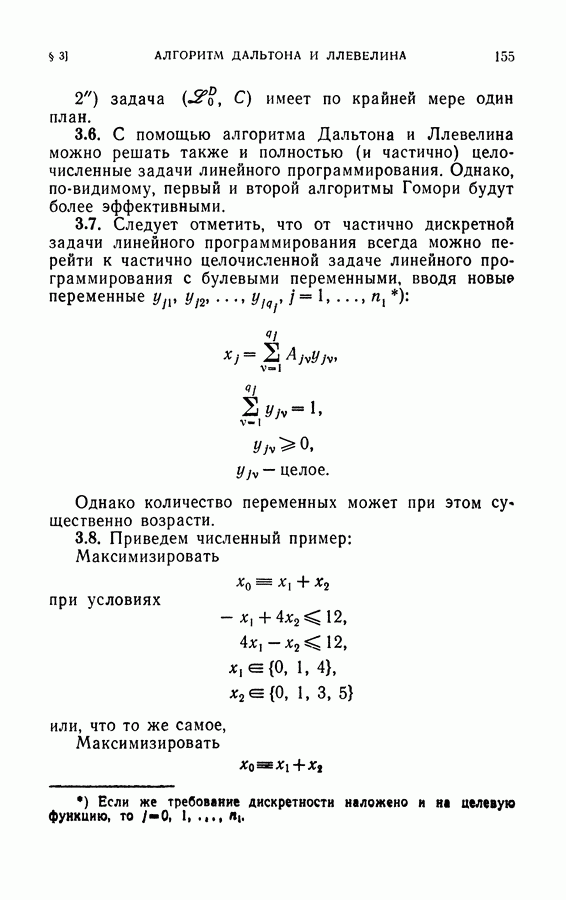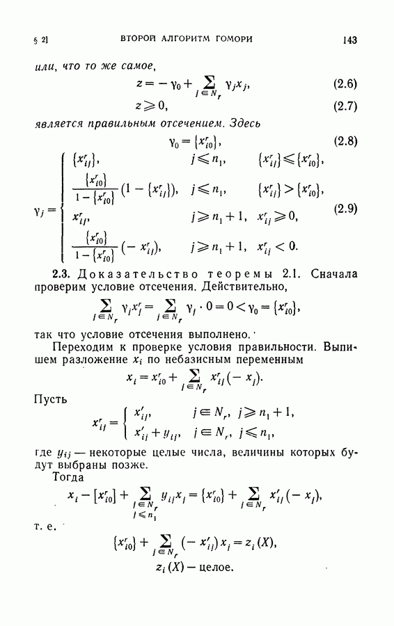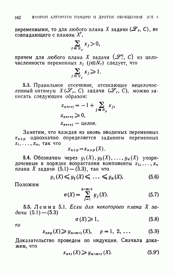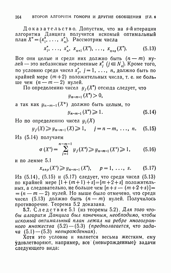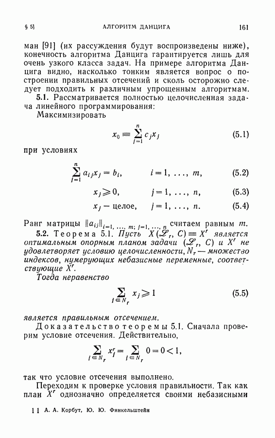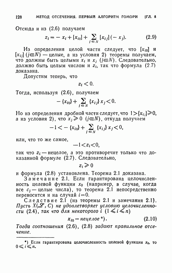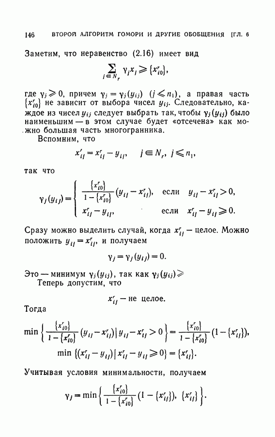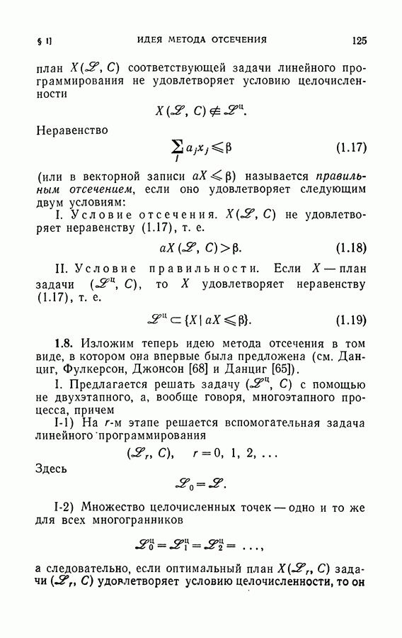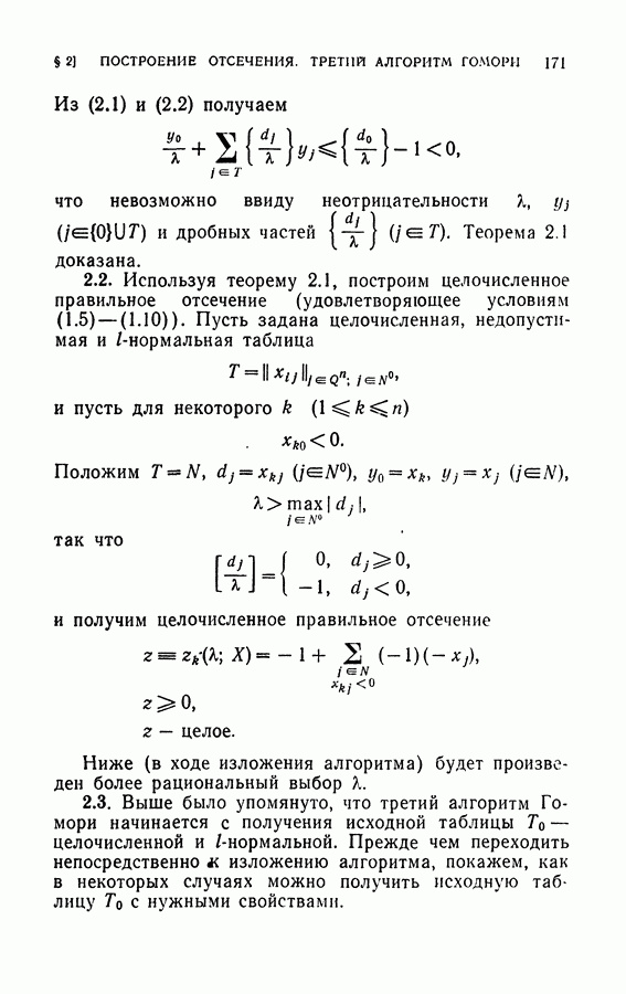 ГЛАВА 7. ТРЕТИЙ АЛГОРИТМ ГОМОРИ И ЕГО МОДИФИКАЦИЯВ этой главе излагается третий алгоритм Гомори [85а], [86], в литературе часто называемый полностью целочисленным, и при некоторых условиях доказывается его конечность. Приведен пример, когда эти условия нарушены и конечность алгоритма Гомори не имеет места. Предложена модификация алгоритма, обеспечивающая конечность при менее ограничительных условиях (пример и модификация алгоритма предложены Финкельштейном [32]). § 1 О влиянии ошибок округления. Идея третьего алгоритма Гомори1.1. Известно (см., например, Джекобе [101]), что влияние ошибок округления может привести к получению ошибочного решения при применении симплекс-метода (прямого или двойственного) в обычной задаче линейного программирования. При решении же с помощью изложенных выше алгоритмов целочисленной задачи линейного программирования влияние ошибок округления существенно усиливается по следующим причинам: 1) Увеличение объема вычислений из-за многократного применения в вычислениях при подсчете чисел типа дробных частей от округленных величин. В алгоритме Дальтона и Ллевелина место дробной части От вредного влияния ошибок округления свободен третий алгоритм, предложенный Гомори [86] для решения полностью целочисленной задачи линейного программирования: Максимизировать