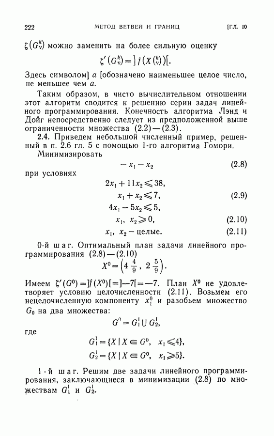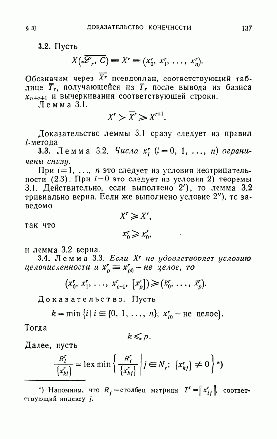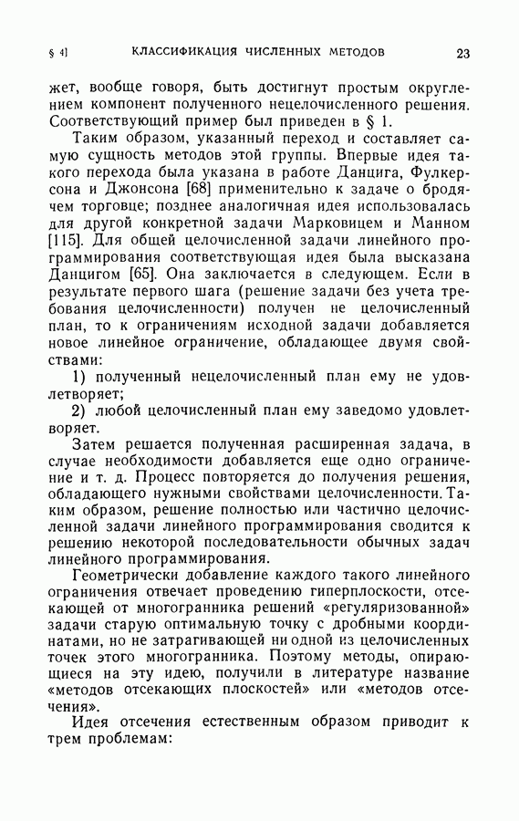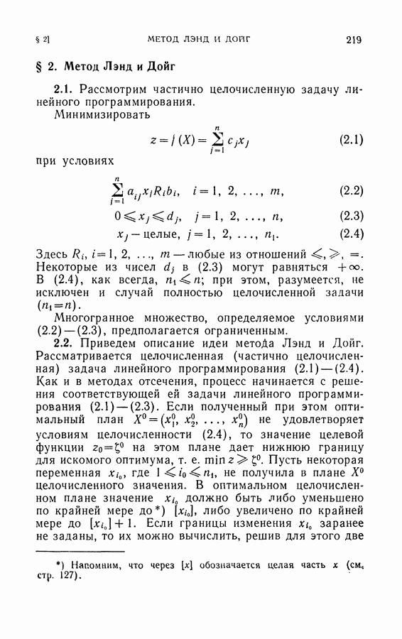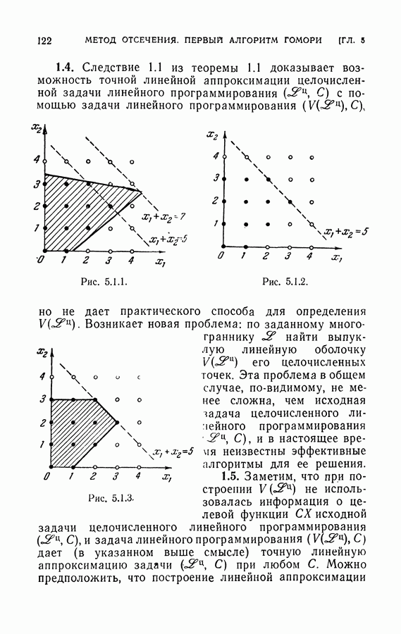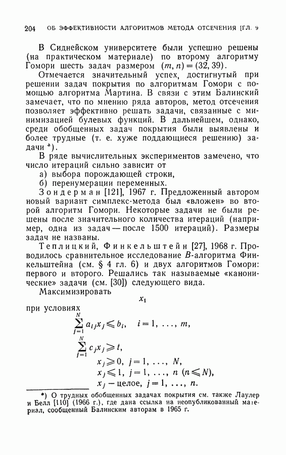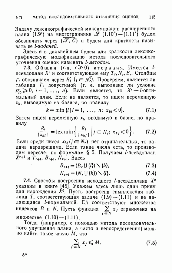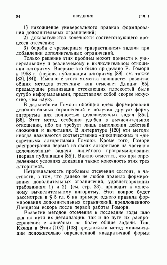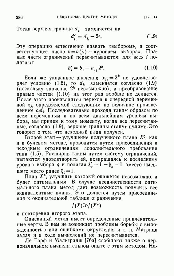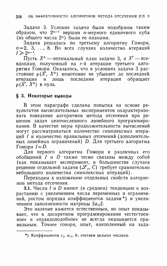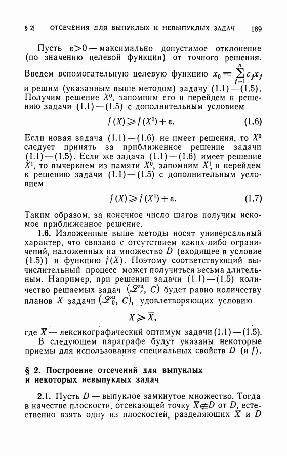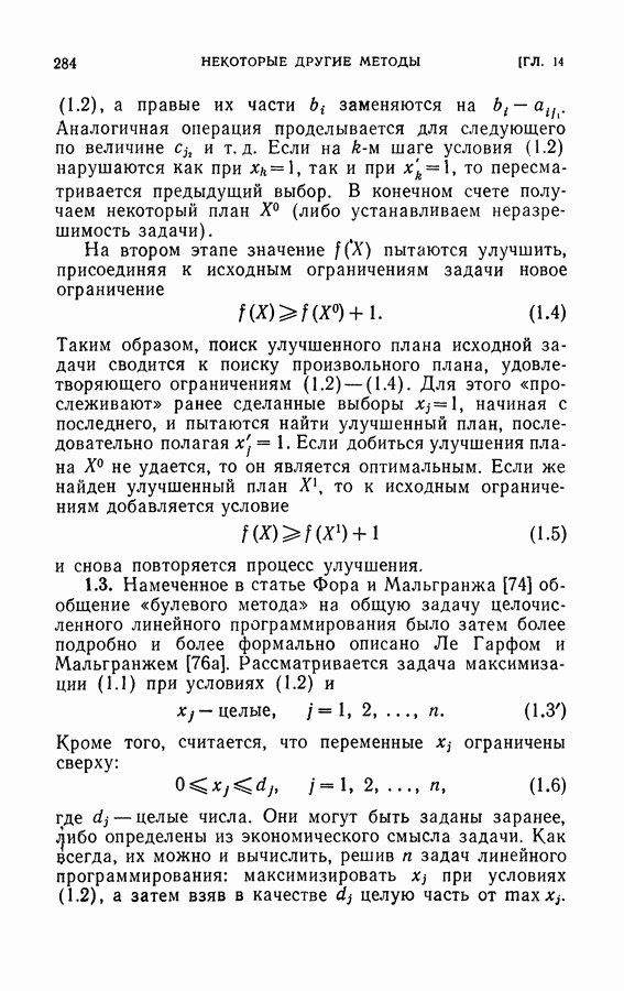 ГЛАВА 7. ТРЕТИЙ АЛГОРИТМ ГОМОРИ И ЕГО МОДИФИКАЦИЯВ этой главе излагается третий алгоритм Гомори [85а], [86], в литературе часто называемый полностью целочисленным, и при некоторых условиях доказывается его конечность. Приведен пример, когда эти условия нарушены и конечность алгоритма Гомори не имеет места. Предложена модификация алгоритма, обеспечивающая конечность при менее ограничительных условиях (пример и модификация алгоритма предложены Финкельштейном [32]). § 1 О влиянии ошибок округления. Идея третьего алгоритма Гомори1.1. Известно (см., например, Джекобе [101]), что влияние ошибок округления может привести к получению ошибочного решения при применении симплекс-метода (прямого или двойственного) в обычной задаче линейного программирования. При решении же с помощью изложенных выше алгоритмов целочисленной задачи линейного программирования влияние ошибок округления существенно усиливается по следующим причинам: 1) Увеличение объема вычислений из-за многократного применения в вычислениях при подсчете чисел типа дробных частей от округленных величин. В алгоритме Дальтона и Ллевелина место дробной части От вредного влияния ошибок округления свободен третий алгоритм, предложенный Гомори [86] для решения полностью целочисленной задачи линейного программирования: Максимизировать
