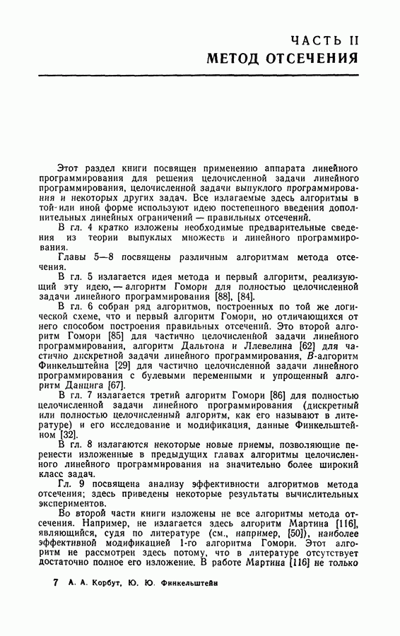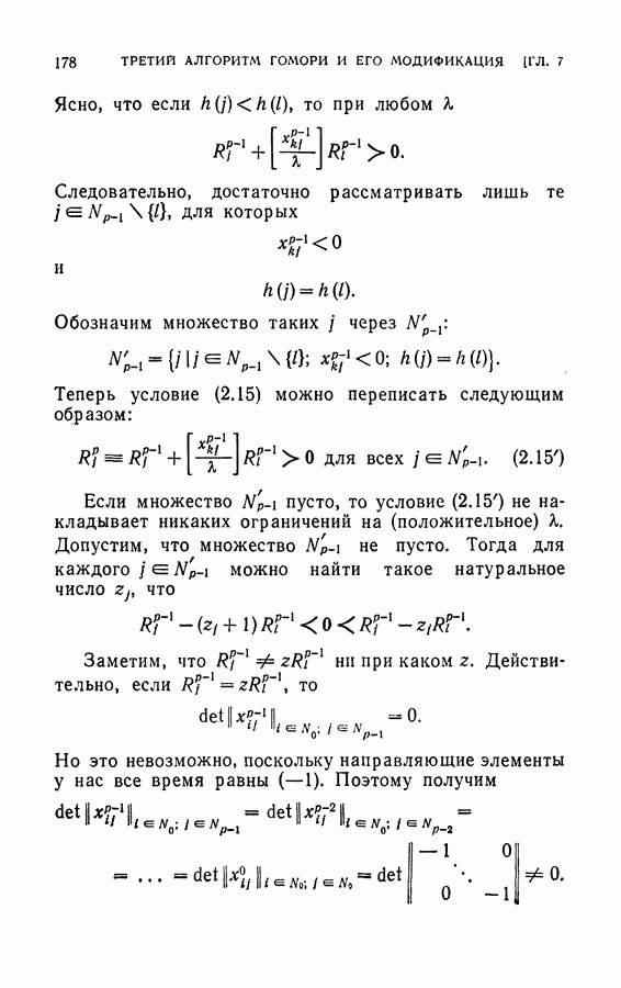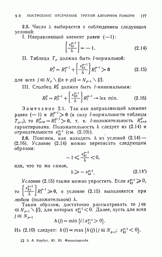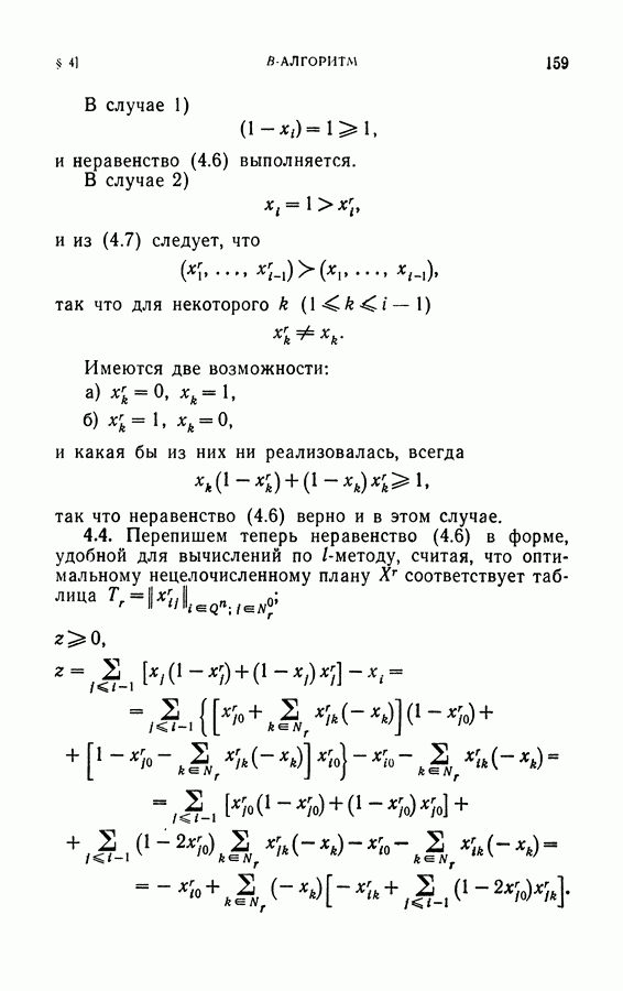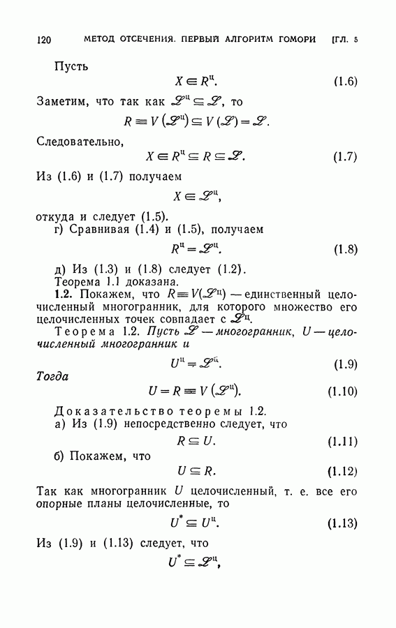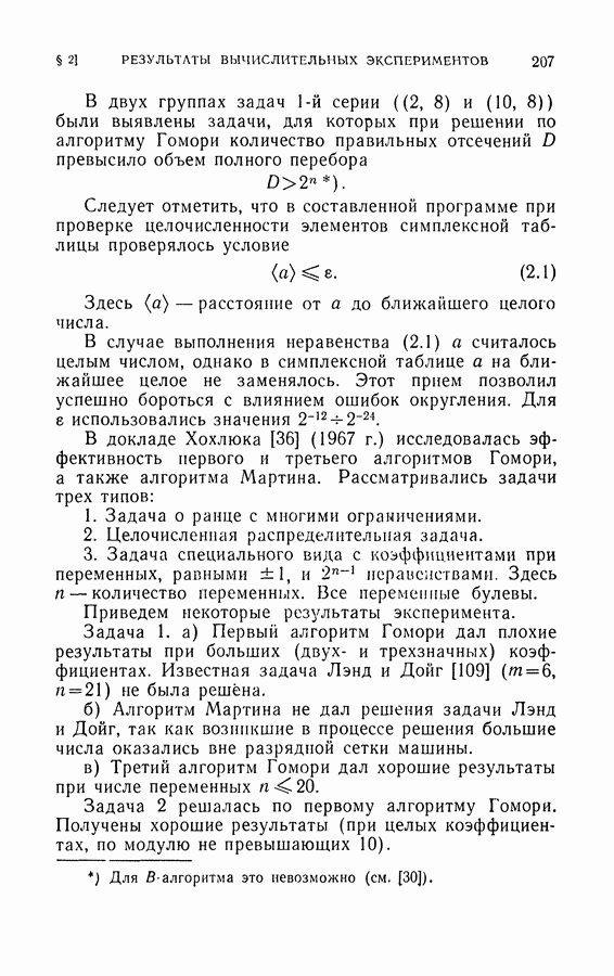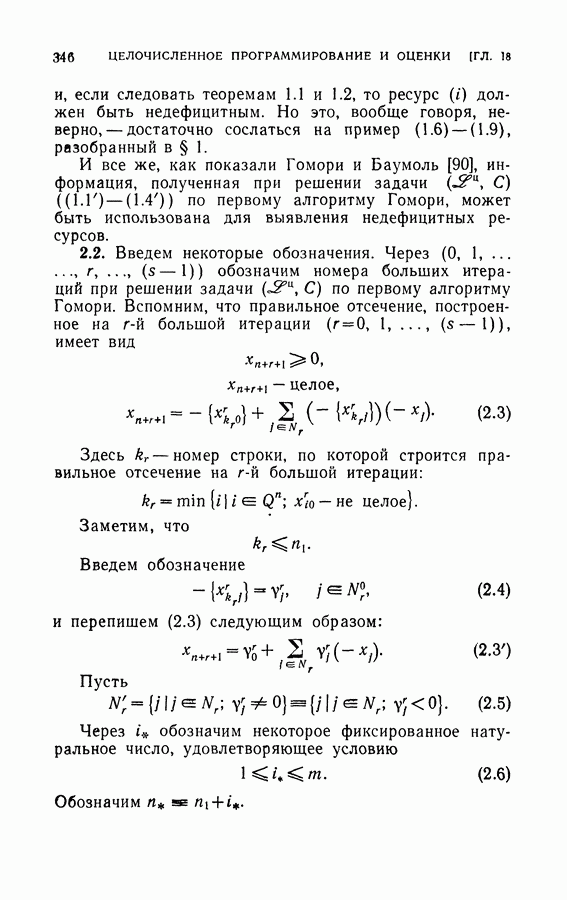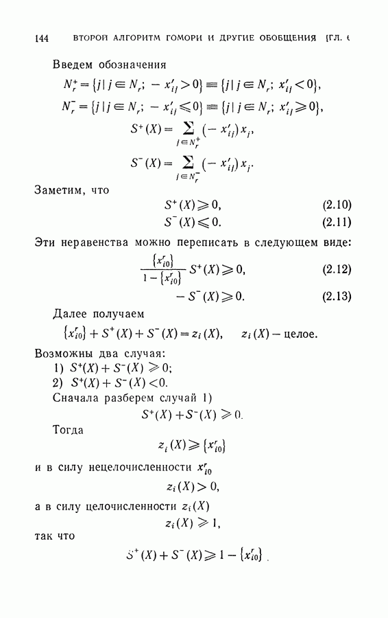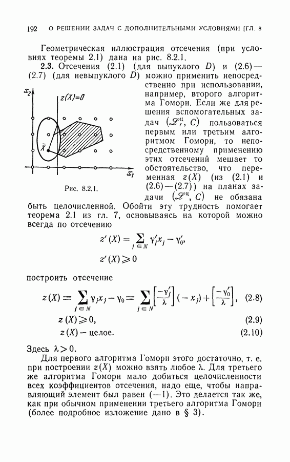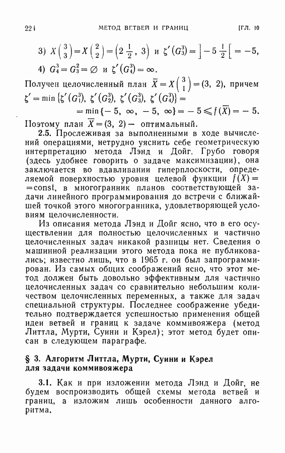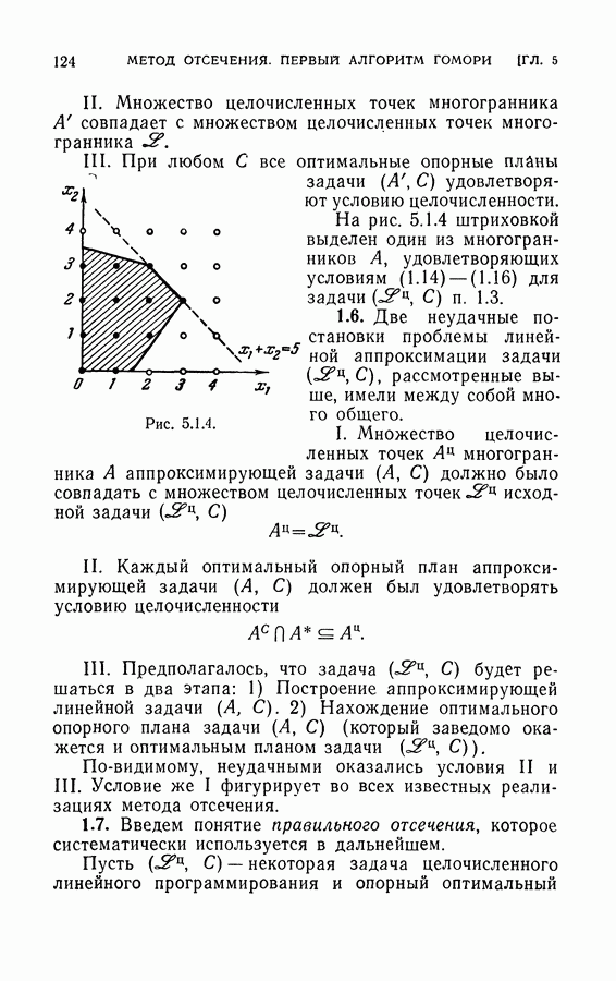 ГЛАВА 7. ТРЕТИЙ АЛГОРИТМ ГОМОРИ И ЕГО МОДИФИКАЦИЯВ этой главе излагается третий алгоритм Гомори [85а], [86], в литературе часто называемый полностью целочисленным, и при некоторых условиях доказывается его конечность. Приведен пример, когда эти условия нарушены и конечность алгоритма Гомори не имеет места. Предложена модификация алгоритма, обеспечивающая конечность при менее ограничительных условиях (пример и модификация алгоритма предложены Финкельштейном [32]). § 1 О влиянии ошибок округления. Идея третьего алгоритма Гомори1.1. Известно (см., например, Джекобе [101]), что влияние ошибок округления может привести к получению ошибочного решения при применении симплекс-метода (прямого или двойственного) в обычной задаче линейного программирования. При решении же с помощью изложенных выше алгоритмов целочисленной задачи линейного программирования влияние ошибок округления существенно усиливается по следующим причинам: 1) Увеличение объема вычислений из-за многократного применения в вычислениях при подсчете чисел типа дробных частей от округленных величин. В алгоритме Дальтона и Ллевелина место дробной части От вредного влияния ошибок округления свободен третий алгоритм, предложенный Гомори [86] для решения полностью целочисленной задачи линейного программирования: Максимизировать