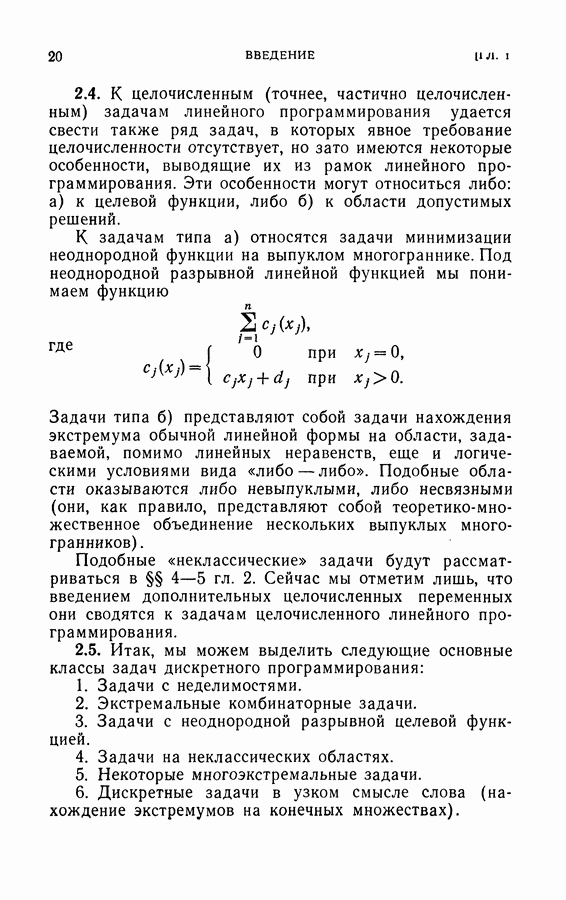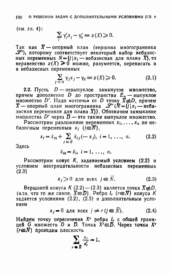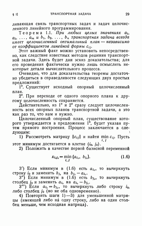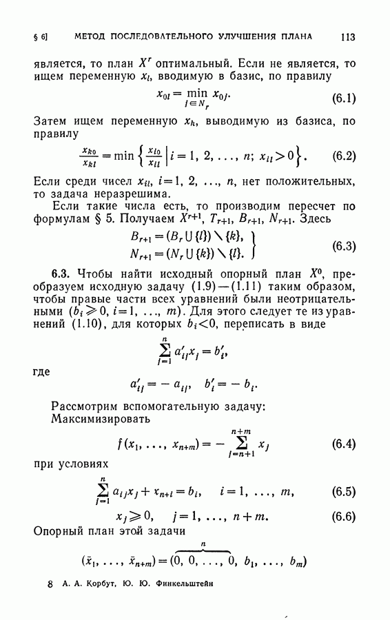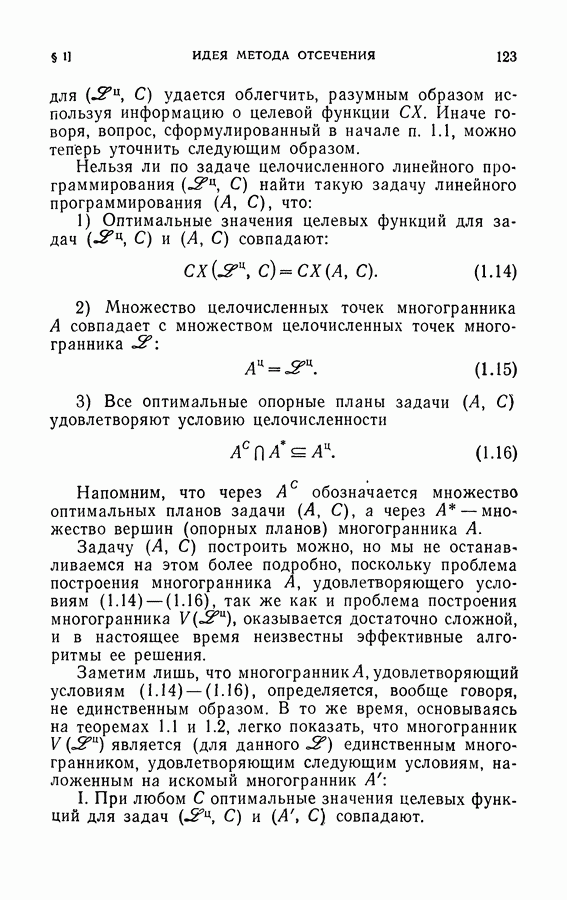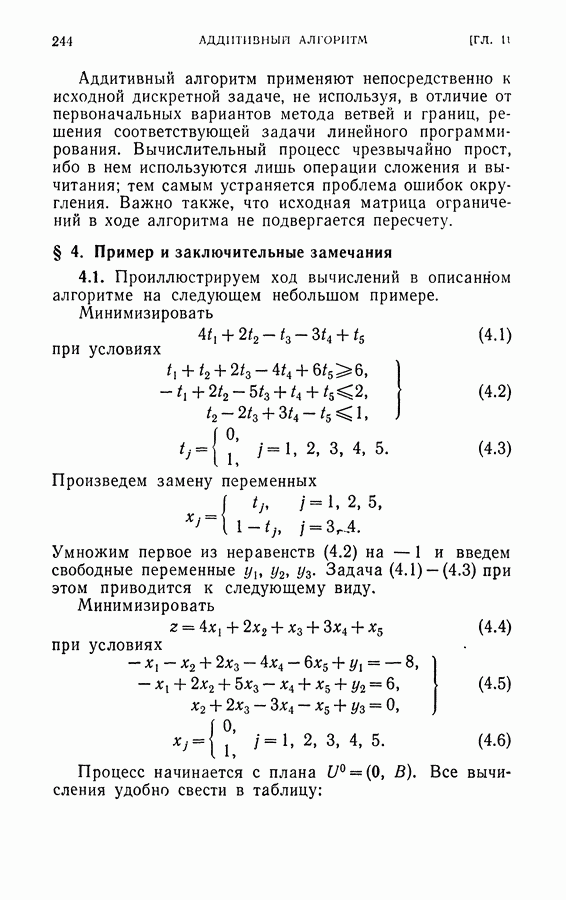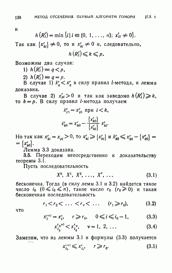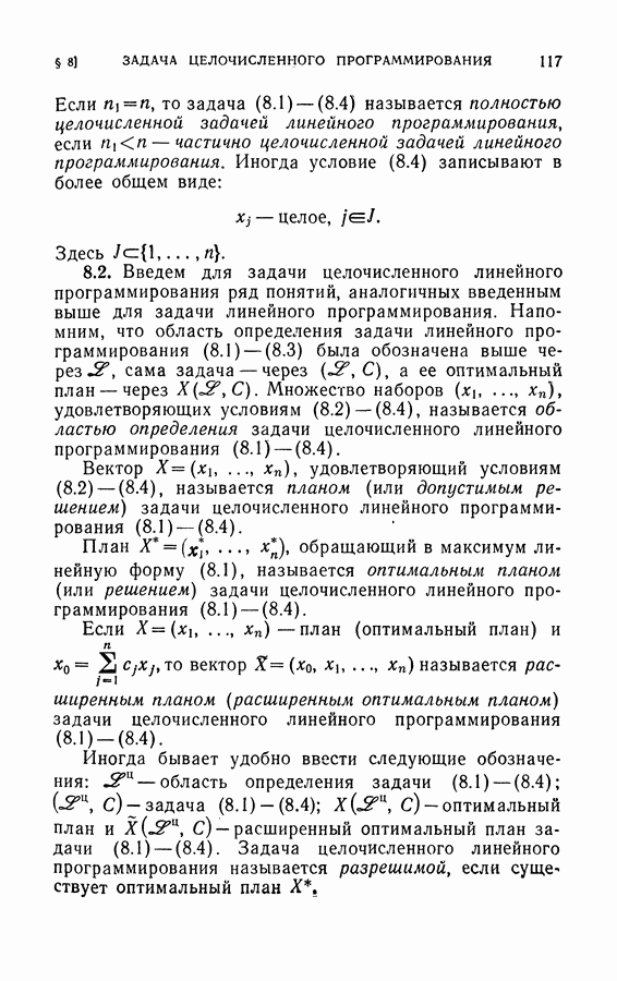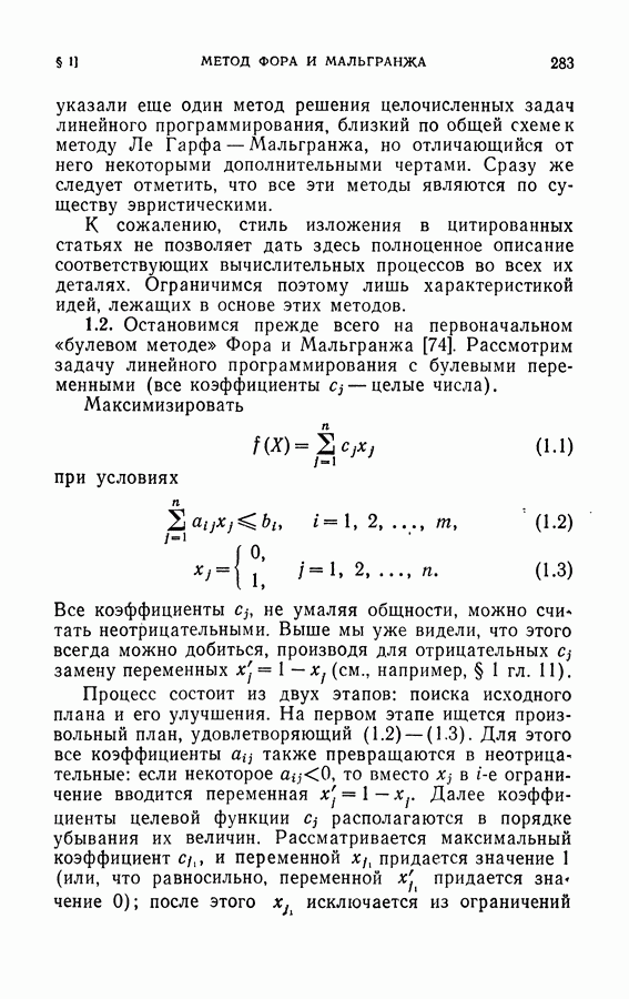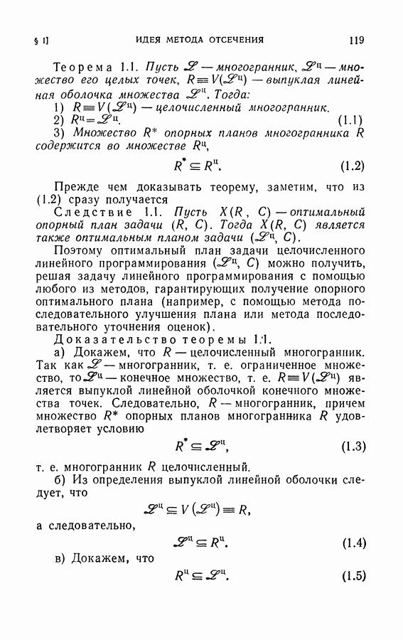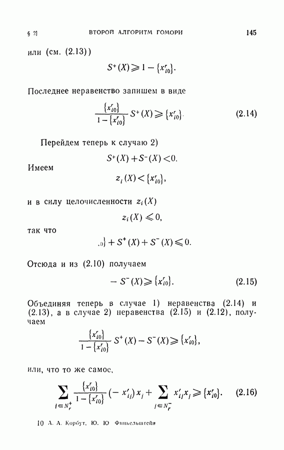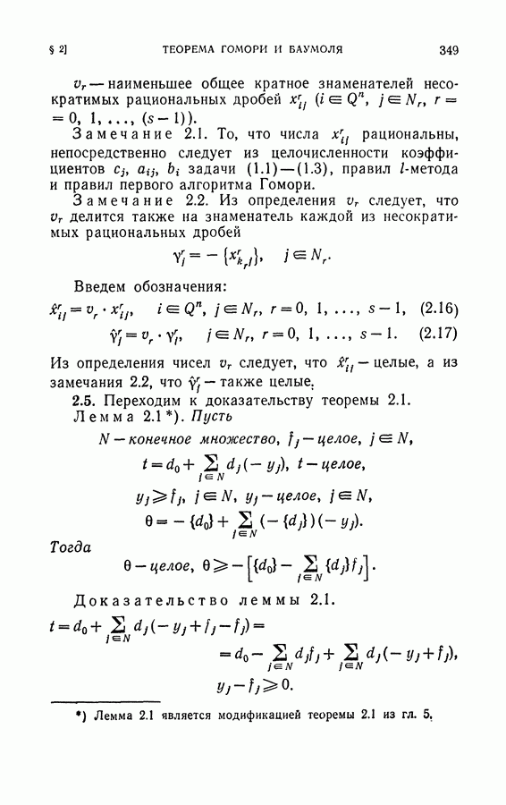 ГЛАВА 7. ТРЕТИЙ АЛГОРИТМ ГОМОРИ И ЕГО МОДИФИКАЦИЯВ этой главе излагается третий алгоритм Гомори [85а], [86], в литературе часто называемый полностью целочисленным, и при некоторых условиях доказывается его конечность. Приведен пример, когда эти условия нарушены и конечность алгоритма Гомори не имеет места. Предложена модификация алгоритма, обеспечивающая конечность при менее ограничительных условиях (пример и модификация алгоритма предложены Финкельштейном [32]). § 1 О влиянии ошибок округления. Идея третьего алгоритма Гомори1.1. Известно (см., например, Джекобе [101]), что влияние ошибок округления может привести к получению ошибочного решения при применении симплекс-метода (прямого или двойственного) в обычной задаче линейного программирования. При решении же с помощью изложенных выше алгоритмов целочисленной задачи линейного программирования влияние ошибок округления существенно усиливается по следующим причинам: 1) Увеличение объема вычислений из-за многократного применения в вычислениях при подсчете чисел типа дробных частей от округленных величин. В алгоритме Дальтона и Ллевелина место дробной части От вредного влияния ошибок округления свободен третий алгоритм, предложенный Гомори [86] для решения полностью целочисленной задачи линейного программирования: Максимизировать