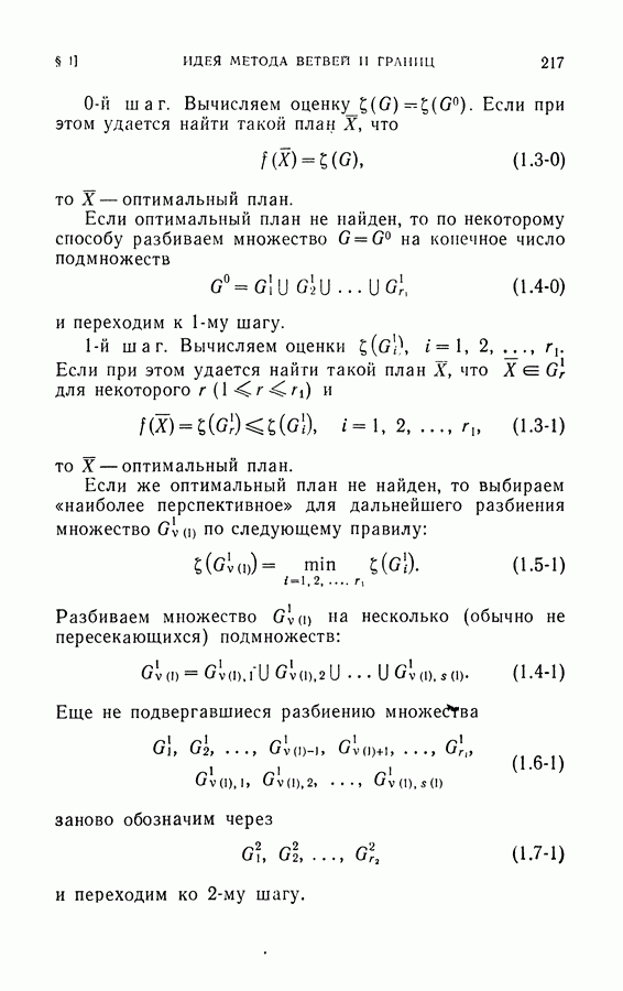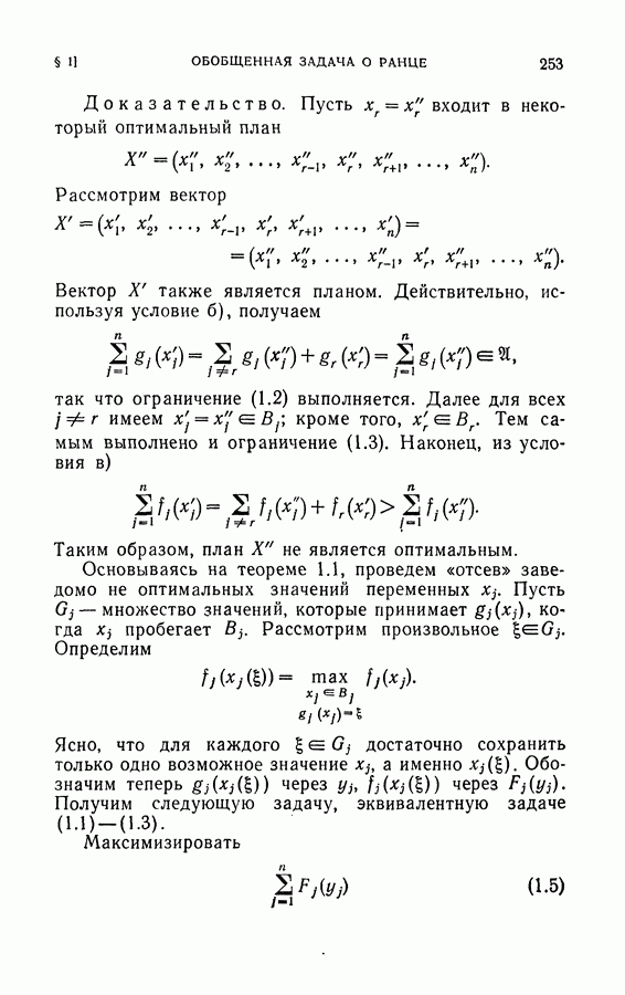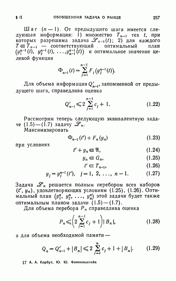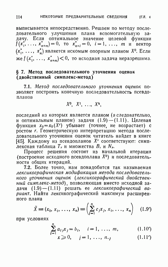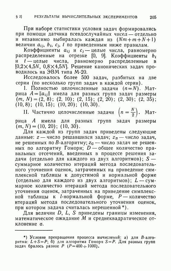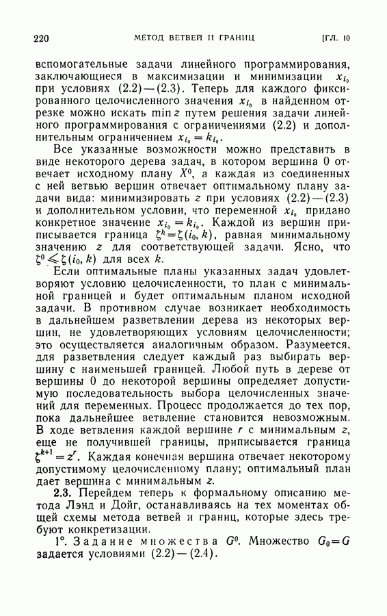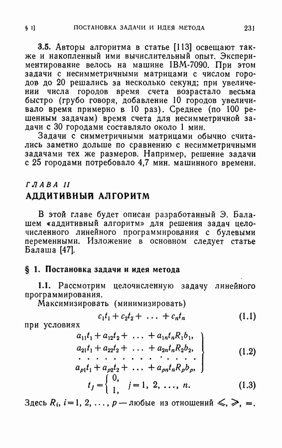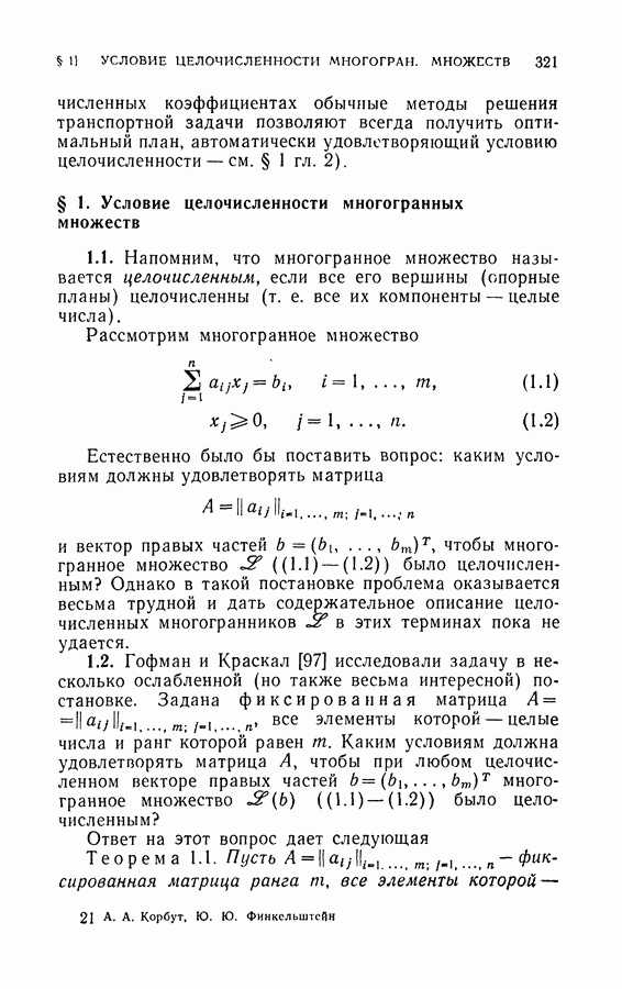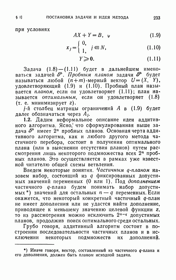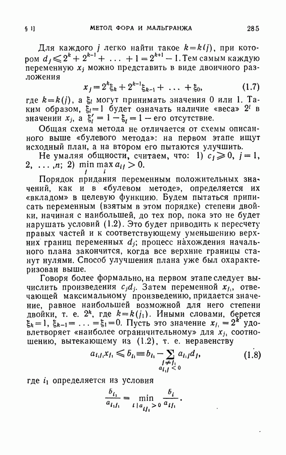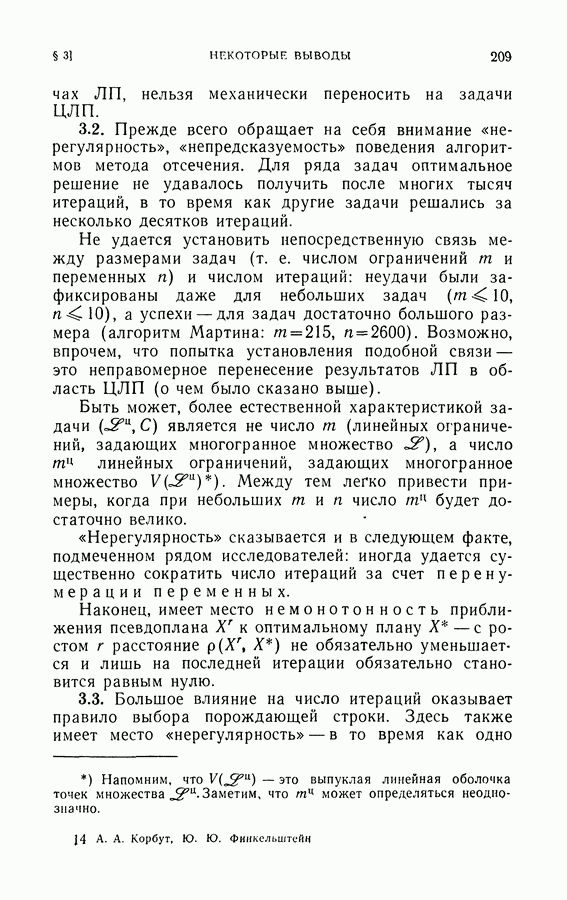 ГЛАВА 7. ТРЕТИЙ АЛГОРИТМ ГОМОРИ И ЕГО МОДИФИКАЦИЯВ этой главе излагается третий алгоритм Гомори [85а], [86], в литературе часто называемый полностью целочисленным, и при некоторых условиях доказывается его конечность. Приведен пример, когда эти условия нарушены и конечность алгоритма Гомори не имеет места. Предложена модификация алгоритма, обеспечивающая конечность при менее ограничительных условиях (пример и модификация алгоритма предложены Финкельштейном [32]). § 1 О влиянии ошибок округления. Идея третьего алгоритма Гомори1.1. Известно (см., например, Джекобе [101]), что влияние ошибок округления может привести к получению ошибочного решения при применении симплекс-метода (прямого или двойственного) в обычной задаче линейного программирования. При решении же с помощью изложенных выше алгоритмов целочисленной задачи линейного программирования влияние ошибок округления существенно усиливается по следующим причинам: 1) Увеличение объема вычислений из-за многократного применения в вычислениях при подсчете чисел типа дробных частей от округленных величин. В алгоритме Дальтона и Ллевелина место дробной части От вредного влияния ошибок округления свободен третий алгоритм, предложенный Гомори [86] для решения полностью целочисленной задачи линейного программирования: Максимизировать