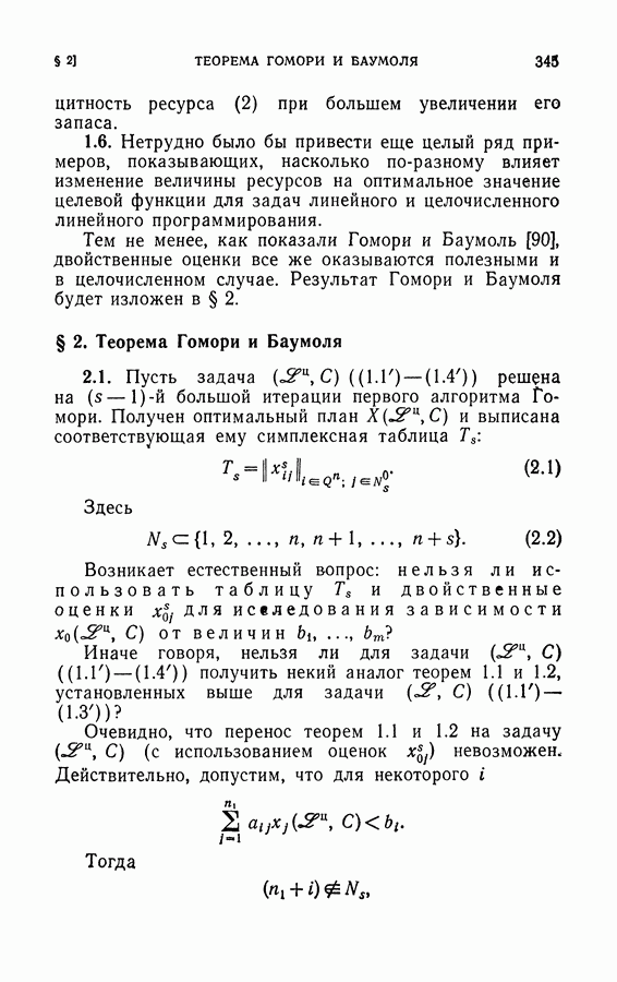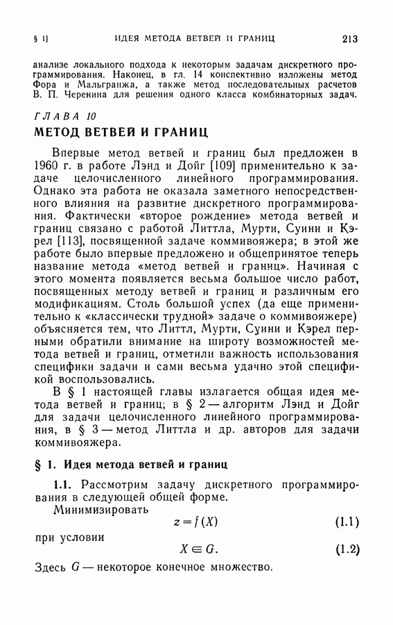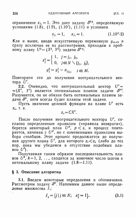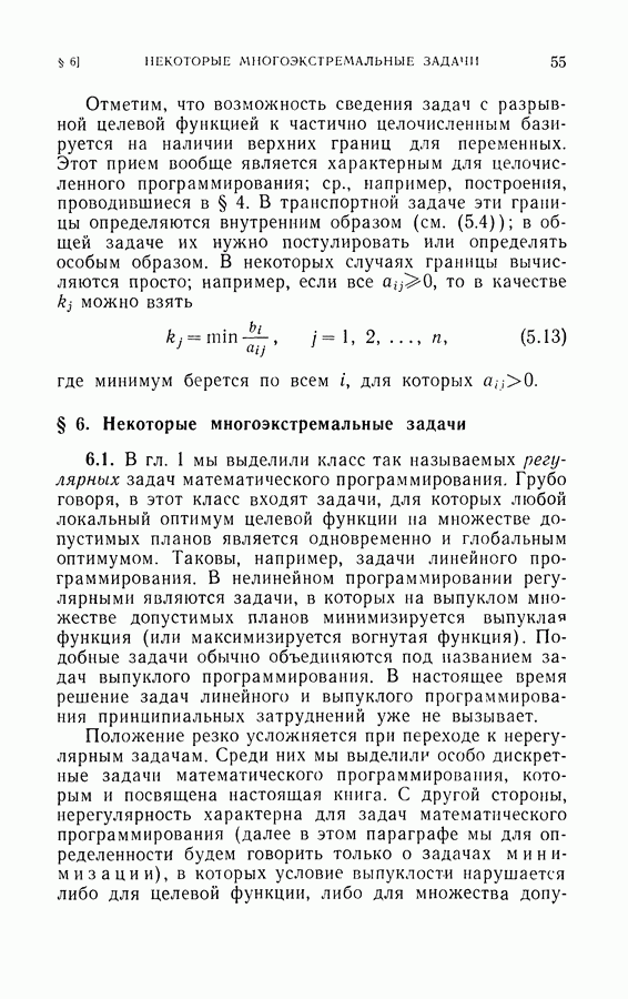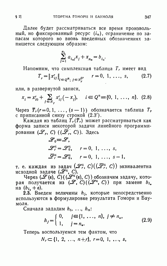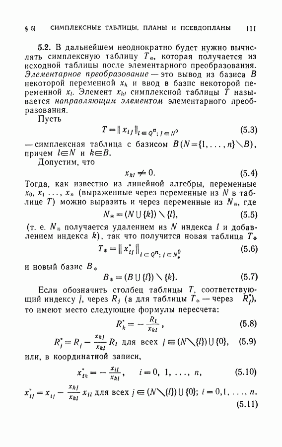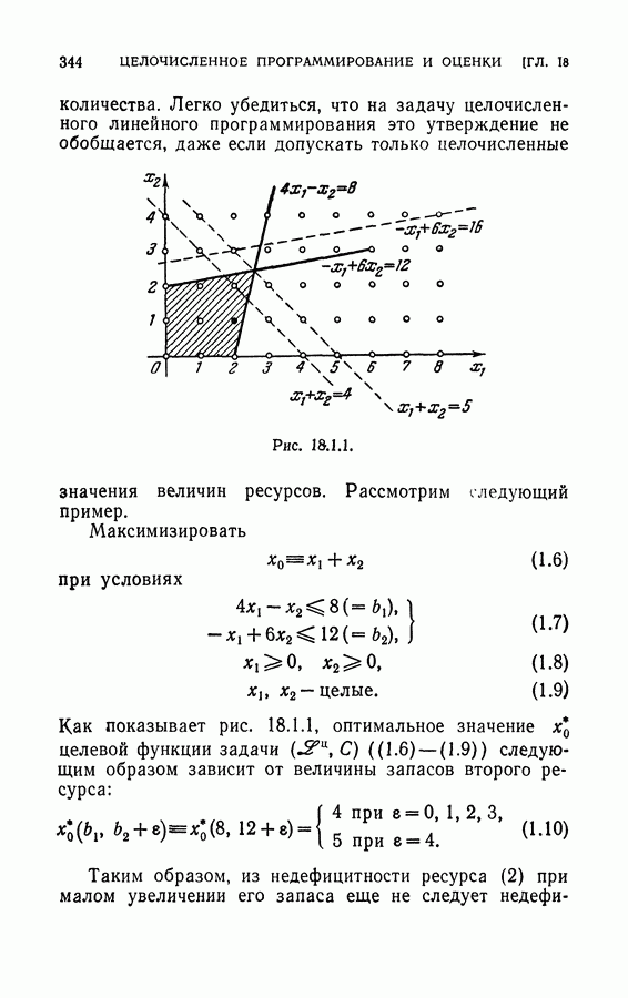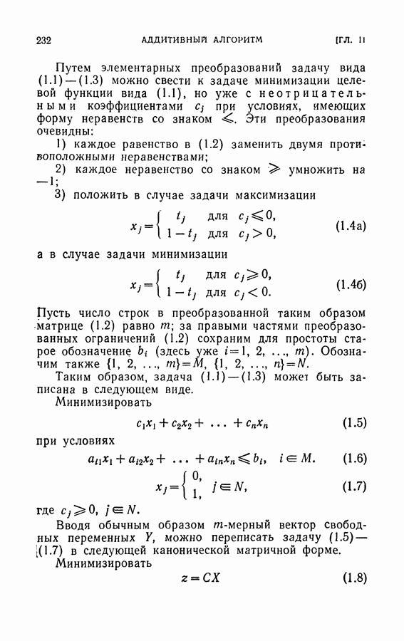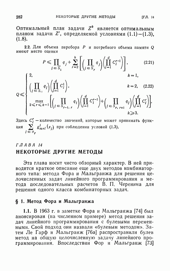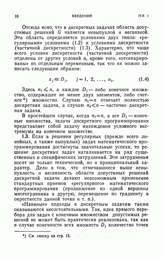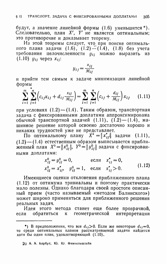 ГЛАВА 7. ТРЕТИЙ АЛГОРИТМ ГОМОРИ И ЕГО МОДИФИКАЦИЯВ этой главе излагается третий алгоритм Гомори [85а], [86], в литературе часто называемый полностью целочисленным, и при некоторых условиях доказывается его конечность. Приведен пример, когда эти условия нарушены и конечность алгоритма Гомори не имеет места. Предложена модификация алгоритма, обеспечивающая конечность при менее ограничительных условиях (пример и модификация алгоритма предложены Финкельштейном [32]). § 1 О влиянии ошибок округления. Идея третьего алгоритма Гомори1.1. Известно (см., например, Джекобе [101]), что влияние ошибок округления может привести к получению ошибочного решения при применении симплекс-метода (прямого или двойственного) в обычной задаче линейного программирования. При решении же с помощью изложенных выше алгоритмов целочисленной задачи линейного программирования влияние ошибок округления существенно усиливается по следующим причинам: 1) Увеличение объема вычислений из-за многократного применения в вычислениях при подсчете чисел типа дробных частей от округленных величин. В алгоритме Дальтона и Ллевелина место дробной части От вредного влияния ошибок округления свободен третий алгоритм, предложенный Гомори [86] для решения полностью целочисленной задачи линейного программирования: Максимизировать