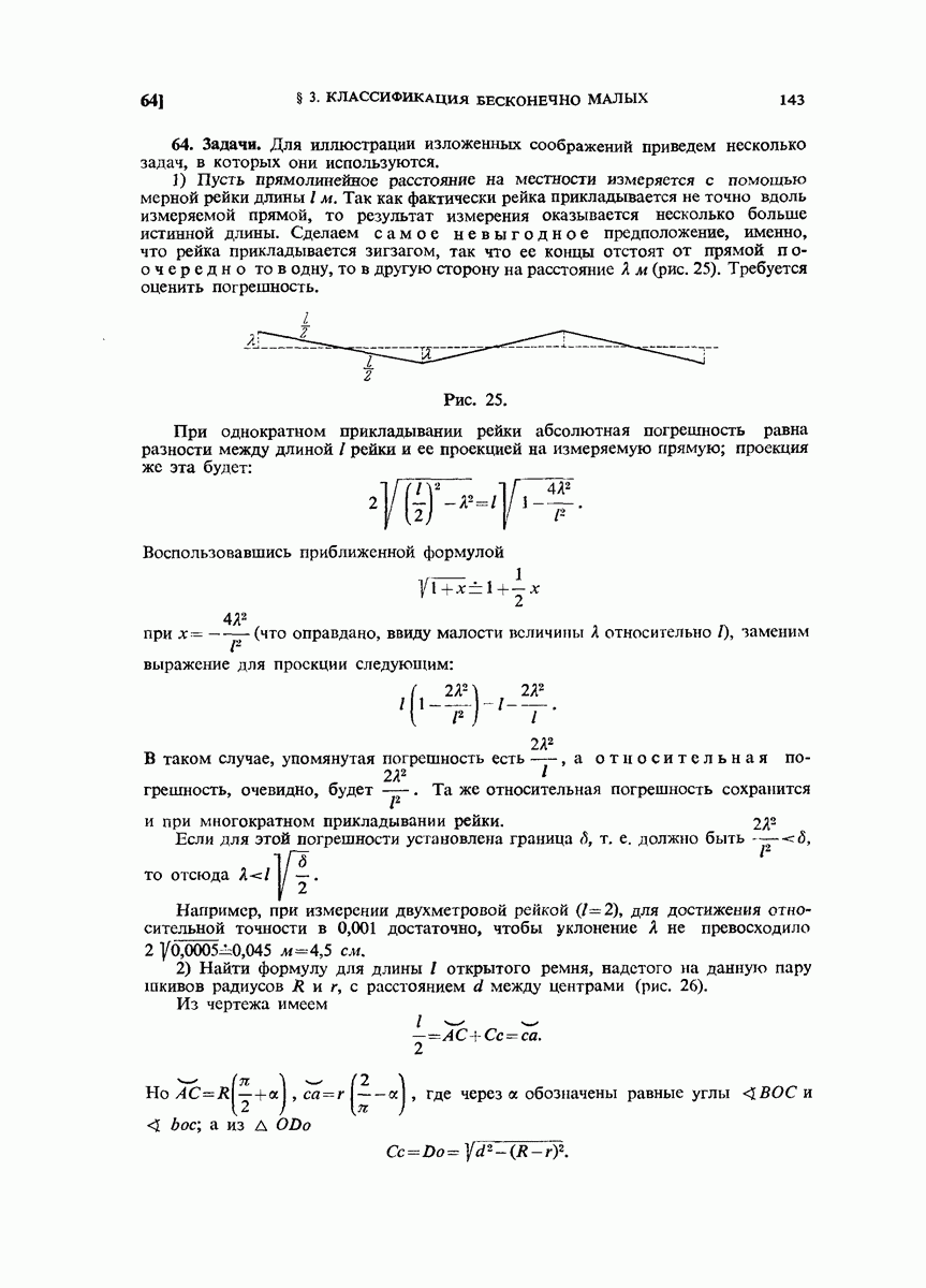 Так как фактически рейка прикладывается не точно вдоль измеряемой прямой, то результат измерения оказывается несколько больше истинной длины. Сделаем самое невыгодное предположение, именно, что рейка прикладывается зигзагом, так что ее концы отстоят от прямой поочередно то в одну, то в другую сторону на расстояние