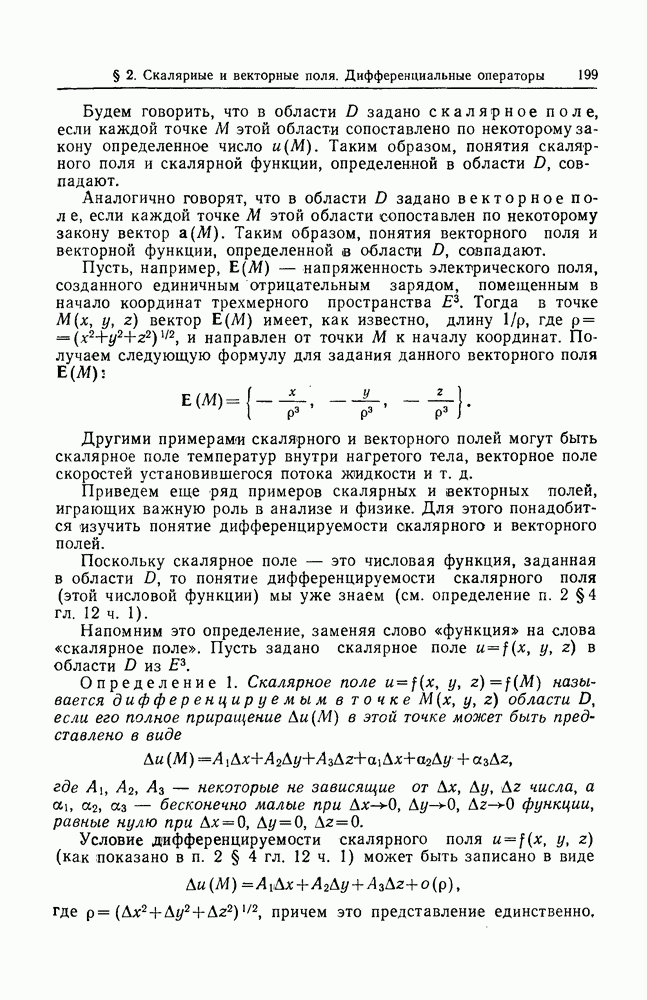 Другими примерами скалярного и векторного полей могут быть скалярное поле температур внутри нагретого тела, векторное поле скоростей установившегося потока жидкости и т. д. Приведем еще ряд примеров скалярных и векторных полей, играющих важную роль в анализе и физике. Для этого понадобится изучить понятие дифференцируемости скалярного и векторного полей. Поскольку скалярное поле — это числовая функция, заданная в области D, то понятие дифференцируемости скалярного поля (этой числовой функции) мы уже знаем (см. определение п. 2 § 4 гл. 12 ч. 1). Напомним это определение, заменяя слово «функция» на слова «скалярное поле». Пусть задано скалярное поле Определение 1. Скалярное поле