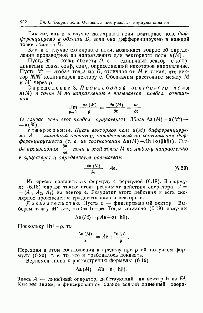 Но если два линейных оператора А и В совпадают на единичной сфере, то они равны, очевидно, на любом векторе, т. е. совпадают всюду; Следовательно, Так же, как и в случае скалярного поля, векторное поле дифференцируемо в области D, если оно дифференцируемо в каждой точке области D. Как и в случае скалярного поля, возникает вопрос об определении производной по направлению для векторного поля Пусть М — точка области Определение 3. Производной векторного поля а (М) в точке М по направлению