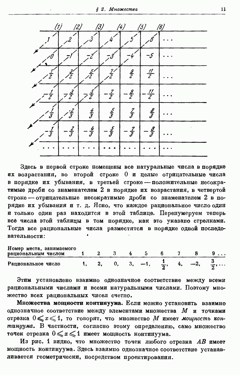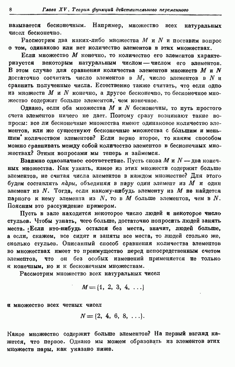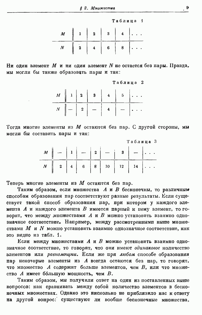 Однако, если оба множества М и Л бесконечны, то путь простого счета элементов ничего не дает. Поэтому сразу возникают такие вопросы: все ли бесконечные множества имеют одинаковое количество элементов, или же существуют бесконечные множества с большим и меньшим количеством элементов? Если верно второе, то каким способом можно сравнивать между собой количество элементов в бесконечных множествах? Этими вопросами мы теперь и займемся.