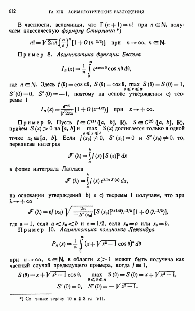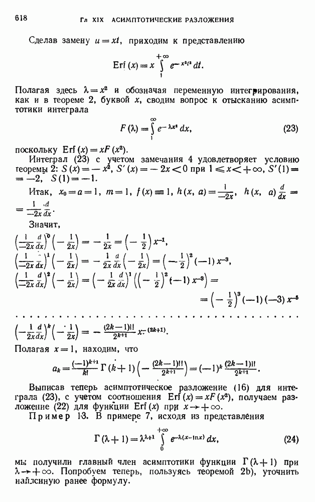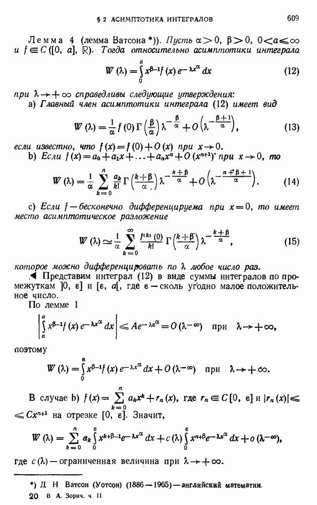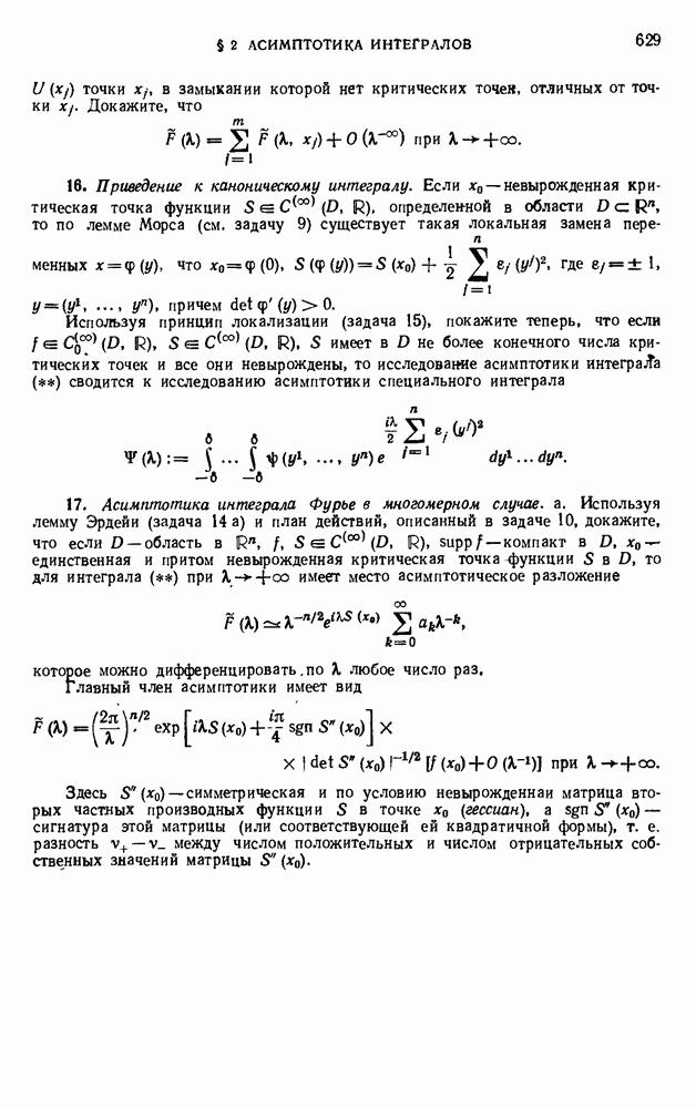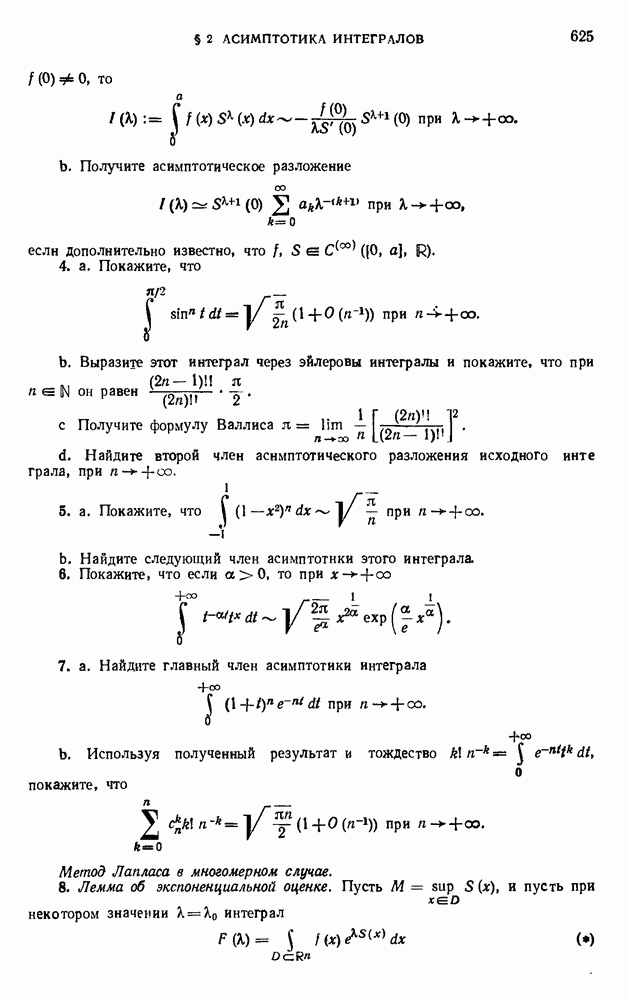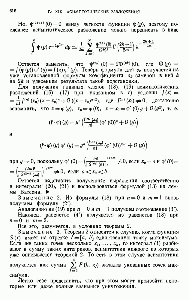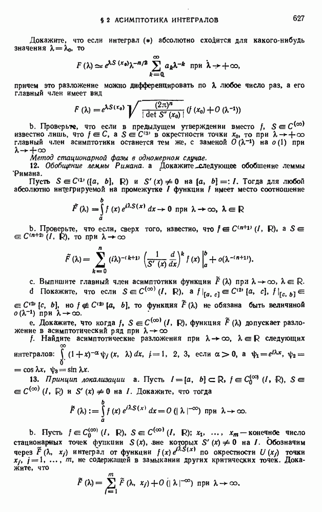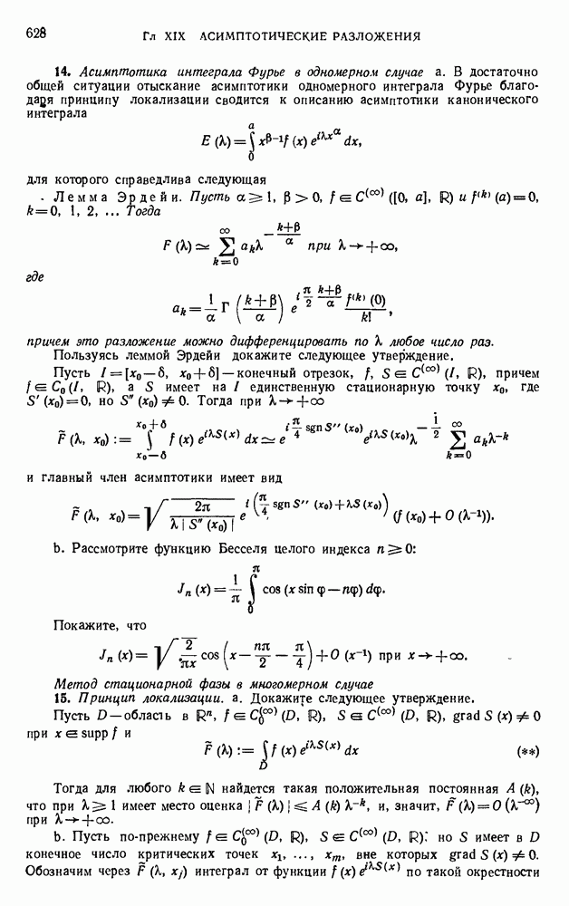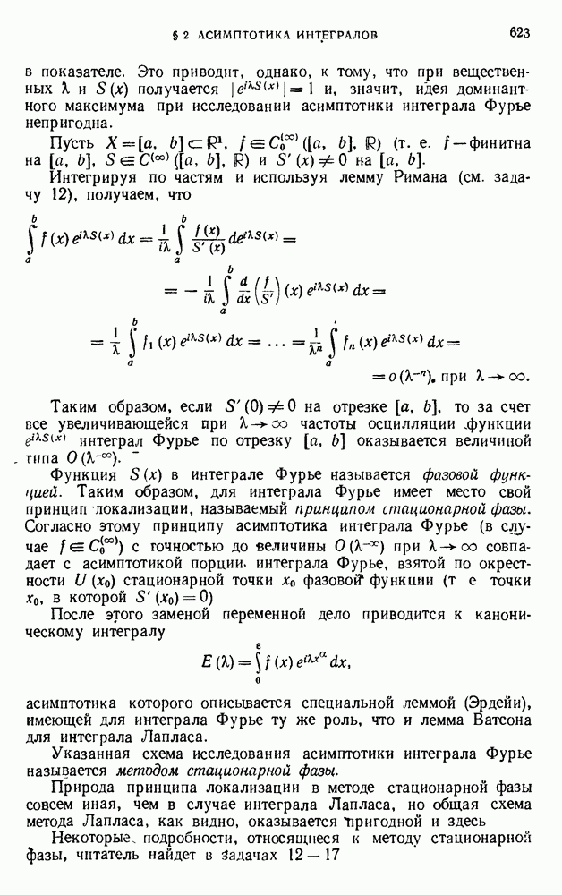 асимптотика которого описывается специальной леммой (Эрдейи), имеющей для интеграла Фурье ту же роль, что и лемма Ватсона для интеграла Лапласа. Указанная схема исследования асимптотики интеграла Фурье называется методом стационарной фазы. Природа принципа локализации в методе стационарной фазы совсем иная, чем в случае интеграла Лапласа, но общая схема метода Лапласа, как видно, оказывается пригодной и здесь Некоторые, подробности, относящиеся к методу стационарной фазы, читатель найдет в Задачах 12—17 Задачи и упражнения(см. скан) (см. скан) (см. скан) (см. скан) (см. скан) (см. скан)