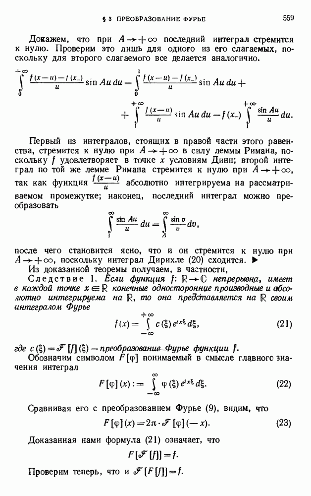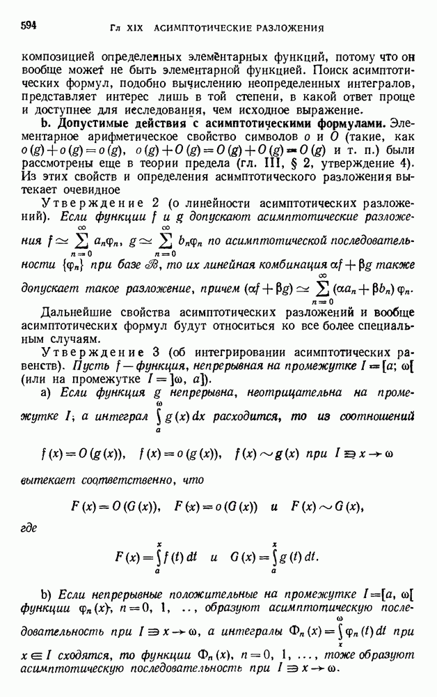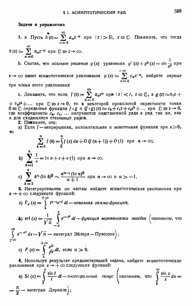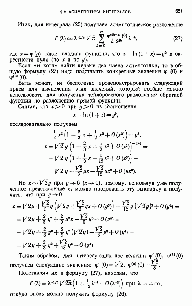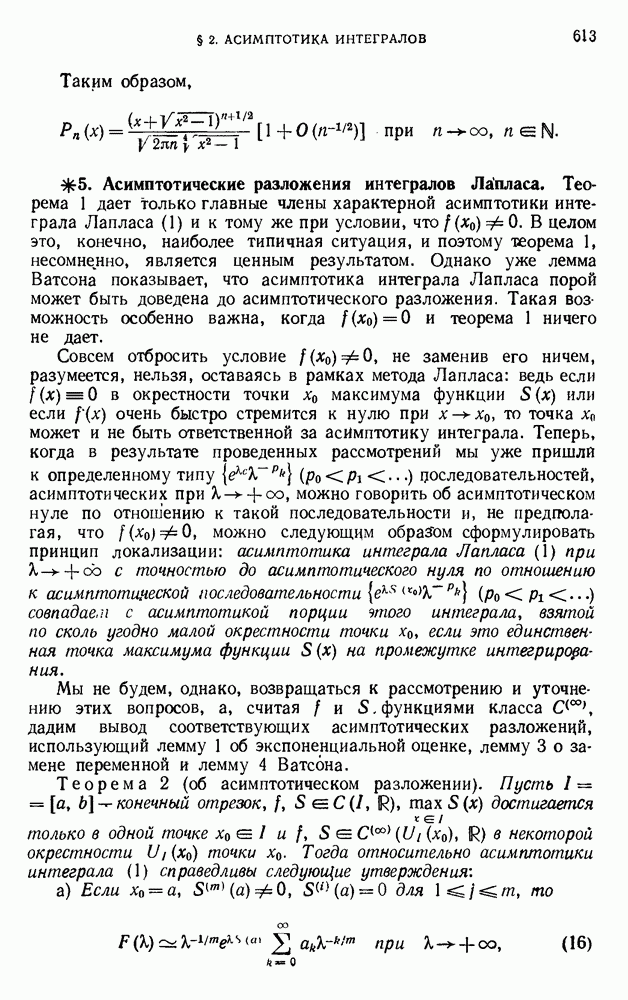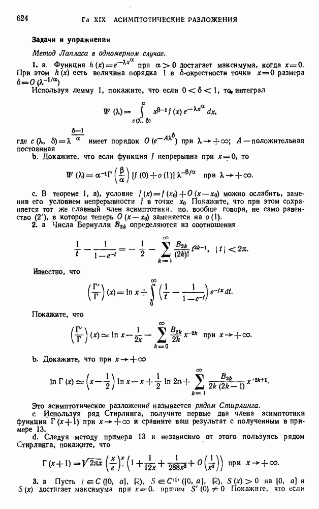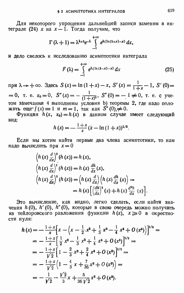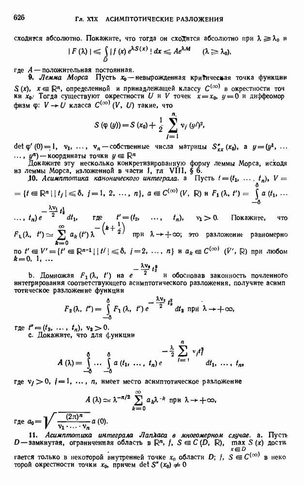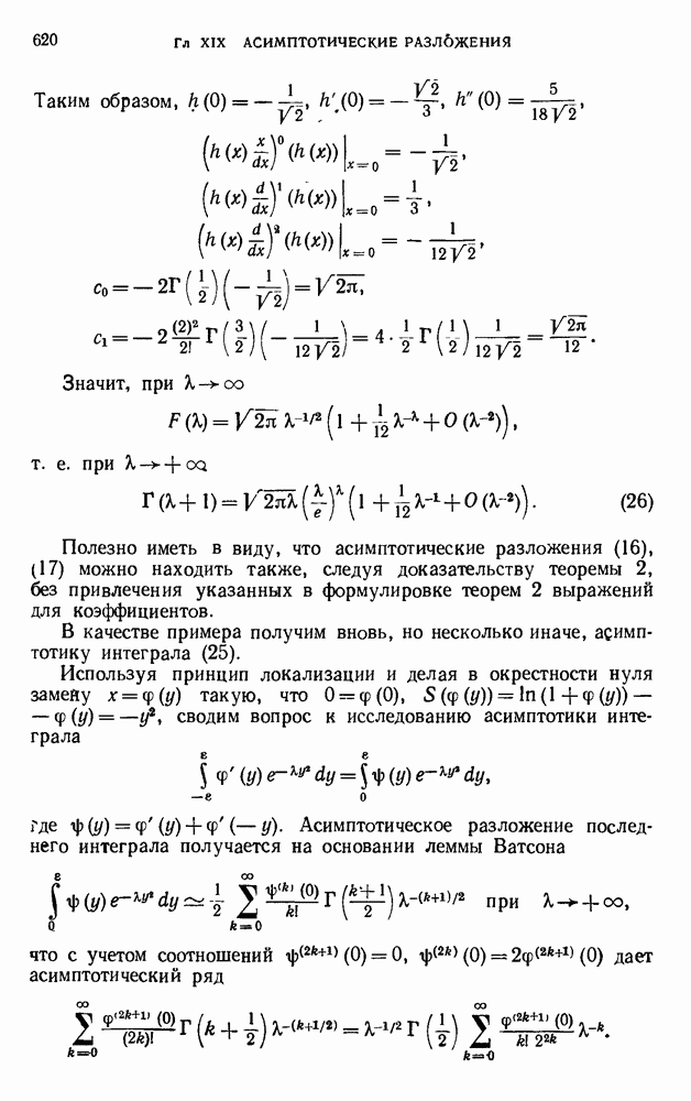 асимптотика которого описывается специальной леммой (Эрдейи), имеющей для интеграла Фурье ту же роль, что и лемма Ватсона для интеграла Лапласа. Указанная схема исследования асимптотики интеграла Фурье называется методом стационарной фазы. Природа принципа локализации в методе стационарной фазы совсем иная, чем в случае интеграла Лапласа, но общая схема метода Лапласа, как видно, оказывается пригодной и здесь Некоторые, подробности, относящиеся к методу стационарной фазы, читатель найдет в Задачах 12—17 Задачи и упражнения(см. скан) (см. скан) (см. скан) (см. скан) (см. скан) (см. скан)