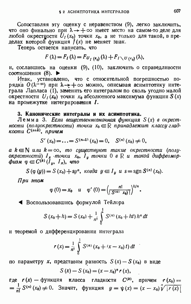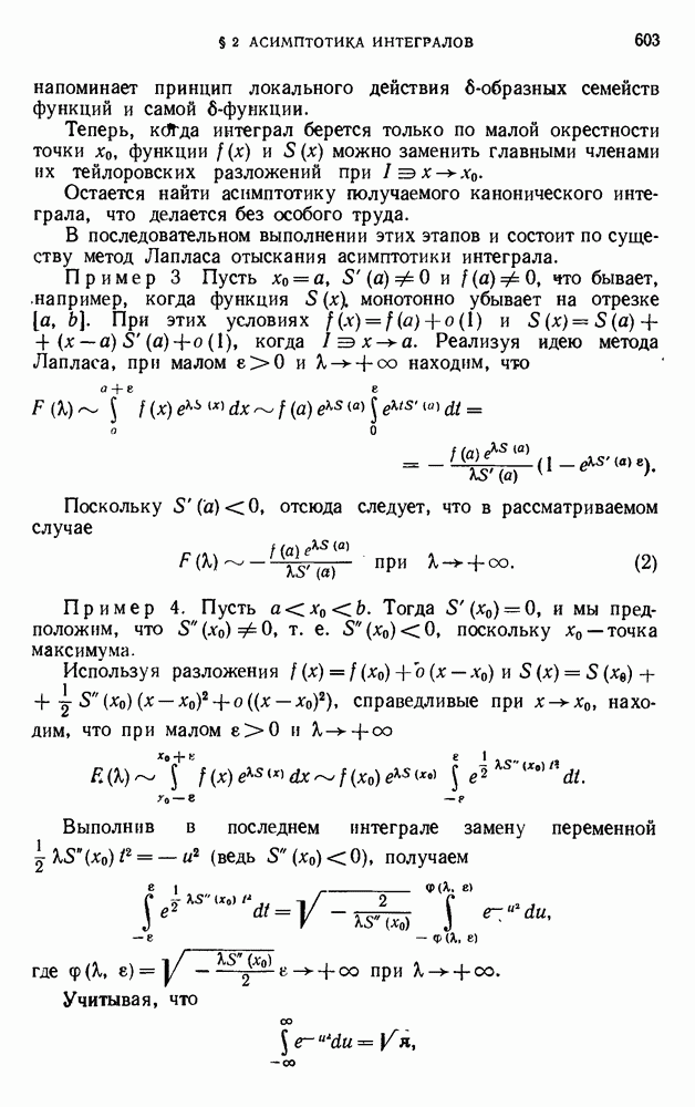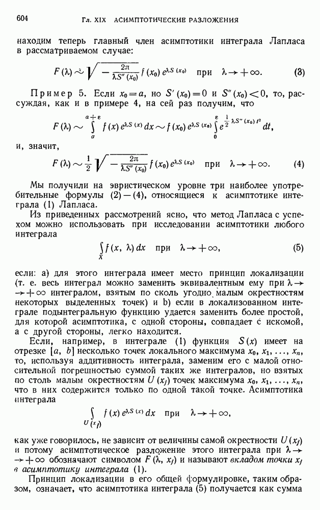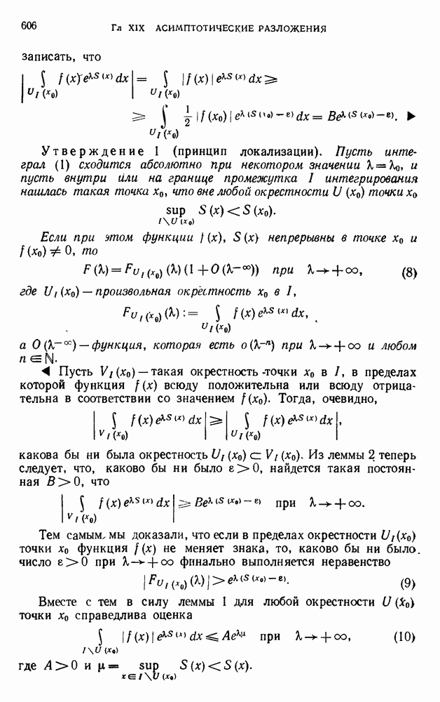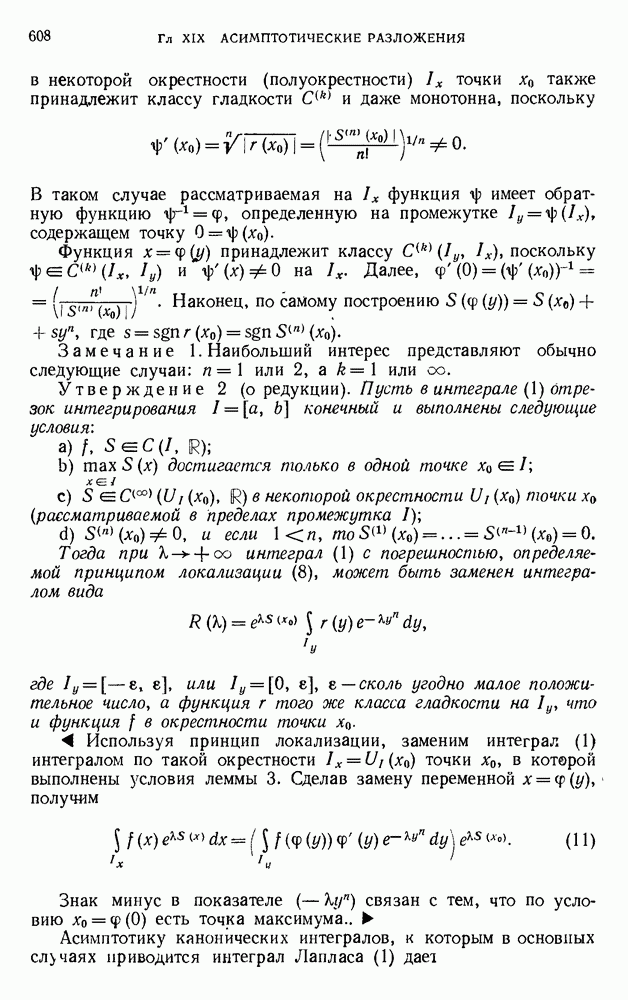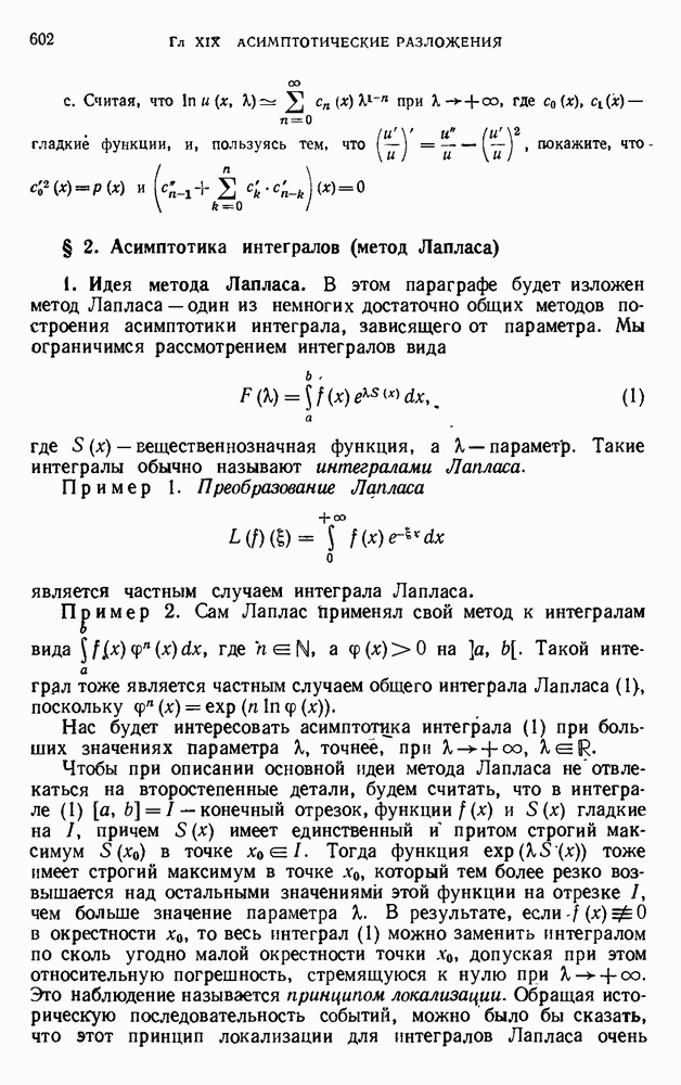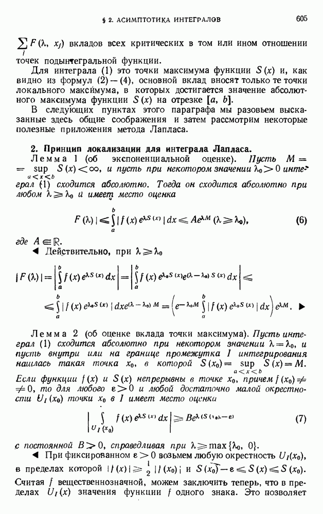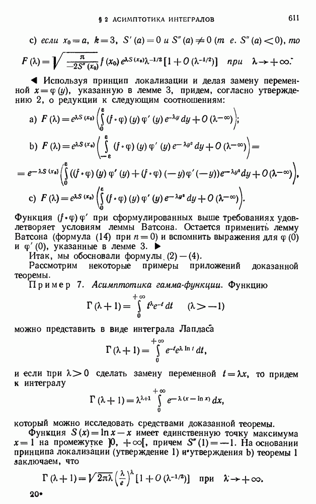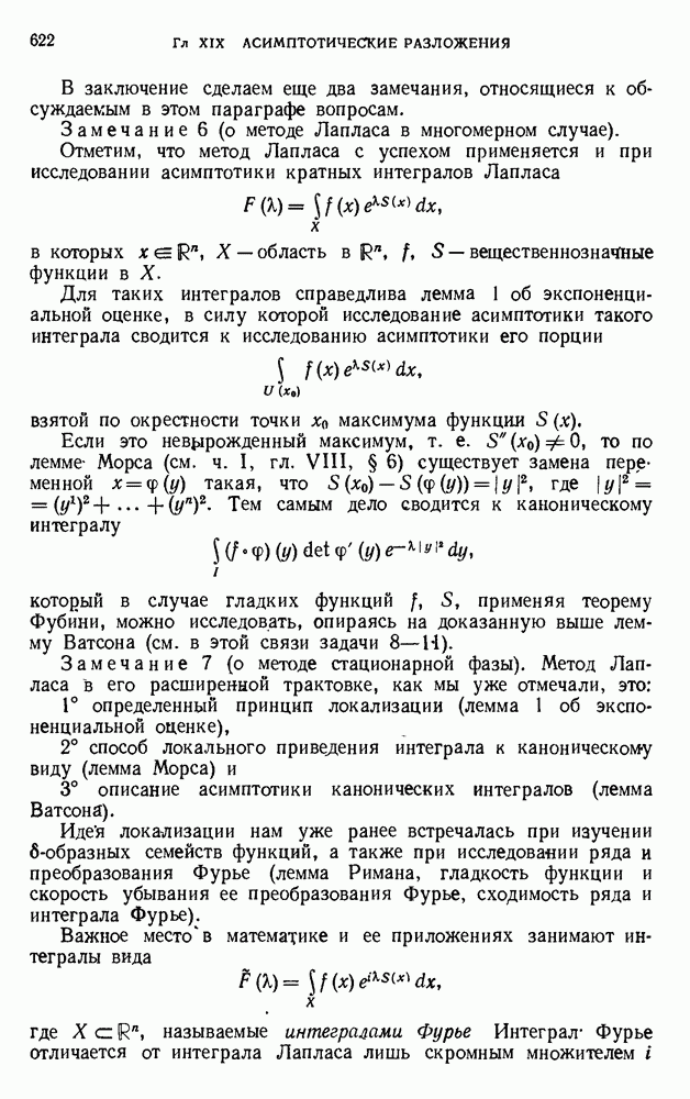 который в случае гладких функций Замечание 7 (о методе стационарной фазы). Метод Лапласа в его расширенной трактовке, как мы уже отмечали, это: Г определенный принцип локализации (лемма 1 об экспоненциальной оценке), 2° способ локального приведения интеграла к каноническому виду (лемма Морса) и 3° описание асимптотики канонических интегралов (лемма Ватсона). Идея локализации нам уже ранее встречалась при изучении Важное местов математике и ее приложениях занимают интегралы вида
