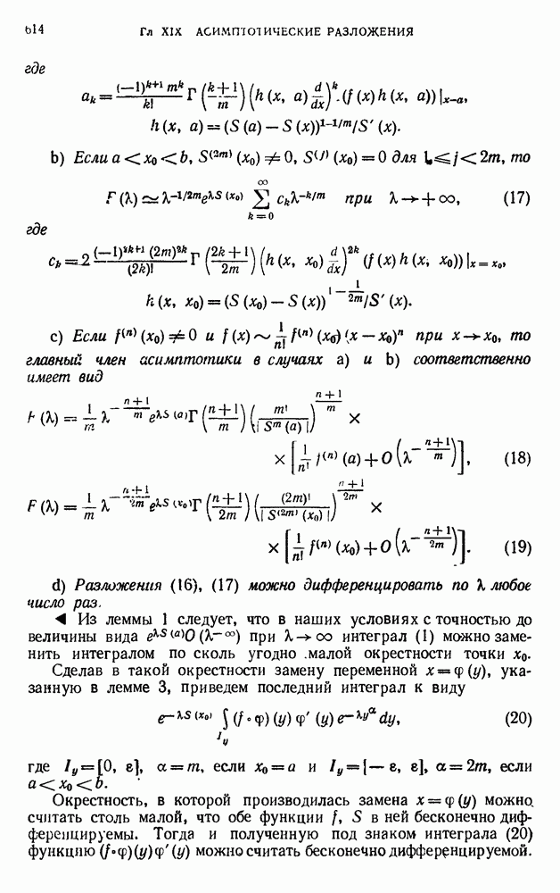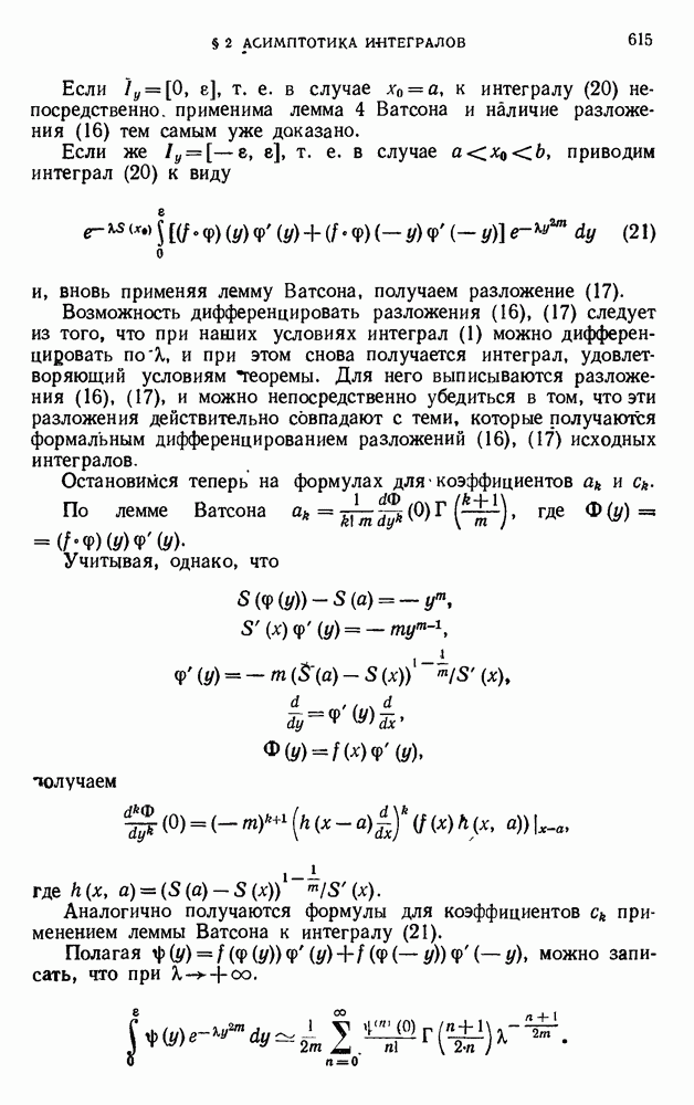 и, вновь применяя лемму Ватсона, получаем разложение (17). Возможность дифференцировать разложения (16), (17) следует из того, что при наших условиях интеграл (1) можно дифференцировать по Х, и при этом снова получается интеграл, удовлетворяющий условиям теоремы. Для него выписываются разложения (16), (17), и можно непосредственно убедиться в том, что эти разложения действительно совпадают с теми, которые получаются формальным дифференцированием разложений (16), (17) исходных интегралов. Остановимся теперь на формулах для - коэффициентов Учитывая, однако, что
