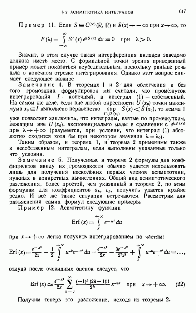 Значит, в этом случае такая интерференция вкладов заведомо должна иметь место. С формальной точки зрения приведенный пример может показаться неубедительным, поскольку раньше речь шла о конечном отрезке интегрирования. Однако этот вопрос снимает следующее важное Замечание 4. В теоремах 1 и 2 для облегчения и без того громоздких формулировок мы считали, что промежуток интегрирования I — конечный, а интеграл (1) — собственный. На самом же деле, если вне любой окрестности Таким образом, и теорема 1, и теорема 2 применимы также к несобственным интегралам, если выполнены указанные только что условия. Замечание 5. Полученные в теореме 2 формулы для коэффициентов ввиду их громоздкости обычно удается использовать лишь для получения нескольких первых членов асимптотики, нужных в конкретных вычислениях. Общий вид асимптотического разложения, более простой, чем указанный в теореме 2, по этим формулам для коэффициентов Пример 12. Асимптотику функции