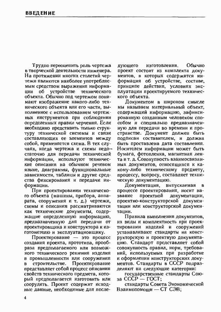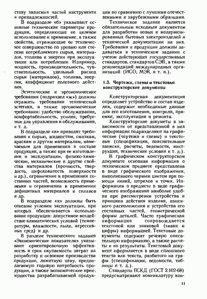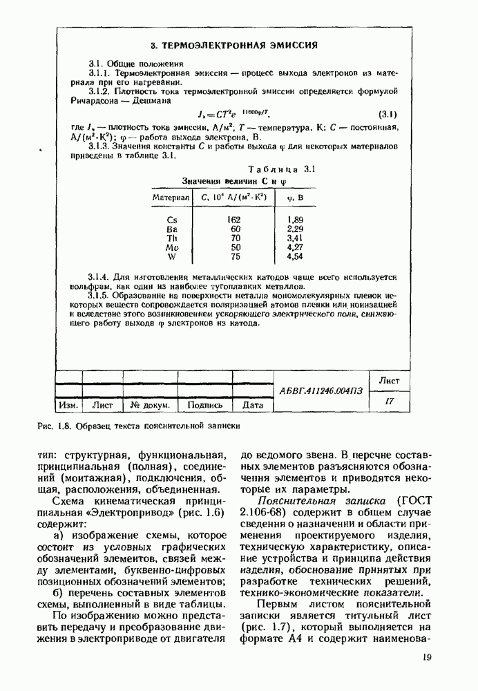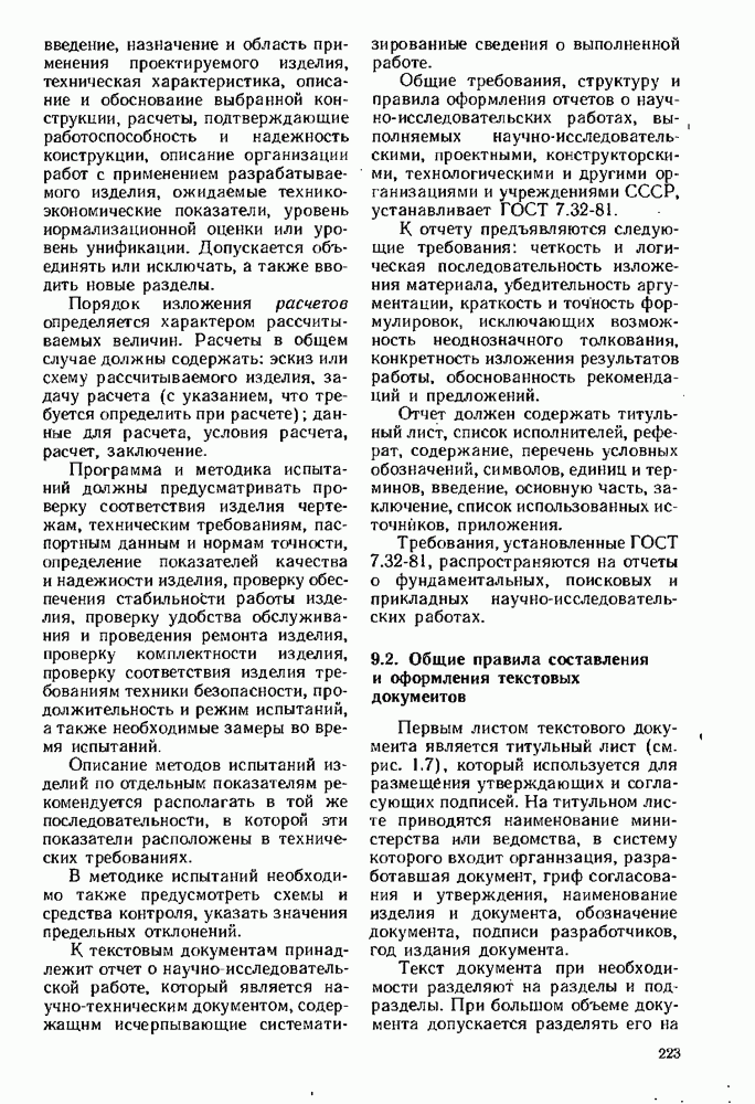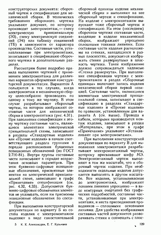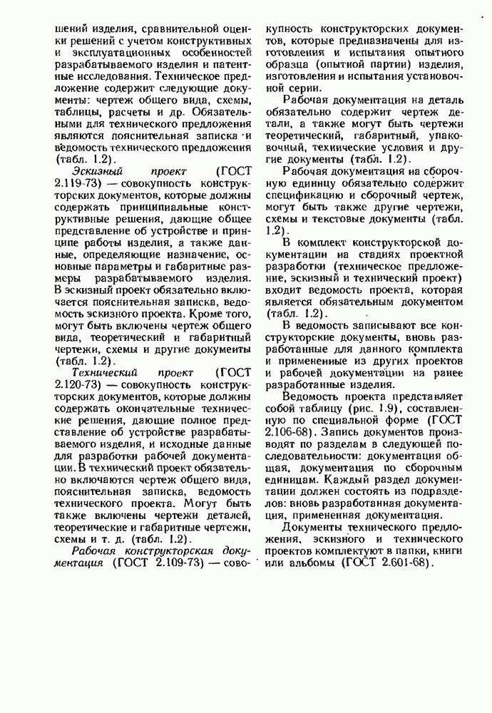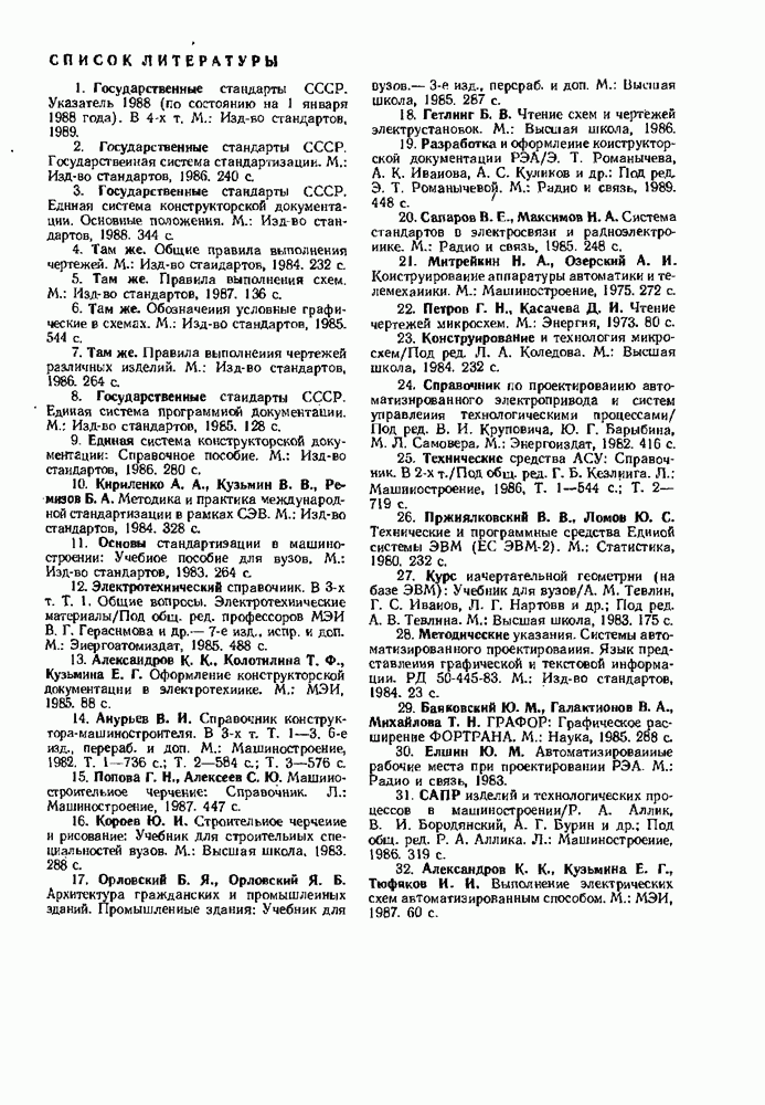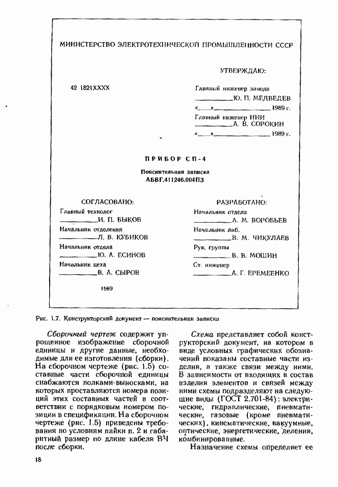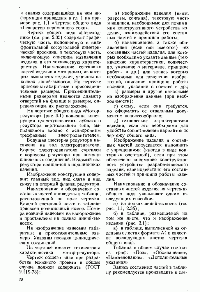 (кликните для просмотра скана) Рис. 1.7. (см. скан) Конструкторский документ—пояснительная записка Сборочный чертеж содержит упрощенное изображение сборочной единицы и другие данные, необходимые для ее изготовления (сборки). На сборочном чертеже (рис, 1.5) составные части сборочной единицы снабжаются полками-выносками, на которых проставляются номера позиций этих составных частей в соответствии с порядковым номером позиции в спецификации. На сборочном чертеже (рис. 1.5) приведены требования по условиям пайки п. 2 и габаритный размер по длине кабеля ВЧ после сборки. Схема представляет собой конструкторский документ, на котором в виде условных графических обозначений показаны составные части изделия, а также связи между ними. В зависимости от входящих в состав изделия элементов и связей между ними схемы подразделяют на следующие виды (ГОСТ 2.701-84): электрические, гидравлические, пневматические, газовые (кроме пневматических), кинематические, вакуумные, оптические, энергетические, деления, комбинированные. Назначение схемы определяет ее Рис. 1.8. (см. скан) Образец текста пояснительной записки тип: структурная, функциональная, принципиальная (полная), соединений (монтажная), подключения, общая, расположения, объединенная. Схема кинематическая принципиальная «Электропривод» (рис. 1.6) содержит: а) изображение схемы, которое состоит из условных графических обозначений элементов, связей между элементами, буквенно-цифровых позиционных обозначений элементов; б) перечень составных элементов схемы, выполненный в виде таблицы. По изображению можно представить передачу и преобразование движения в электроприводе от двигателя до ведомого звена. В перечне составных элементов разъясняются обозначения элементов и приводятся некоторые их параметры. Пояснительная записка (ГОСТ 2.106-68) содержит в общем случае сведения о назначении и области применения проектируемого изделия, техническую характеристику, описание устройства и принципа действия изделия, обоснование принятых при разработке технических решений, технико-экономические показатели. Первым листом пояснительной записки является титульный лист (рис. 1.7), который выполняется на формате А4 и содержит наименование министерства или ведомства, разработавшего документ, код изделия по общесоюзному классификатору продукции (ОКП), грифы согласования и утверждения, наименование изделия, обозначение документа, подписи разработчиков документа, год издания документа. Пример выполнения промежуточной страницы пояснительной записки приведен на рис. 1.8. (см. скан) Расчеты включают эскиз или схему рассчитываемого изделия, задачу расчета, данные для расчета, условия расчета, расчет, заключение. Из других конструкторских документов следует упомянуть: а) теоретический чертеж, который определяет геометрическую форму (обводы) изделия и координаты расположения составных частей; б) габаритный чертеж, содержащий контурное изображение изделия с габаритными, установочными и присоединительными размерами; в) монтажный чертеж, необходимый для монтажа изделия на месте применения. Каждый конструкторский документ имеет код по ГОСТ 2.102-68. Так, чертеж общего вида имеет код
