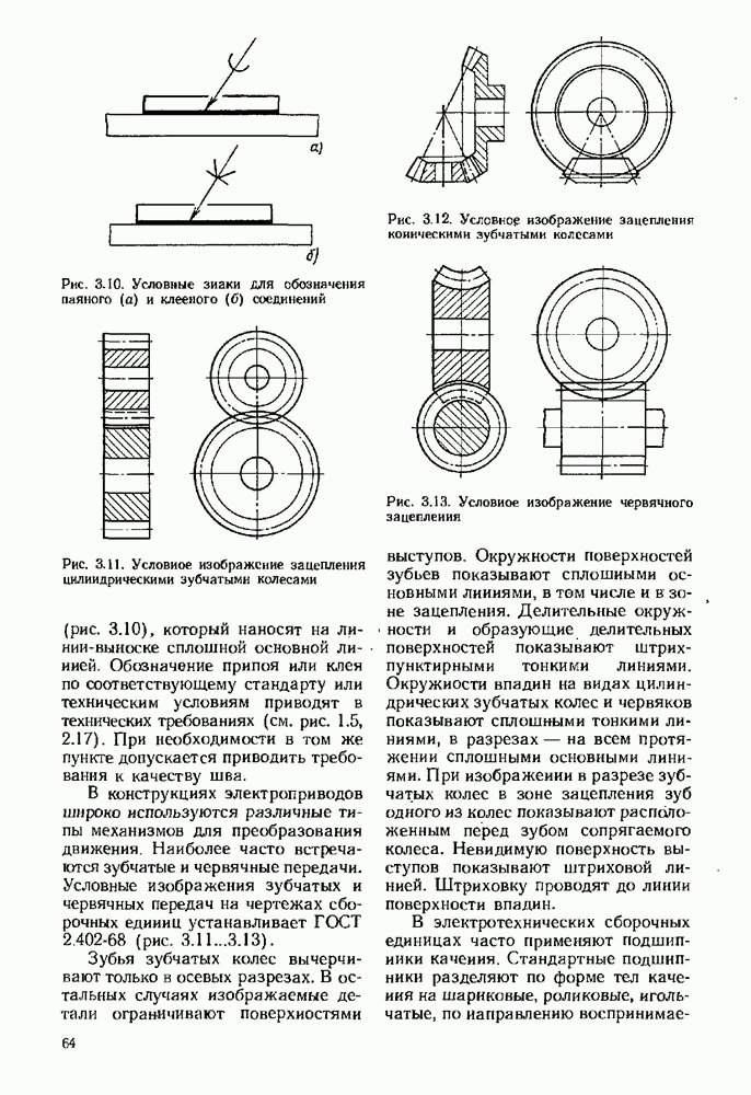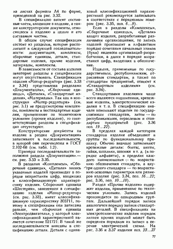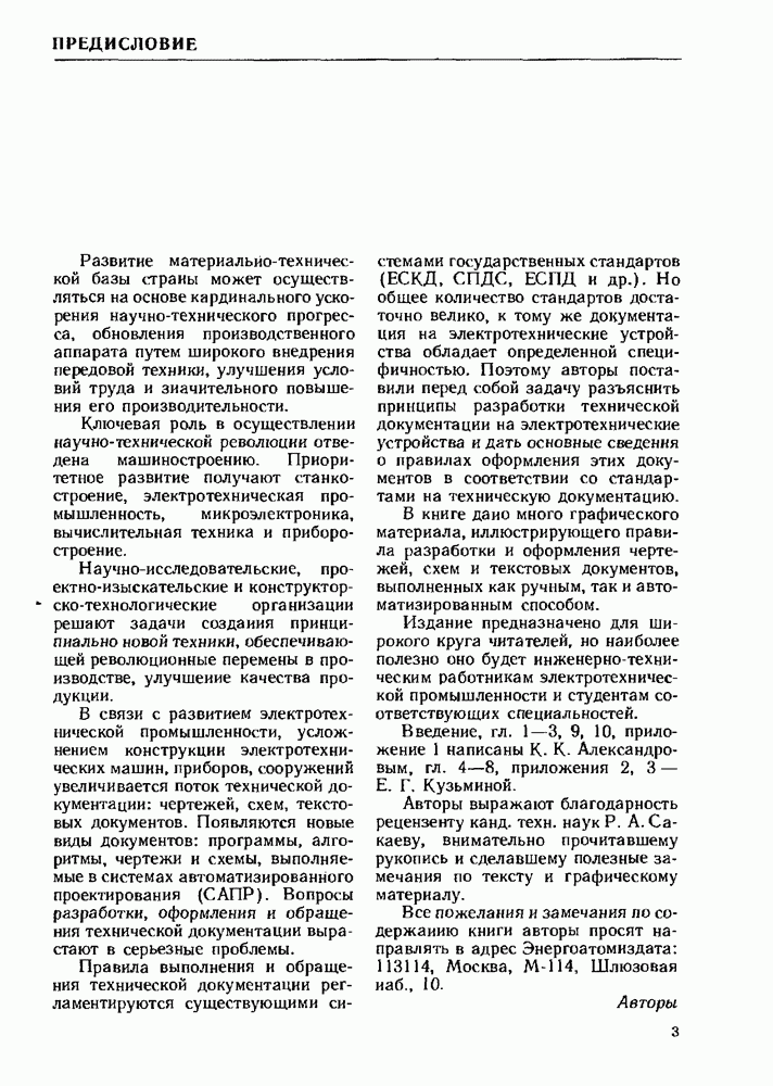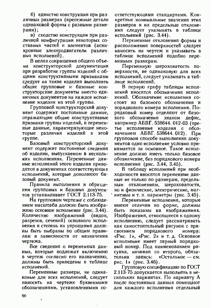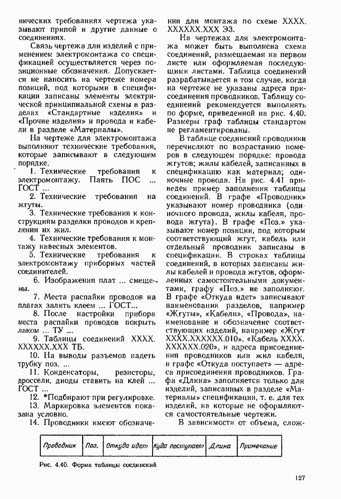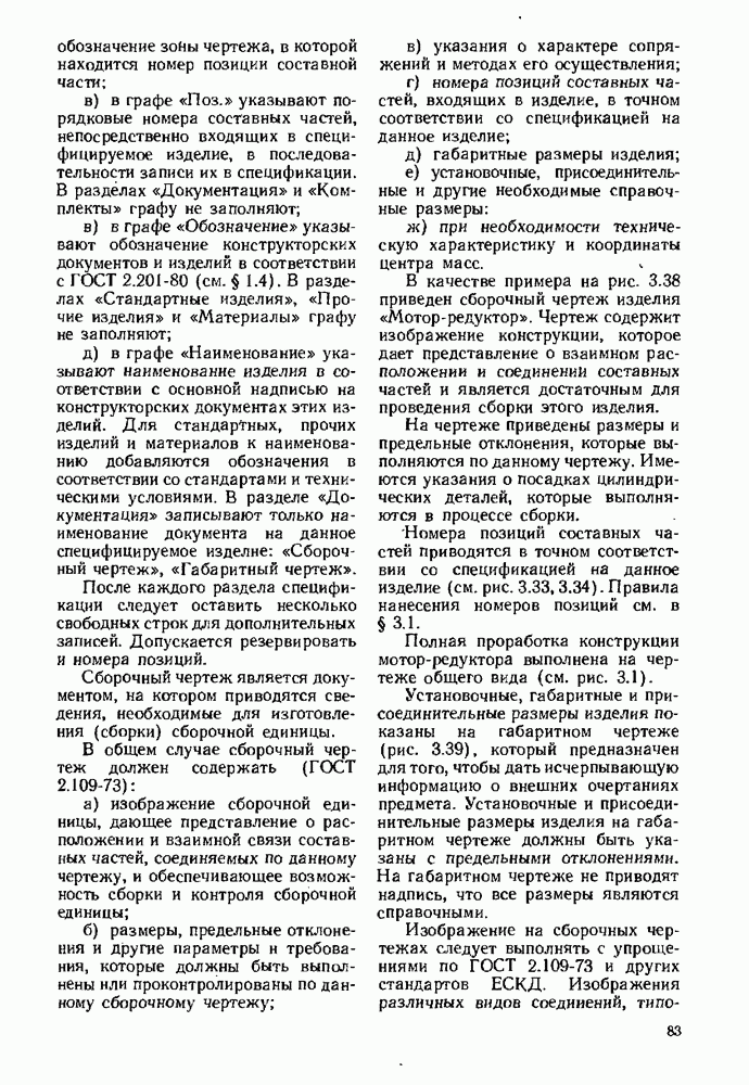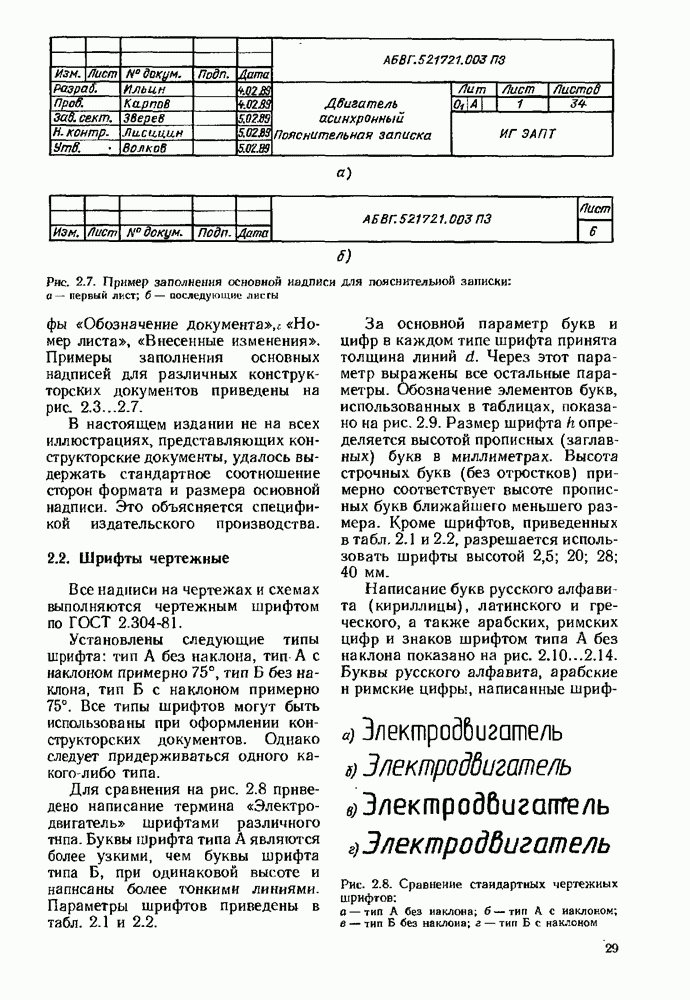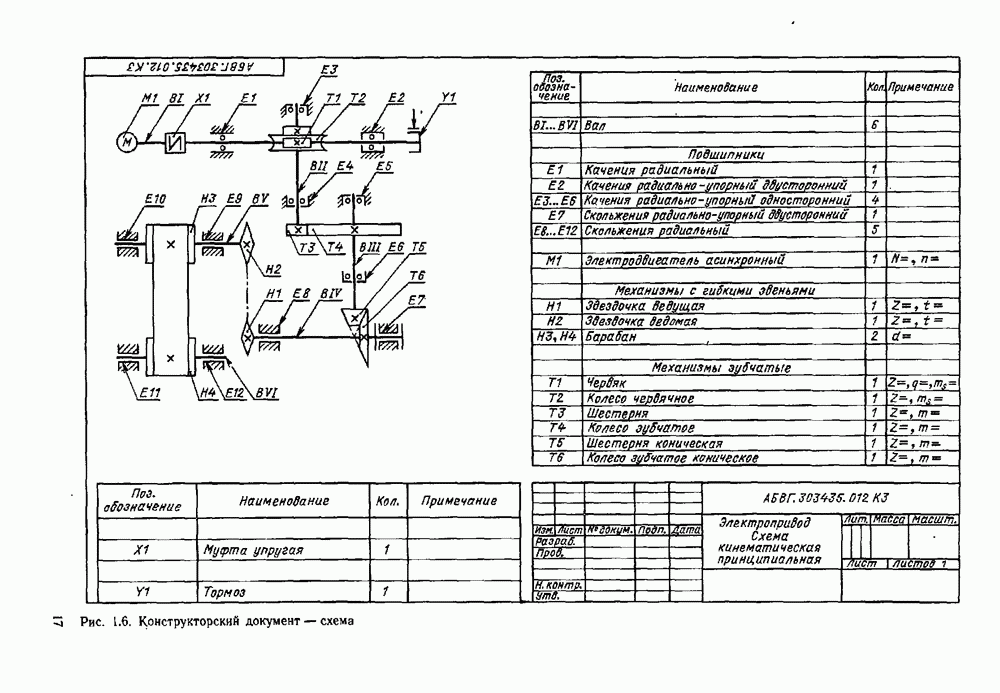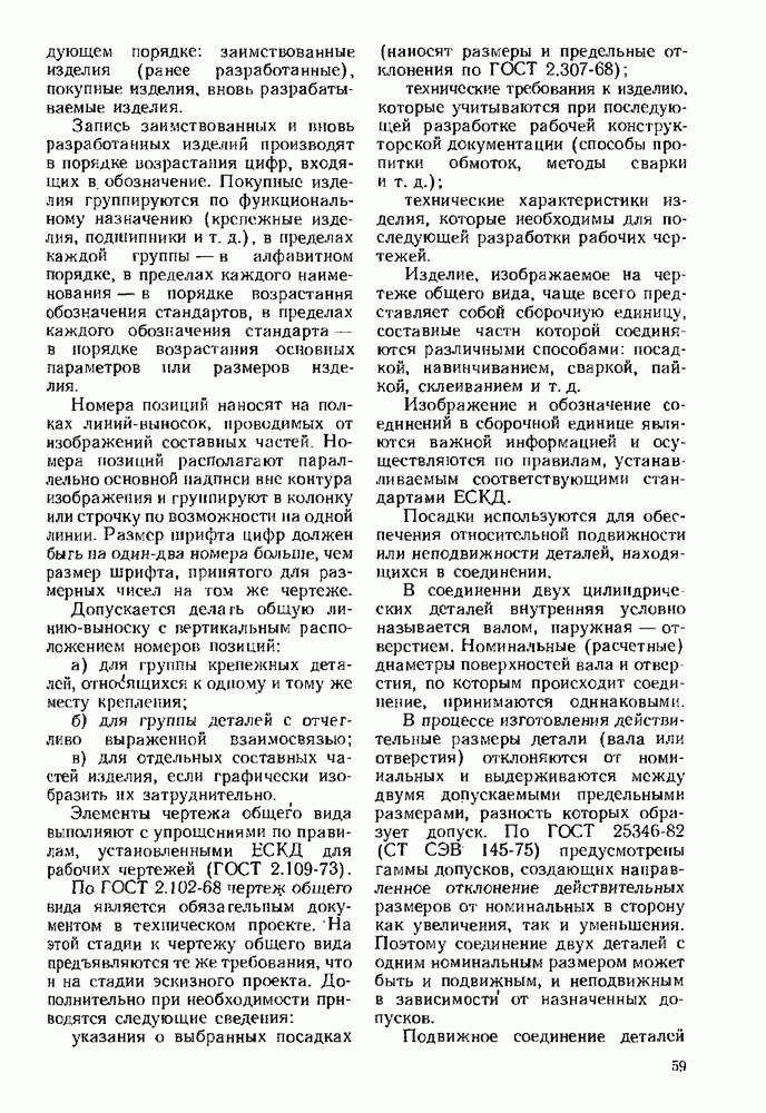 (кликните для просмотра скана) Рис. 1.7. (см. скан) Конструкторский документ—пояснительная записка Сборочный чертеж содержит упрощенное изображение сборочной единицы и другие данные, необходимые для ее изготовления (сборки). На сборочном чертеже (рис, 1.5) составные части сборочной единицы снабжаются полками-выносками, на которых проставляются номера позиций этих составных частей в соответствии с порядковым номером позиции в спецификации. На сборочном чертеже (рис. 1.5) приведены требования по условиям пайки п. 2 и габаритный размер по длине кабеля ВЧ после сборки. Схема представляет собой конструкторский документ, на котором в виде условных графических обозначений показаны составные части изделия, а также связи между ними. В зависимости от входящих в состав изделия элементов и связей между ними схемы подразделяют на следующие виды (ГОСТ 2.701-84): электрические, гидравлические, пневматические, газовые (кроме пневматических), кинематические, вакуумные, оптические, энергетические, деления, комбинированные. Назначение схемы определяет ее Рис. 1.8. (см. скан) Образец текста пояснительной записки тип: структурная, функциональная, принципиальная (полная), соединений (монтажная), подключения, общая, расположения, объединенная. Схема кинематическая принципиальная «Электропривод» (рис. 1.6) содержит: а) изображение схемы, которое состоит из условных графических обозначений элементов, связей между элементами, буквенно-цифровых позиционных обозначений элементов; б) перечень составных элементов схемы, выполненный в виде таблицы. По изображению можно представить передачу и преобразование движения в электроприводе от двигателя до ведомого звена. В перечне составных элементов разъясняются обозначения элементов и приводятся некоторые их параметры. Пояснительная записка (ГОСТ 2.106-68) содержит в общем случае сведения о назначении и области применения проектируемого изделия, техническую характеристику, описание устройства и принципа действия изделия, обоснование принятых при разработке технических решений, технико-экономические показатели. Первым листом пояснительной записки является титульный лист (рис. 1.7), который выполняется на формате А4 и содержит наименование министерства или ведомства, разработавшего документ, код изделия по общесоюзному классификатору продукции (ОКП), грифы согласования и утверждения, наименование изделия, обозначение документа, подписи разработчиков документа, год издания документа. Пример выполнения промежуточной страницы пояснительной записки приведен на рис. 1.8. (см. скан) Расчеты включают эскиз или схему рассчитываемого изделия, задачу расчета, данные для расчета, условия расчета, расчет, заключение. Из других конструкторских документов следует упомянуть: а) теоретический чертеж, который определяет геометрическую форму (обводы) изделия и координаты расположения составных частей; б) габаритный чертеж, содержащий контурное изображение изделия с габаритными, установочными и присоединительными размерами; в) монтажный чертеж, необходимый для монтажа изделия на месте применения. Каждый конструкторский документ имеет код по ГОСТ 2.102-68. Так, чертеж общего вида имеет код