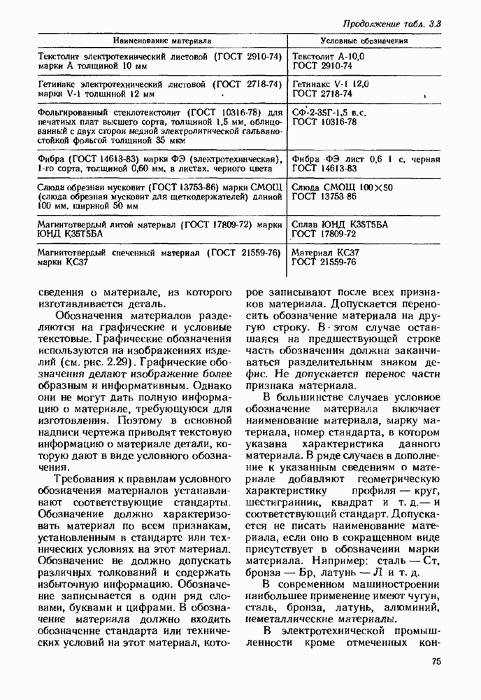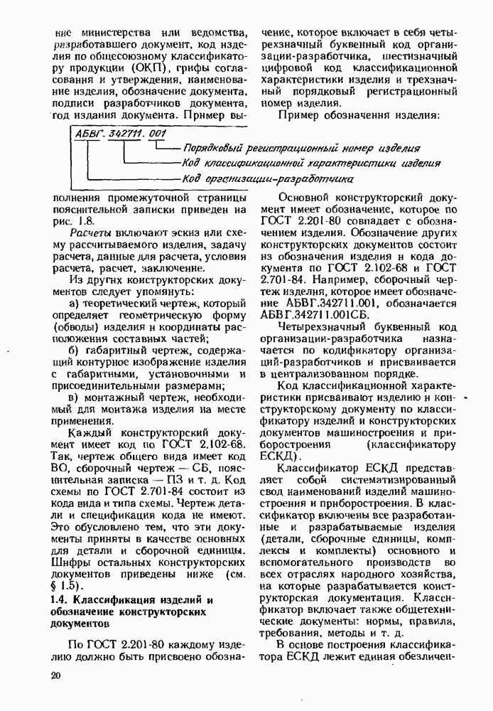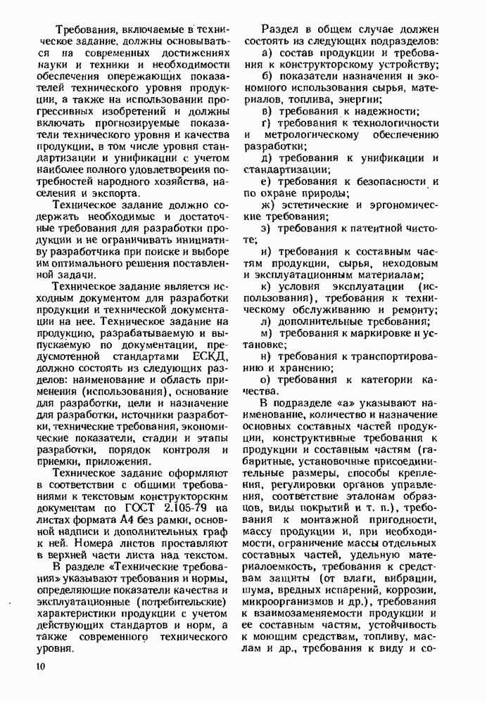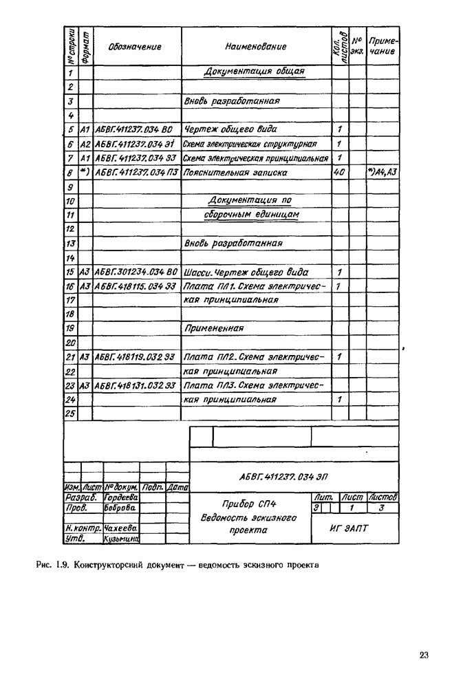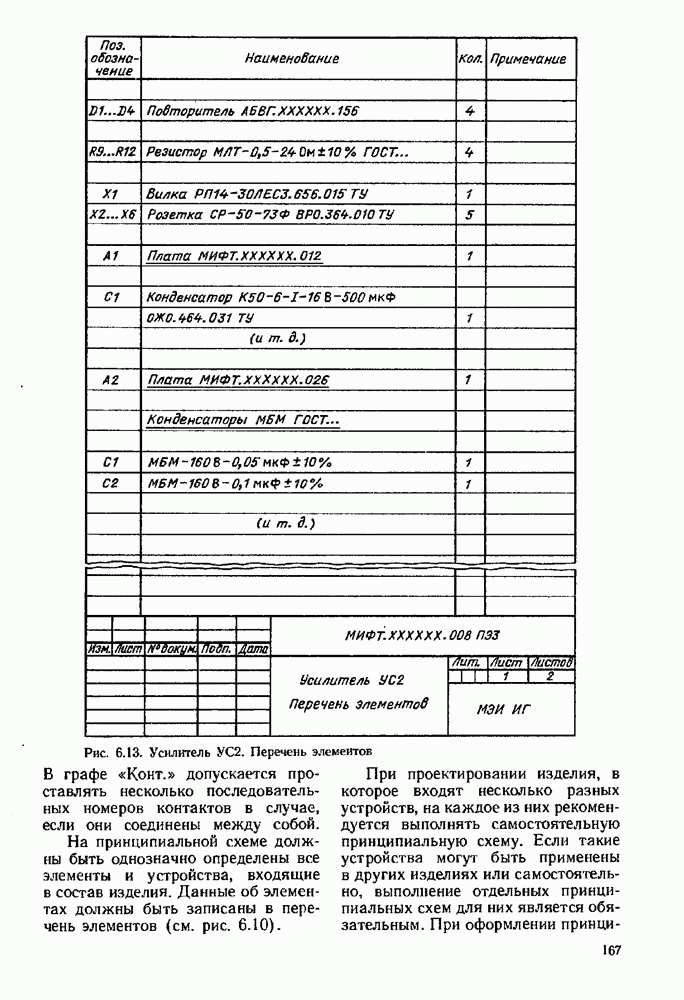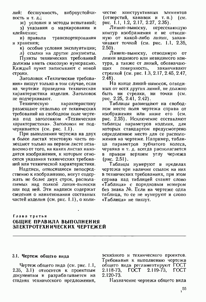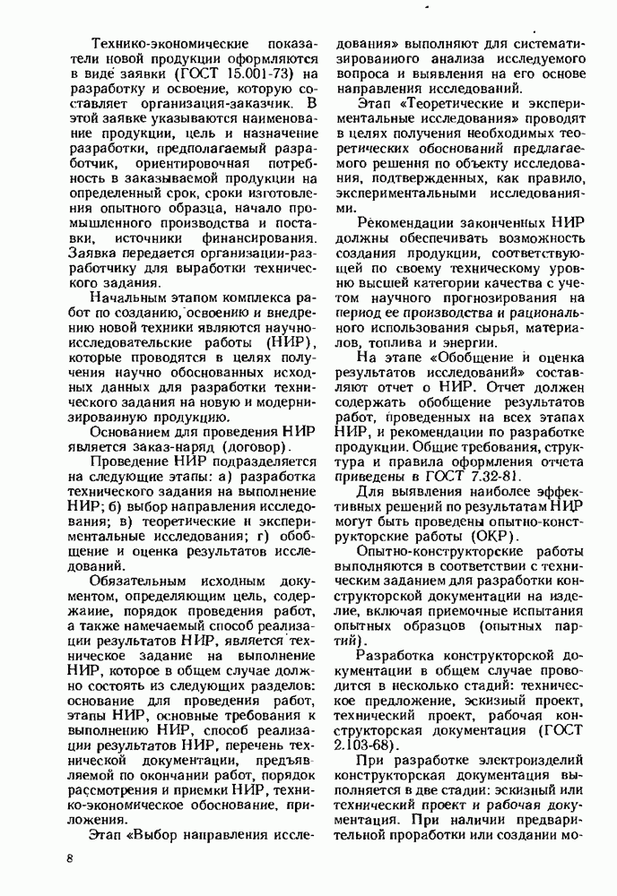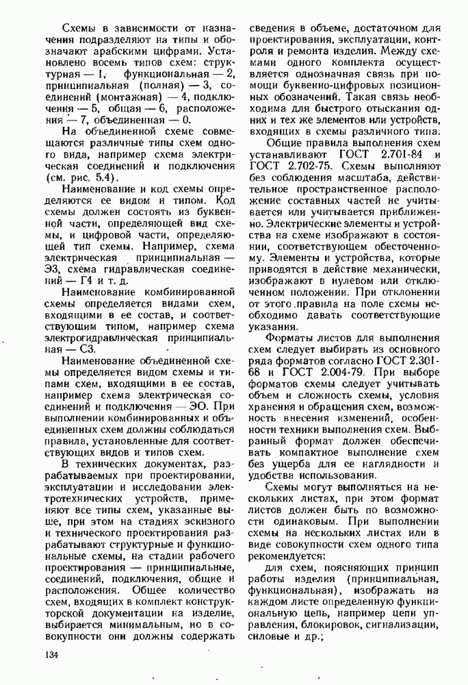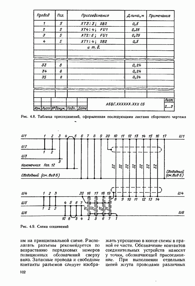 (кликните для просмотра скана) Рис. 1.7. (см. скан) Конструкторский документ—пояснительная записка Сборочный чертеж содержит упрощенное изображение сборочной единицы и другие данные, необходимые для ее изготовления (сборки). На сборочном чертеже (рис, 1.5) составные части сборочной единицы снабжаются полками-выносками, на которых проставляются номера позиций этих составных частей в соответствии с порядковым номером позиции в спецификации. На сборочном чертеже (рис. 1.5) приведены требования по условиям пайки п. 2 и габаритный размер по длине кабеля ВЧ после сборки. Схема представляет собой конструкторский документ, на котором в виде условных графических обозначений показаны составные части изделия, а также связи между ними. В зависимости от входящих в состав изделия элементов и связей между ними схемы подразделяют на следующие виды (ГОСТ 2.701-84): электрические, гидравлические, пневматические, газовые (кроме пневматических), кинематические, вакуумные, оптические, энергетические, деления, комбинированные. Назначение схемы определяет ее Рис. 1.8. (см. скан) Образец текста пояснительной записки тип: структурная, функциональная, принципиальная (полная), соединений (монтажная), подключения, общая, расположения, объединенная. Схема кинематическая принципиальная «Электропривод» (рис. 1.6) содержит: а) изображение схемы, которое состоит из условных графических обозначений элементов, связей между элементами, буквенно-цифровых позиционных обозначений элементов; б) перечень составных элементов схемы, выполненный в виде таблицы. По изображению можно представить передачу и преобразование движения в электроприводе от двигателя до ведомого звена. В перечне составных элементов разъясняются обозначения элементов и приводятся некоторые их параметры. Пояснительная записка (ГОСТ 2.106-68) содержит в общем случае сведения о назначении и области применения проектируемого изделия, техническую характеристику, описание устройства и принципа действия изделия, обоснование принятых при разработке технических решений, технико-экономические показатели. Первым листом пояснительной записки является титульный лист (рис. 1.7), который выполняется на формате А4 и содержит наименование министерства или ведомства, разработавшего документ, код изделия по общесоюзному классификатору продукции (ОКП), грифы согласования и утверждения, наименование изделия, обозначение документа, подписи разработчиков документа, год издания документа. Пример выполнения промежуточной страницы пояснительной записки приведен на рис. 1.8. (см. скан) Расчеты включают эскиз или схему рассчитываемого изделия, задачу расчета, данные для расчета, условия расчета, расчет, заключение. Из других конструкторских документов следует упомянуть: а) теоретический чертеж, который определяет геометрическую форму (обводы) изделия и координаты расположения составных частей; б) габаритный чертеж, содержащий контурное изображение изделия с габаритными, установочными и присоединительными размерами; в) монтажный чертеж, необходимый для монтажа изделия на месте применения. Каждый конструкторский документ имеет код по ГОСТ 2.102-68. Так, чертеж общего вида имеет код