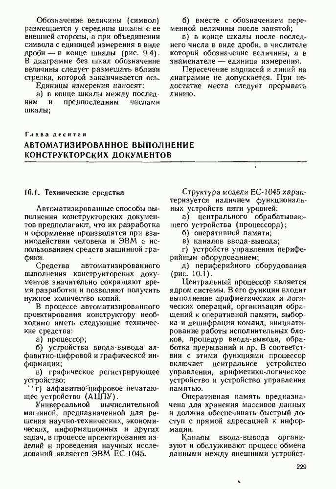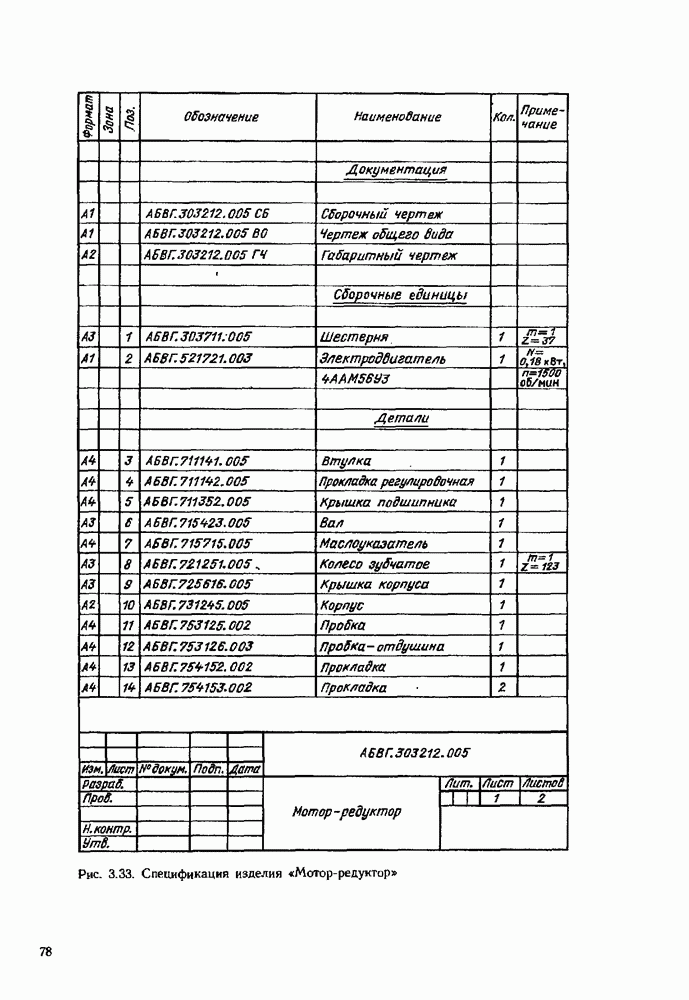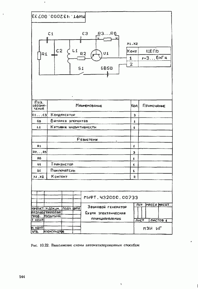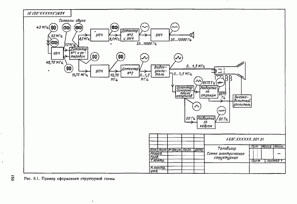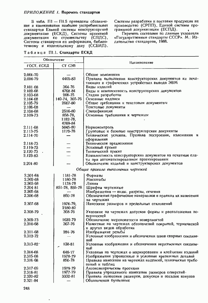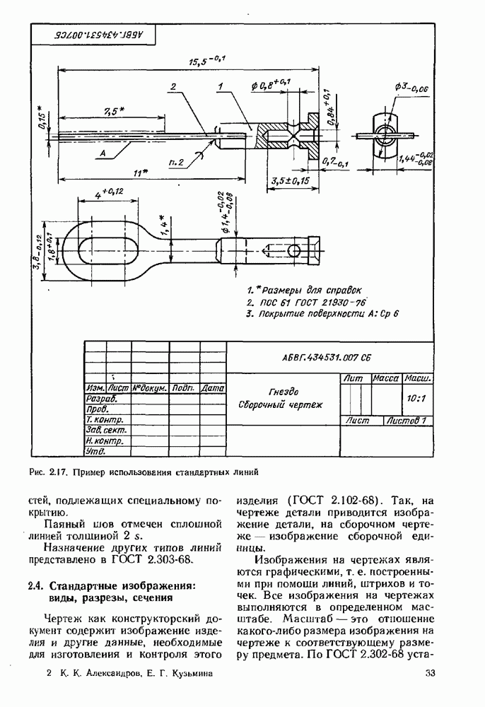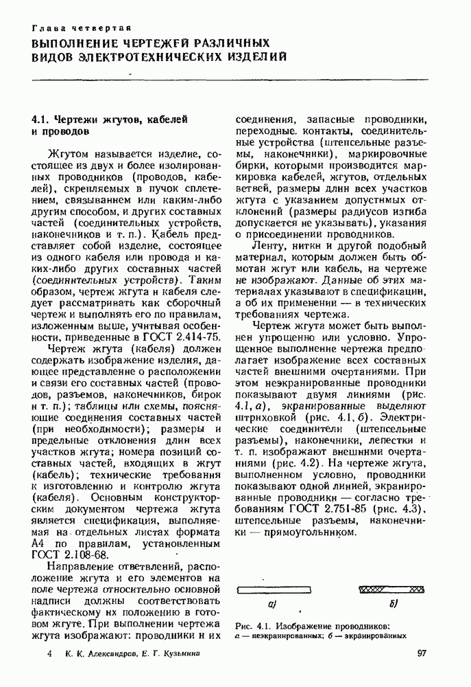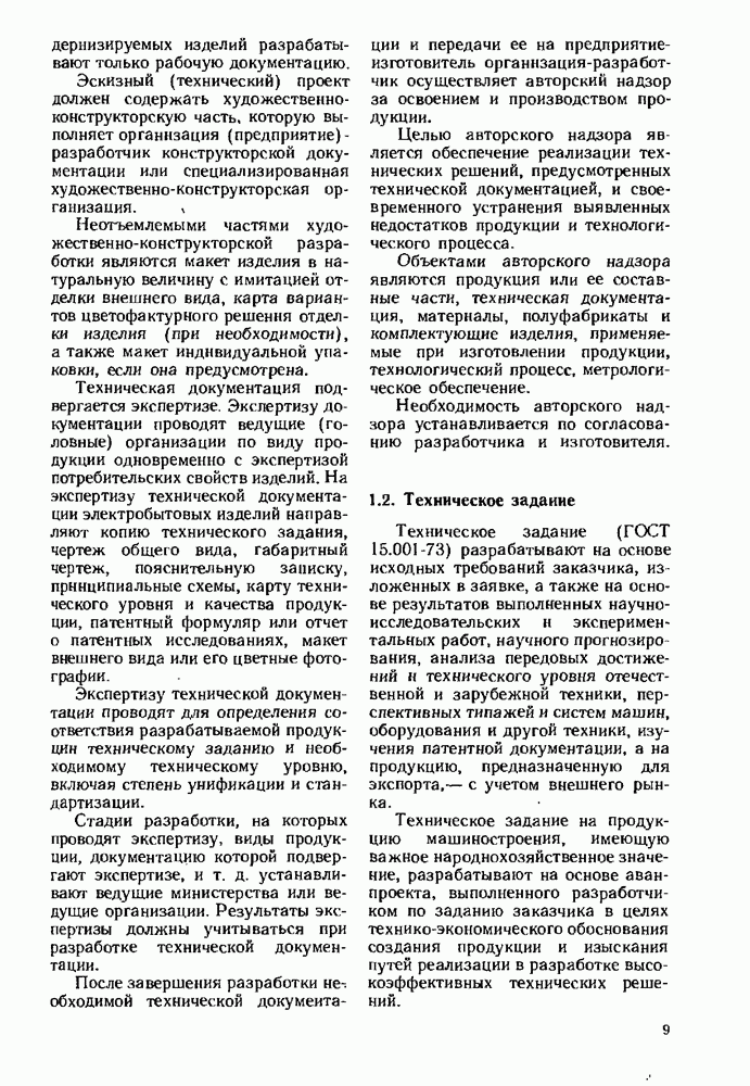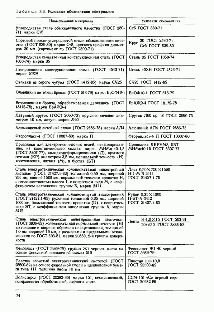 (кликните для просмотра скана) Рис. 1.7. (см. скан) Конструкторский документ—пояснительная записка Сборочный чертеж содержит упрощенное изображение сборочной единицы и другие данные, необходимые для ее изготовления (сборки). На сборочном чертеже (рис, 1.5) составные части сборочной единицы снабжаются полками-выносками, на которых проставляются номера позиций этих составных частей в соответствии с порядковым номером позиции в спецификации. На сборочном чертеже (рис. 1.5) приведены требования по условиям пайки п. 2 и габаритный размер по длине кабеля ВЧ после сборки. Схема представляет собой конструкторский документ, на котором в виде условных графических обозначений показаны составные части изделия, а также связи между ними. В зависимости от входящих в состав изделия элементов и связей между ними схемы подразделяют на следующие виды (ГОСТ 2.701-84): электрические, гидравлические, пневматические, газовые (кроме пневматических), кинематические, вакуумные, оптические, энергетические, деления, комбинированные. Назначение схемы определяет ее Рис. 1.8. (см. скан) Образец текста пояснительной записки тип: структурная, функциональная, принципиальная (полная), соединений (монтажная), подключения, общая, расположения, объединенная. Схема кинематическая принципиальная «Электропривод» (рис. 1.6) содержит: а) изображение схемы, которое состоит из условных графических обозначений элементов, связей между элементами, буквенно-цифровых позиционных обозначений элементов; б) перечень составных элементов схемы, выполненный в виде таблицы. По изображению можно представить передачу и преобразование движения в электроприводе от двигателя до ведомого звена. В перечне составных элементов разъясняются обозначения элементов и приводятся некоторые их параметры. Пояснительная записка (ГОСТ 2.106-68) содержит в общем случае сведения о назначении и области применения проектируемого изделия, техническую характеристику, описание устройства и принципа действия изделия, обоснование принятых при разработке технических решений, технико-экономические показатели. Первым листом пояснительной записки является титульный лист (рис. 1.7), который выполняется на формате А4 и содержит наименование министерства или ведомства, разработавшего документ, код изделия по общесоюзному классификатору продукции (ОКП), грифы согласования и утверждения, наименование изделия, обозначение документа, подписи разработчиков документа, год издания документа. Пример выполнения промежуточной страницы пояснительной записки приведен на рис. 1.8. (см. скан) Расчеты включают эскиз или схему рассчитываемого изделия, задачу расчета, данные для расчета, условия расчета, расчет, заключение. Из других конструкторских документов следует упомянуть: а) теоретический чертеж, который определяет геометрическую форму (обводы) изделия и координаты расположения составных частей; б) габаритный чертеж, содержащий контурное изображение изделия с габаритными, установочными и присоединительными размерами; в) монтажный чертеж, необходимый для монтажа изделия на месте применения. Каждый конструкторский документ имеет код по ГОСТ 2.102-68. Так, чертеж общего вида имеет код