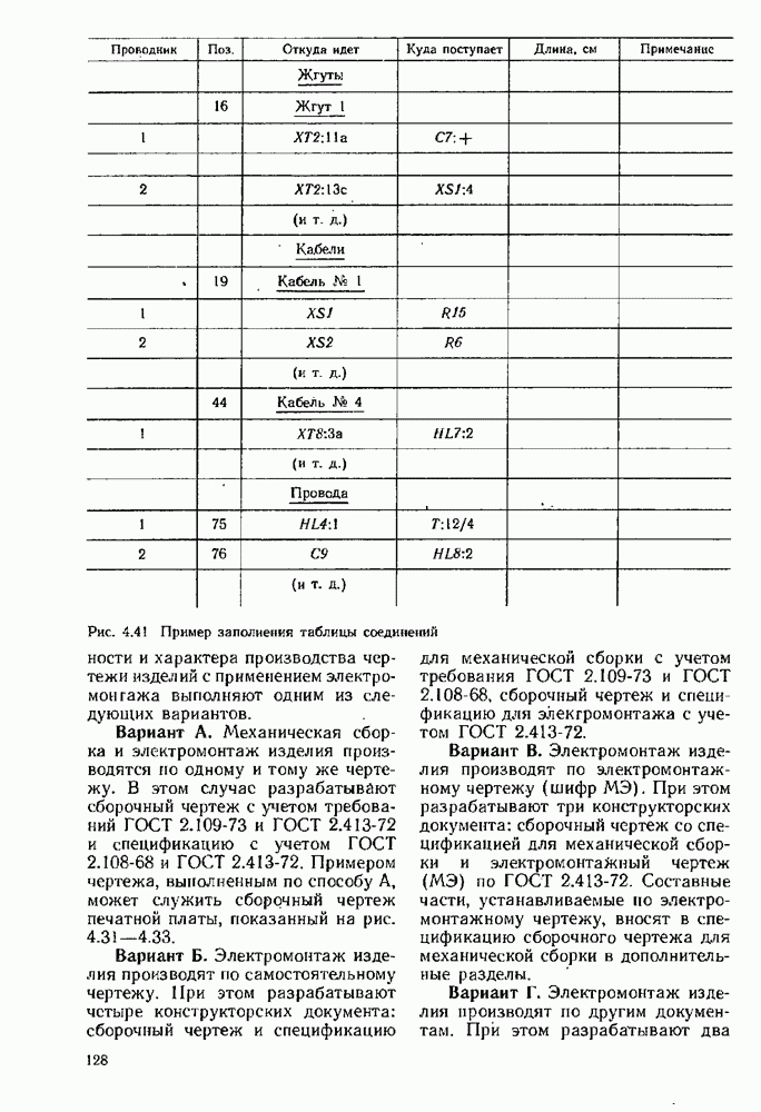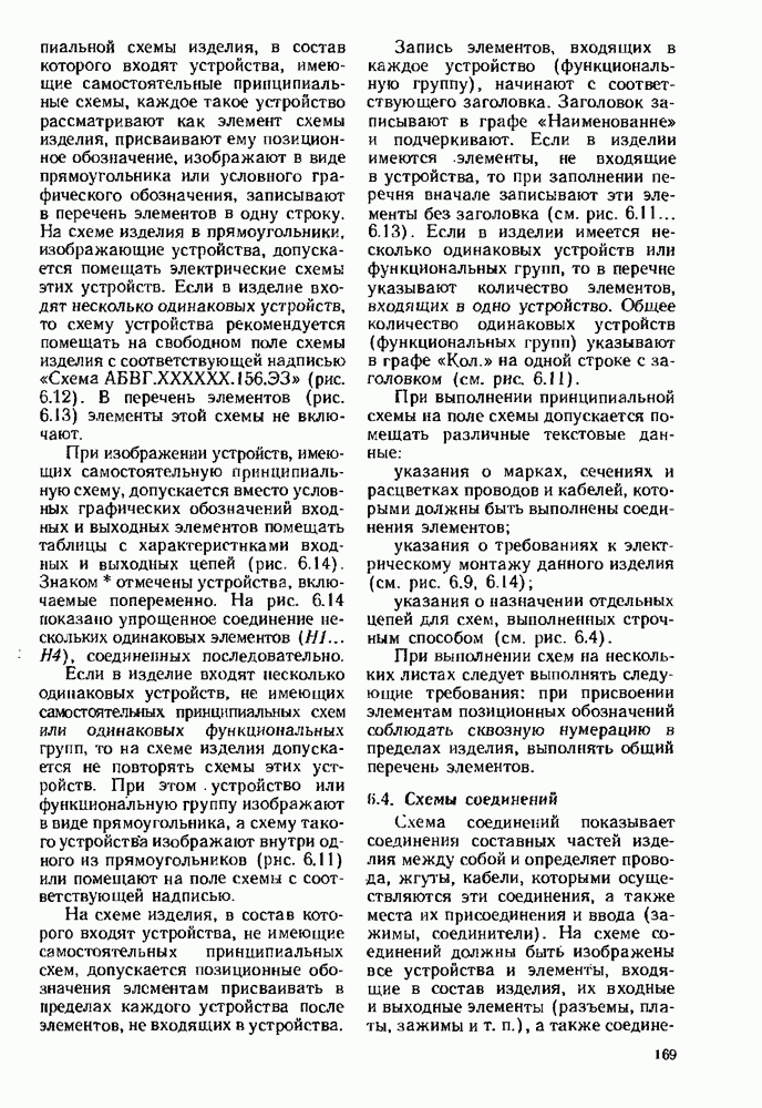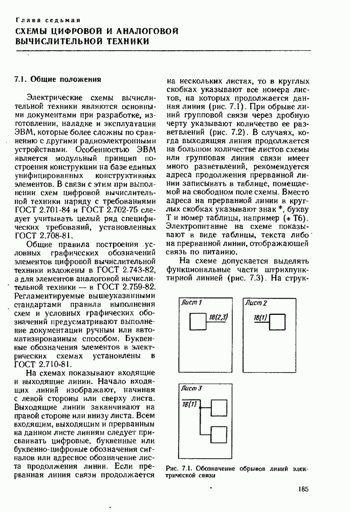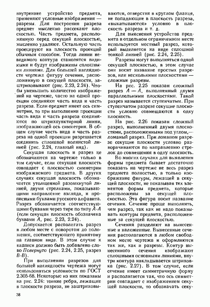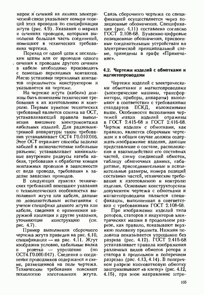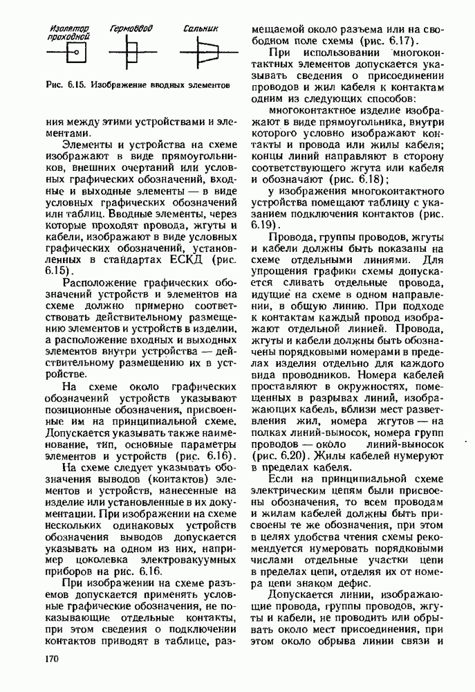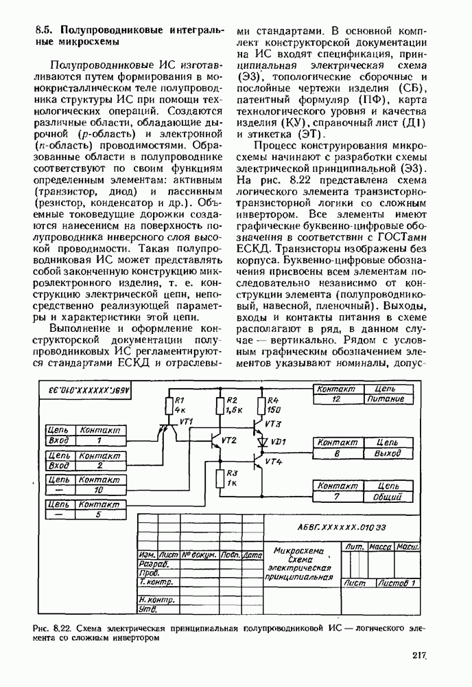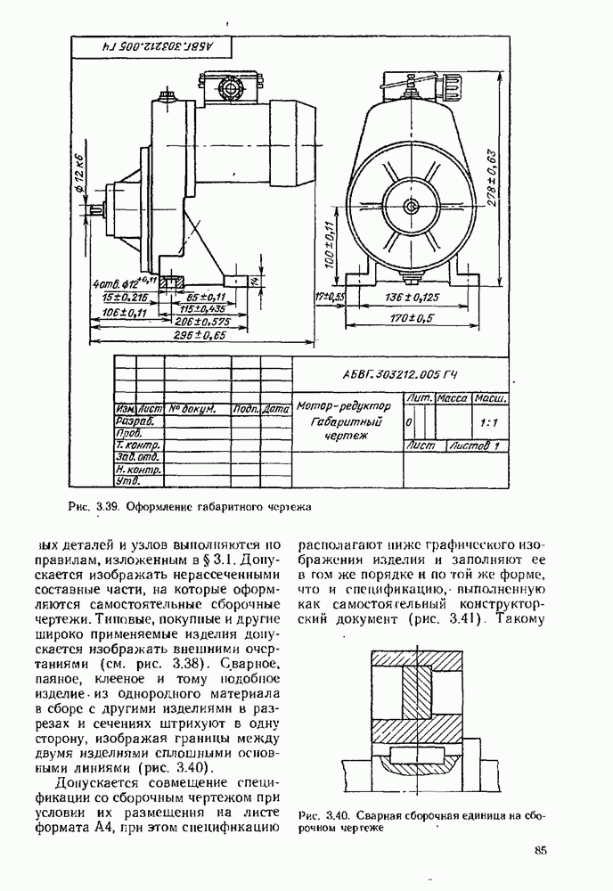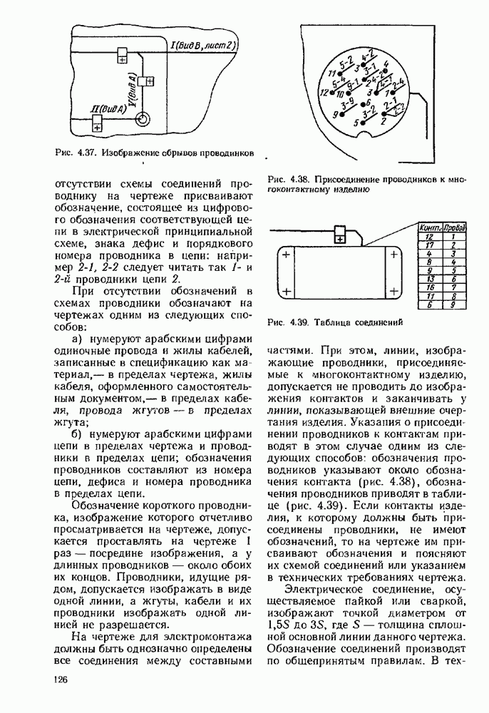 (кликните для просмотра скана) Рис. 1.7. (см. скан) Конструкторский документ—пояснительная записка Сборочный чертеж содержит упрощенное изображение сборочной единицы и другие данные, необходимые для ее изготовления (сборки). На сборочном чертеже (рис, 1.5) составные части сборочной единицы снабжаются полками-выносками, на которых проставляются номера позиций этих составных частей в соответствии с порядковым номером позиции в спецификации. На сборочном чертеже (рис. 1.5) приведены требования по условиям пайки п. 2 и габаритный размер по длине кабеля ВЧ после сборки. Схема представляет собой конструкторский документ, на котором в виде условных графических обозначений показаны составные части изделия, а также связи между ними. В зависимости от входящих в состав изделия элементов и связей между ними схемы подразделяют на следующие виды (ГОСТ 2.701-84): электрические, гидравлические, пневматические, газовые (кроме пневматических), кинематические, вакуумные, оптические, энергетические, деления, комбинированные. Назначение схемы определяет ее Рис. 1.8. (см. скан) Образец текста пояснительной записки тип: структурная, функциональная, принципиальная (полная), соединений (монтажная), подключения, общая, расположения, объединенная. Схема кинематическая принципиальная «Электропривод» (рис. 1.6) содержит: а) изображение схемы, которое состоит из условных графических обозначений элементов, связей между элементами, буквенно-цифровых позиционных обозначений элементов; б) перечень составных элементов схемы, выполненный в виде таблицы. По изображению можно представить передачу и преобразование движения в электроприводе от двигателя до ведомого звена. В перечне составных элементов разъясняются обозначения элементов и приводятся некоторые их параметры. Пояснительная записка (ГОСТ 2.106-68) содержит в общем случае сведения о назначении и области применения проектируемого изделия, техническую характеристику, описание устройства и принципа действия изделия, обоснование принятых при разработке технических решений, технико-экономические показатели. Первым листом пояснительной записки является титульный лист (рис. 1.7), который выполняется на формате А4 и содержит наименование министерства или ведомства, разработавшего документ, код изделия по общесоюзному классификатору продукции (ОКП), грифы согласования и утверждения, наименование изделия, обозначение документа, подписи разработчиков документа, год издания документа. Пример выполнения промежуточной страницы пояснительной записки приведен на рис. 1.8. (см. скан) Расчеты включают эскиз или схему рассчитываемого изделия, задачу расчета, данные для расчета, условия расчета, расчет, заключение. Из других конструкторских документов следует упомянуть: а) теоретический чертеж, который определяет геометрическую форму (обводы) изделия и координаты расположения составных частей; б) габаритный чертеж, содержащий контурное изображение изделия с габаритными, установочными и присоединительными размерами; в) монтажный чертеж, необходимый для монтажа изделия на месте применения. Каждый конструкторский документ имеет код по ГОСТ 2.102-68. Так, чертеж общего вида имеет код