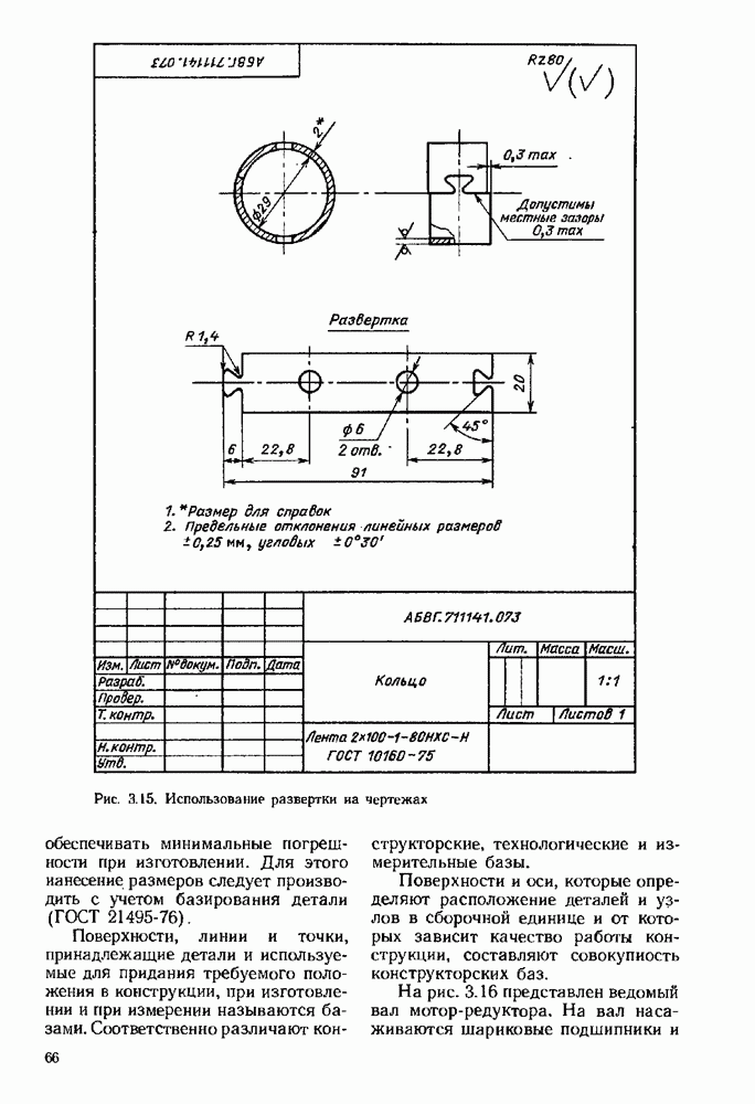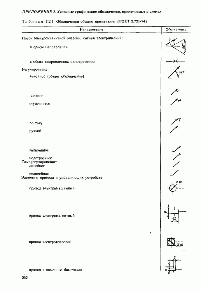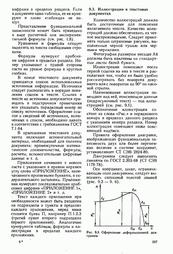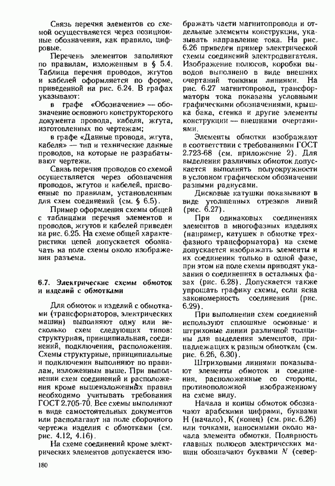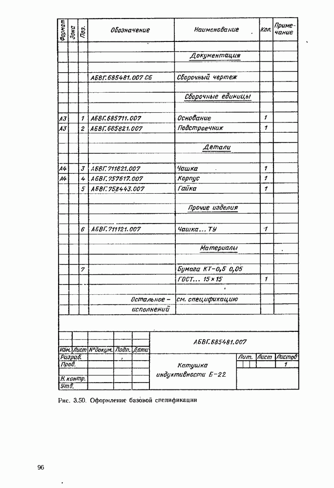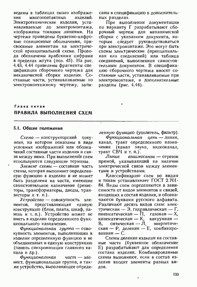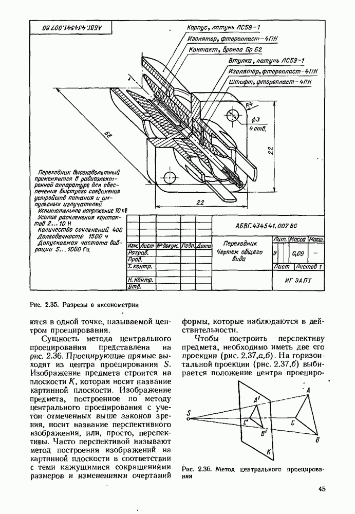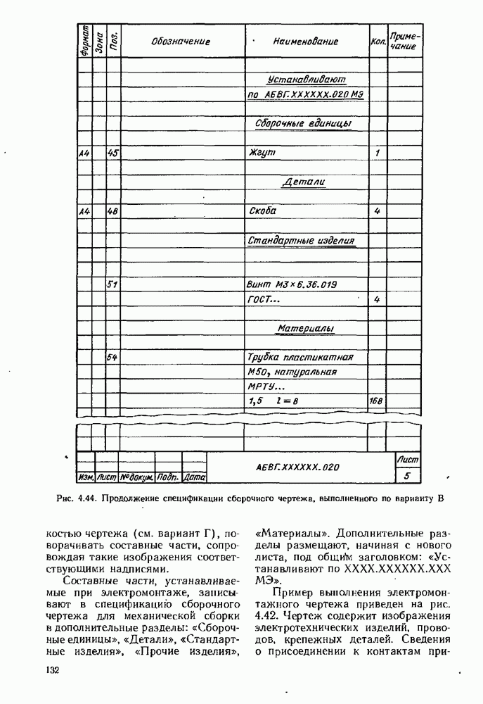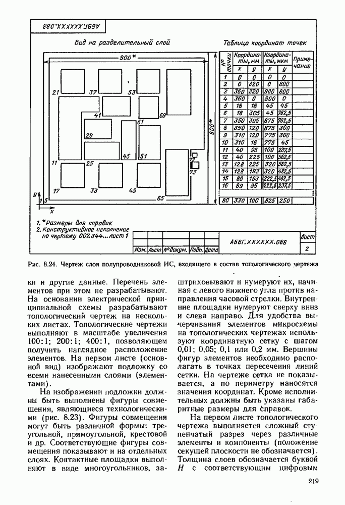 (кликните для просмотра скана) Рис. 1.7. (см. скан) Конструкторский документ—пояснительная записка Сборочный чертеж содержит упрощенное изображение сборочной единицы и другие данные, необходимые для ее изготовления (сборки). На сборочном чертеже (рис, 1.5) составные части сборочной единицы снабжаются полками-выносками, на которых проставляются номера позиций этих составных частей в соответствии с порядковым номером позиции в спецификации. На сборочном чертеже (рис. 1.5) приведены требования по условиям пайки п. 2 и габаритный размер по длине кабеля ВЧ после сборки. Схема представляет собой конструкторский документ, на котором в виде условных графических обозначений показаны составные части изделия, а также связи между ними. В зависимости от входящих в состав изделия элементов и связей между ними схемы подразделяют на следующие виды (ГОСТ 2.701-84): электрические, гидравлические, пневматические, газовые (кроме пневматических), кинематические, вакуумные, оптические, энергетические, деления, комбинированные. Назначение схемы определяет ее Рис. 1.8. (см. скан) Образец текста пояснительной записки тип: структурная, функциональная, принципиальная (полная), соединений (монтажная), подключения, общая, расположения, объединенная. Схема кинематическая принципиальная «Электропривод» (рис. 1.6) содержит: а) изображение схемы, которое состоит из условных графических обозначений элементов, связей между элементами, буквенно-цифровых позиционных обозначений элементов; б) перечень составных элементов схемы, выполненный в виде таблицы. По изображению можно представить передачу и преобразование движения в электроприводе от двигателя до ведомого звена. В перечне составных элементов разъясняются обозначения элементов и приводятся некоторые их параметры. Пояснительная записка (ГОСТ 2.106-68) содержит в общем случае сведения о назначении и области применения проектируемого изделия, техническую характеристику, описание устройства и принципа действия изделия, обоснование принятых при разработке технических решений, технико-экономические показатели. Первым листом пояснительной записки является титульный лист (рис. 1.7), который выполняется на формате А4 и содержит наименование министерства или ведомства, разработавшего документ, код изделия по общесоюзному классификатору продукции (ОКП), грифы согласования и утверждения, наименование изделия, обозначение документа, подписи разработчиков документа, год издания документа. Пример выполнения промежуточной страницы пояснительной записки приведен на рис. 1.8. (см. скан) Расчеты включают эскиз или схему рассчитываемого изделия, задачу расчета, данные для расчета, условия расчета, расчет, заключение. Из других конструкторских документов следует упомянуть: а) теоретический чертеж, который определяет геометрическую форму (обводы) изделия и координаты расположения составных частей; б) габаритный чертеж, содержащий контурное изображение изделия с габаритными, установочными и присоединительными размерами; в) монтажный чертеж, необходимый для монтажа изделия на месте применения. Каждый конструкторский документ имеет код по ГОСТ 2.102-68. Так, чертеж общего вида имеет код