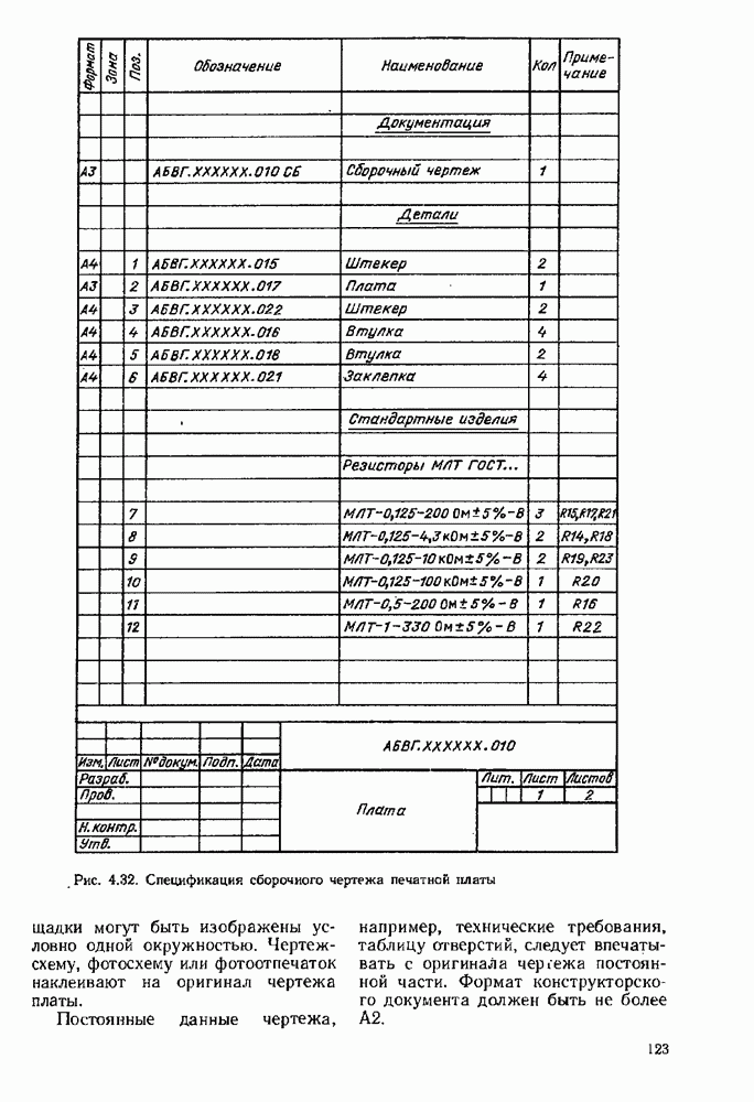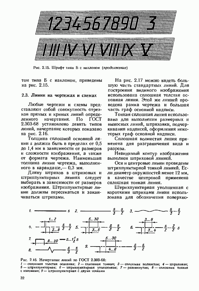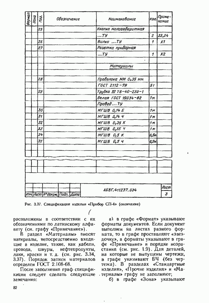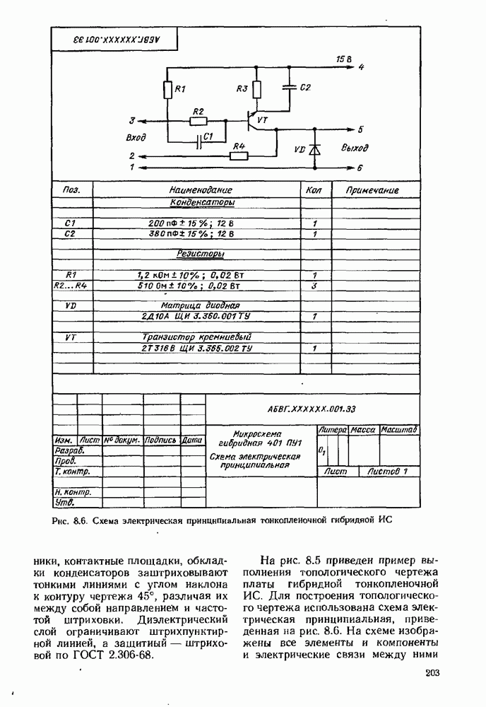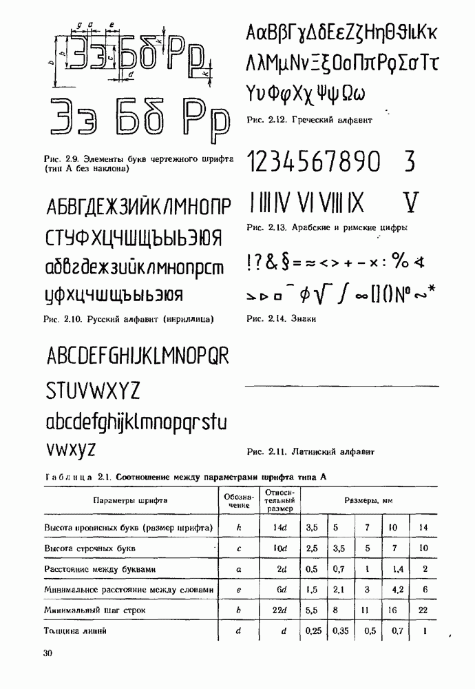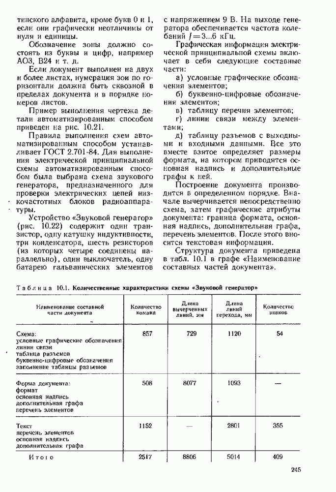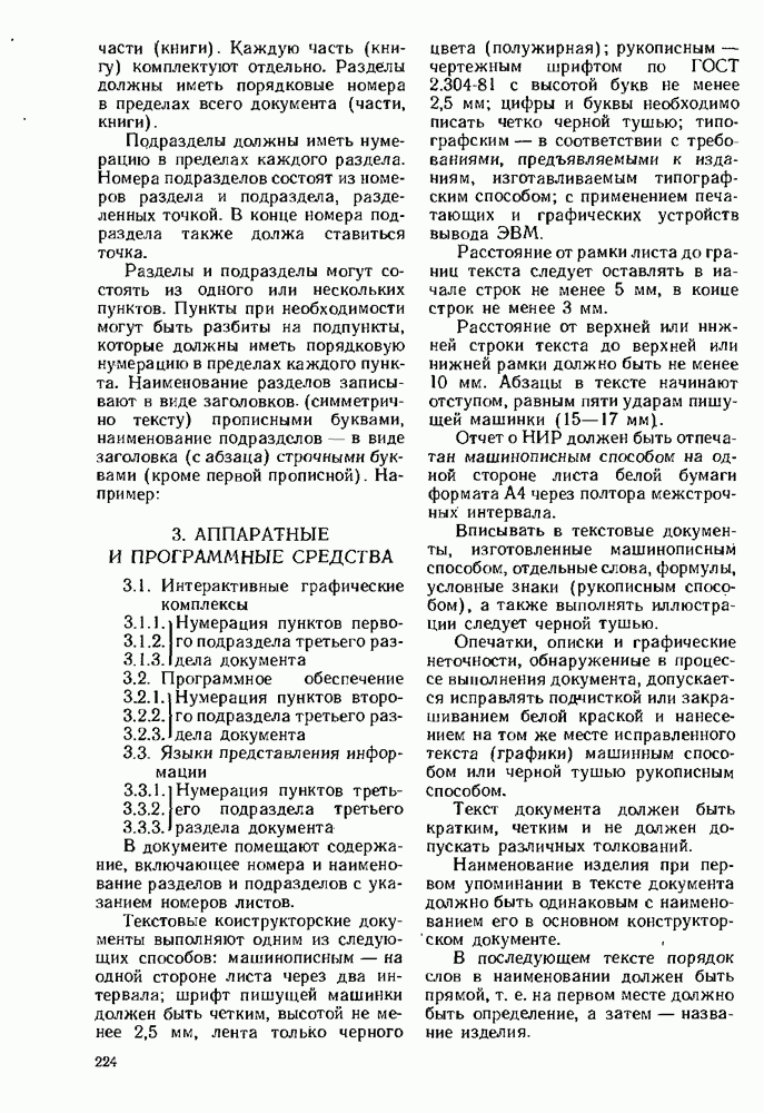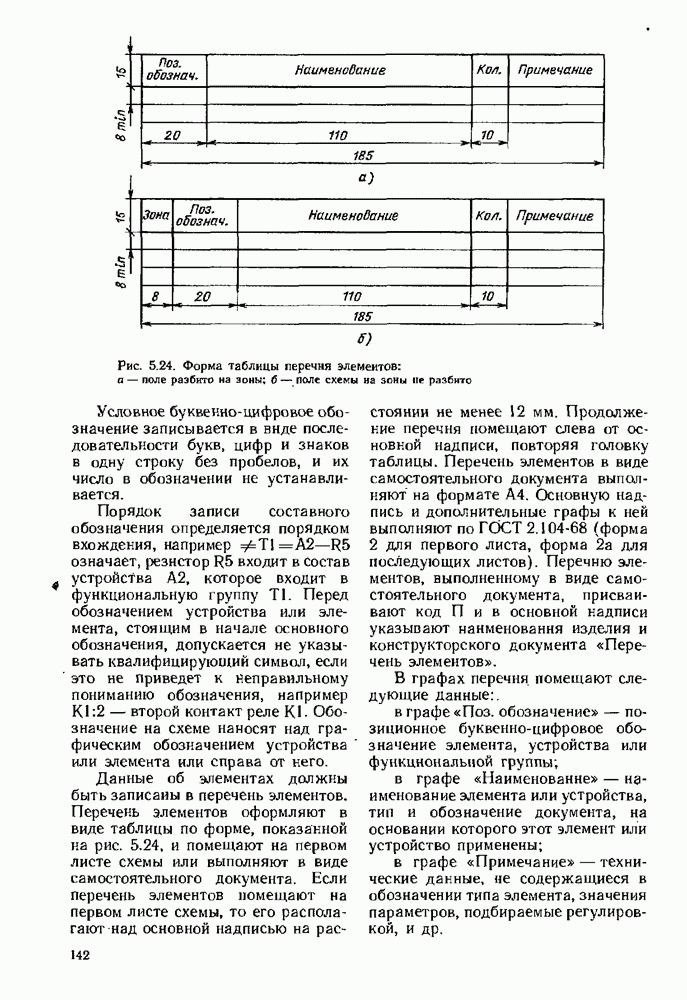 (кликните для просмотра скана) Рис. 1.7. (см. скан) Конструкторский документ—пояснительная записка Сборочный чертеж содержит упрощенное изображение сборочной единицы и другие данные, необходимые для ее изготовления (сборки). На сборочном чертеже (рис, 1.5) составные части сборочной единицы снабжаются полками-выносками, на которых проставляются номера позиций этих составных частей в соответствии с порядковым номером позиции в спецификации. На сборочном чертеже (рис. 1.5) приведены требования по условиям пайки п. 2 и габаритный размер по длине кабеля ВЧ после сборки. Схема представляет собой конструкторский документ, на котором в виде условных графических обозначений показаны составные части изделия, а также связи между ними. В зависимости от входящих в состав изделия элементов и связей между ними схемы подразделяют на следующие виды (ГОСТ 2.701-84): электрические, гидравлические, пневматические, газовые (кроме пневматических), кинематические, вакуумные, оптические, энергетические, деления, комбинированные. Назначение схемы определяет ее Рис. 1.8. (см. скан) Образец текста пояснительной записки тип: структурная, функциональная, принципиальная (полная), соединений (монтажная), подключения, общая, расположения, объединенная. Схема кинематическая принципиальная «Электропривод» (рис. 1.6) содержит: а) изображение схемы, которое состоит из условных графических обозначений элементов, связей между элементами, буквенно-цифровых позиционных обозначений элементов; б) перечень составных элементов схемы, выполненный в виде таблицы. По изображению можно представить передачу и преобразование движения в электроприводе от двигателя до ведомого звена. В перечне составных элементов разъясняются обозначения элементов и приводятся некоторые их параметры. Пояснительная записка (ГОСТ 2.106-68) содержит в общем случае сведения о назначении и области применения проектируемого изделия, техническую характеристику, описание устройства и принципа действия изделия, обоснование принятых при разработке технических решений, технико-экономические показатели. Первым листом пояснительной записки является титульный лист (рис. 1.7), который выполняется на формате А4 и содержит наименование министерства или ведомства, разработавшего документ, код изделия по общесоюзному классификатору продукции (ОКП), грифы согласования и утверждения, наименование изделия, обозначение документа, подписи разработчиков документа, год издания документа. Пример выполнения промежуточной страницы пояснительной записки приведен на рис. 1.8. (см. скан) Расчеты включают эскиз или схему рассчитываемого изделия, задачу расчета, данные для расчета, условия расчета, расчет, заключение. Из других конструкторских документов следует упомянуть: а) теоретический чертеж, который определяет геометрическую форму (обводы) изделия и координаты расположения составных частей; б) габаритный чертеж, содержащий контурное изображение изделия с габаритными, установочными и присоединительными размерами; в) монтажный чертеж, необходимый для монтажа изделия на месте применения. Каждый конструкторский документ имеет код по ГОСТ 2.102-68. Так, чертеж общего вида имеет код