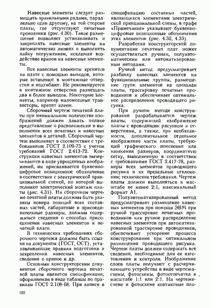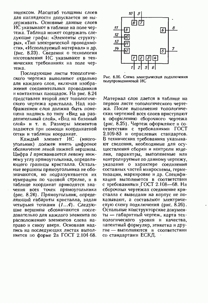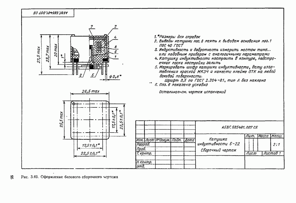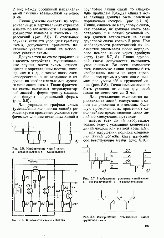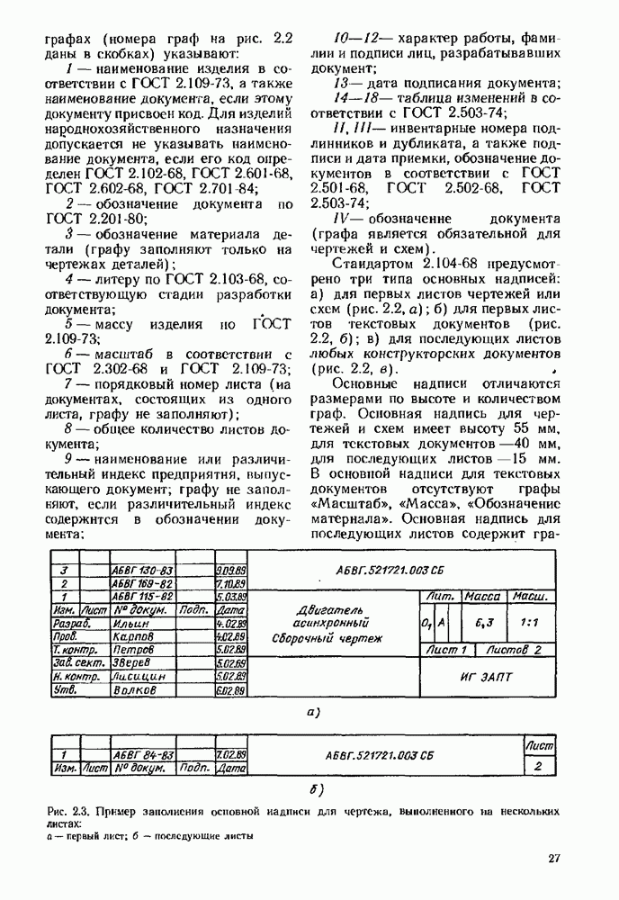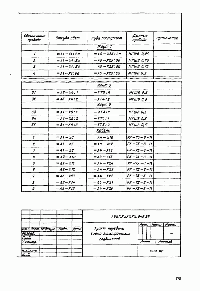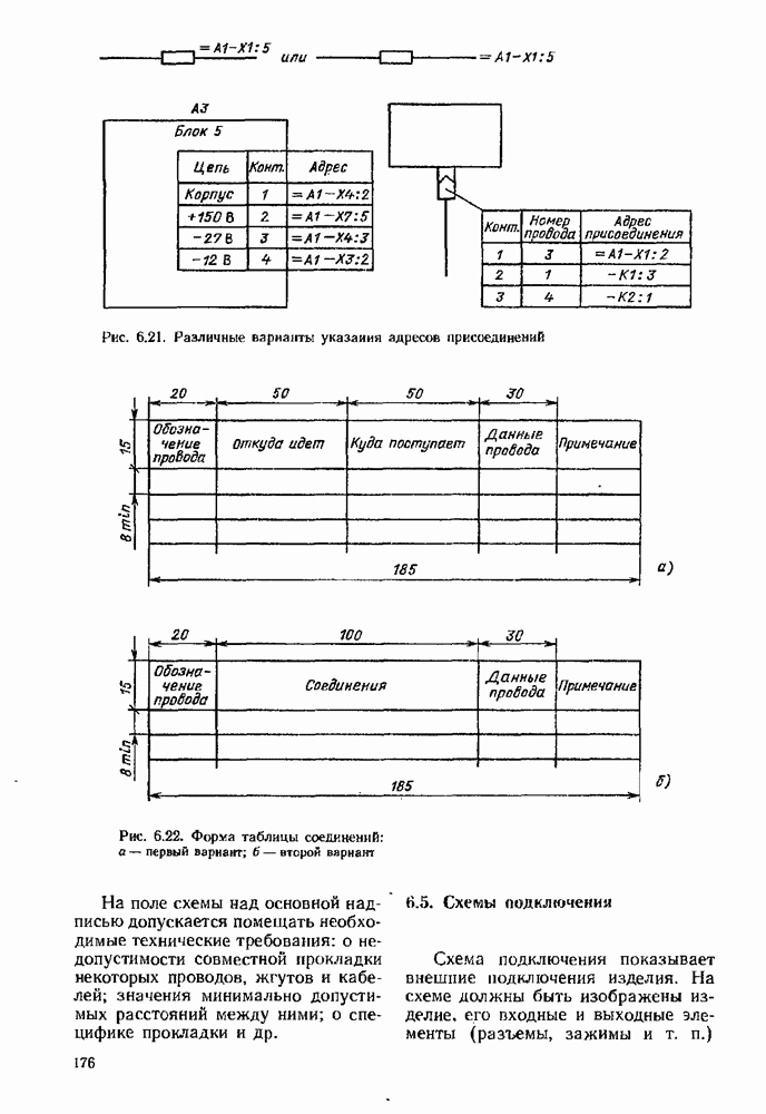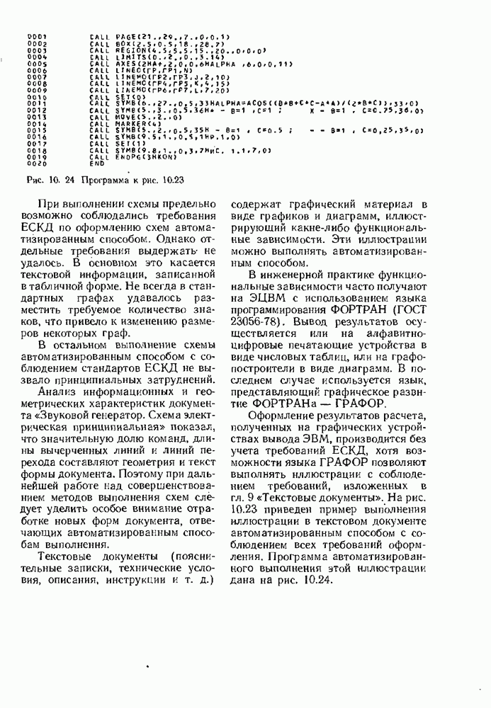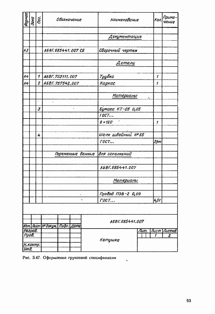 (кликните для просмотра скана) Рис. 1.7. (см. скан) Конструкторский документ—пояснительная записка Сборочный чертеж содержит упрощенное изображение сборочной единицы и другие данные, необходимые для ее изготовления (сборки). На сборочном чертеже (рис, 1.5) составные части сборочной единицы снабжаются полками-выносками, на которых проставляются номера позиций этих составных частей в соответствии с порядковым номером позиции в спецификации. На сборочном чертеже (рис. 1.5) приведены требования по условиям пайки п. 2 и габаритный размер по длине кабеля ВЧ после сборки. Схема представляет собой конструкторский документ, на котором в виде условных графических обозначений показаны составные части изделия, а также связи между ними. В зависимости от входящих в состав изделия элементов и связей между ними схемы подразделяют на следующие виды (ГОСТ 2.701-84): электрические, гидравлические, пневматические, газовые (кроме пневматических), кинематические, вакуумные, оптические, энергетические, деления, комбинированные. Назначение схемы определяет ее Рис. 1.8. (см. скан) Образец текста пояснительной записки тип: структурная, функциональная, принципиальная (полная), соединений (монтажная), подключения, общая, расположения, объединенная. Схема кинематическая принципиальная «Электропривод» (рис. 1.6) содержит: а) изображение схемы, которое состоит из условных графических обозначений элементов, связей между элементами, буквенно-цифровых позиционных обозначений элементов; б) перечень составных элементов схемы, выполненный в виде таблицы. По изображению можно представить передачу и преобразование движения в электроприводе от двигателя до ведомого звена. В перечне составных элементов разъясняются обозначения элементов и приводятся некоторые их параметры. Пояснительная записка (ГОСТ 2.106-68) содержит в общем случае сведения о назначении и области применения проектируемого изделия, техническую характеристику, описание устройства и принципа действия изделия, обоснование принятых при разработке технических решений, технико-экономические показатели. Первым листом пояснительной записки является титульный лист (рис. 1.7), который выполняется на формате А4 и содержит наименование министерства или ведомства, разработавшего документ, код изделия по общесоюзному классификатору продукции (ОКП), грифы согласования и утверждения, наименование изделия, обозначение документа, подписи разработчиков документа, год издания документа. Пример выполнения промежуточной страницы пояснительной записки приведен на рис. 1.8. (см. скан) Расчеты включают эскиз или схему рассчитываемого изделия, задачу расчета, данные для расчета, условия расчета, расчет, заключение. Из других конструкторских документов следует упомянуть: а) теоретический чертеж, который определяет геометрическую форму (обводы) изделия и координаты расположения составных частей; б) габаритный чертеж, содержащий контурное изображение изделия с габаритными, установочными и присоединительными размерами; в) монтажный чертеж, необходимый для монтажа изделия на месте применения. Каждый конструкторский документ имеет код по ГОСТ 2.102-68. Так, чертеж общего вида имеет код