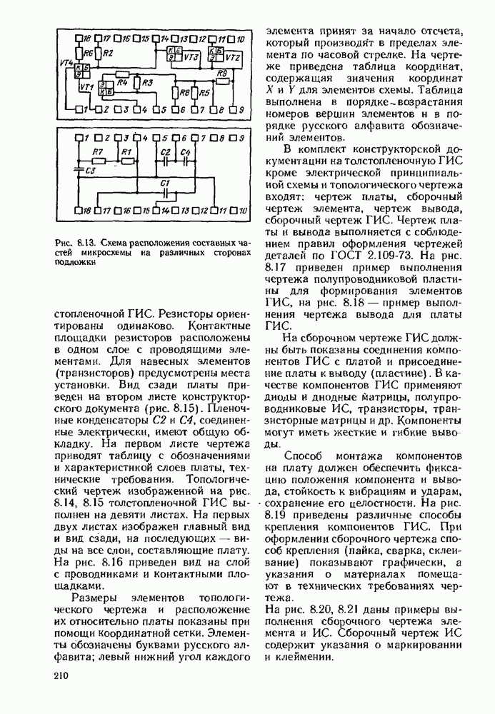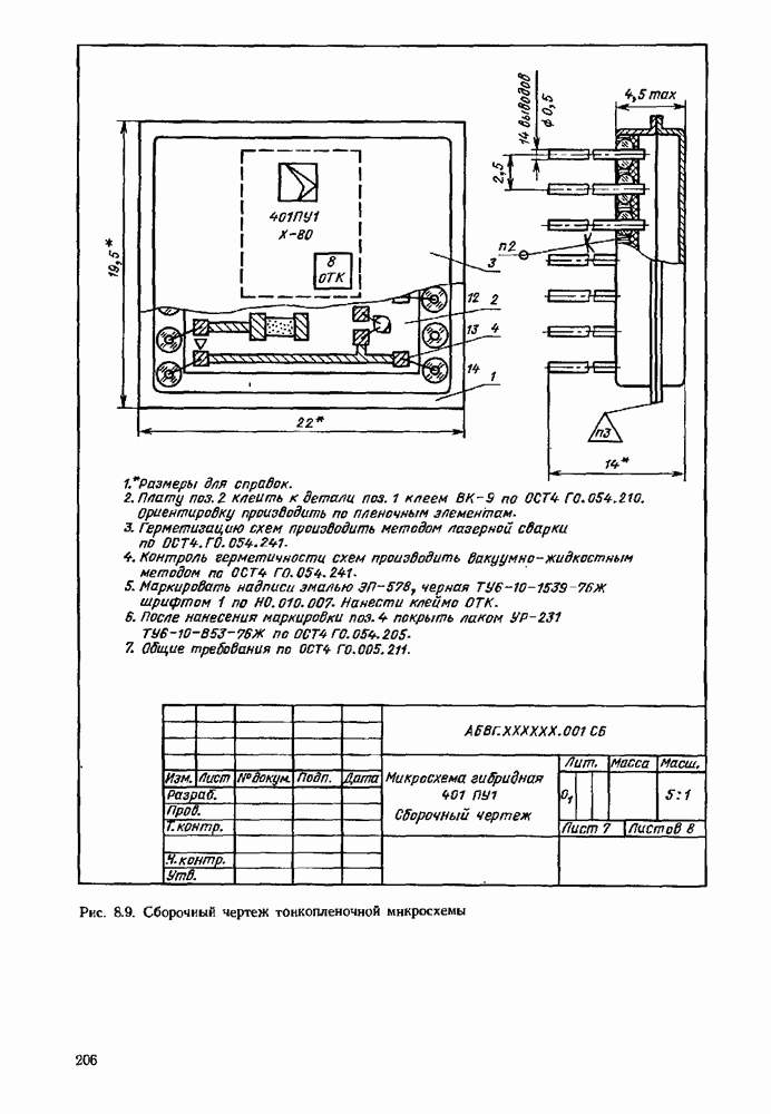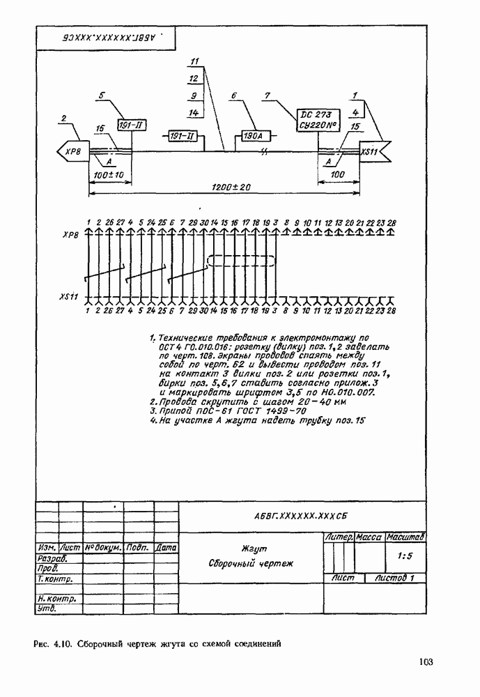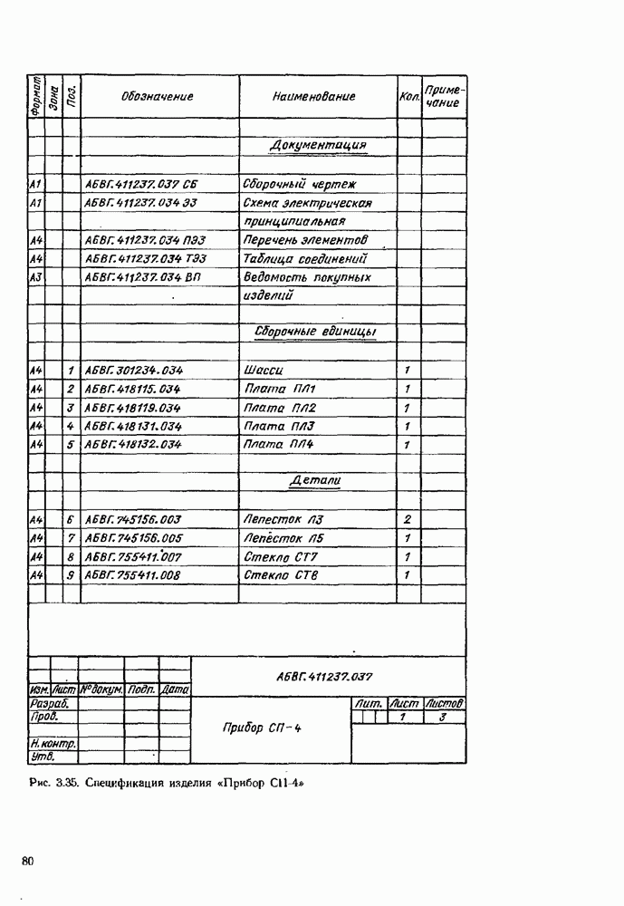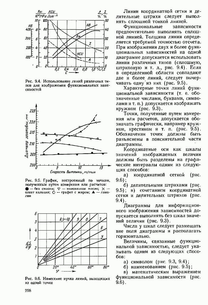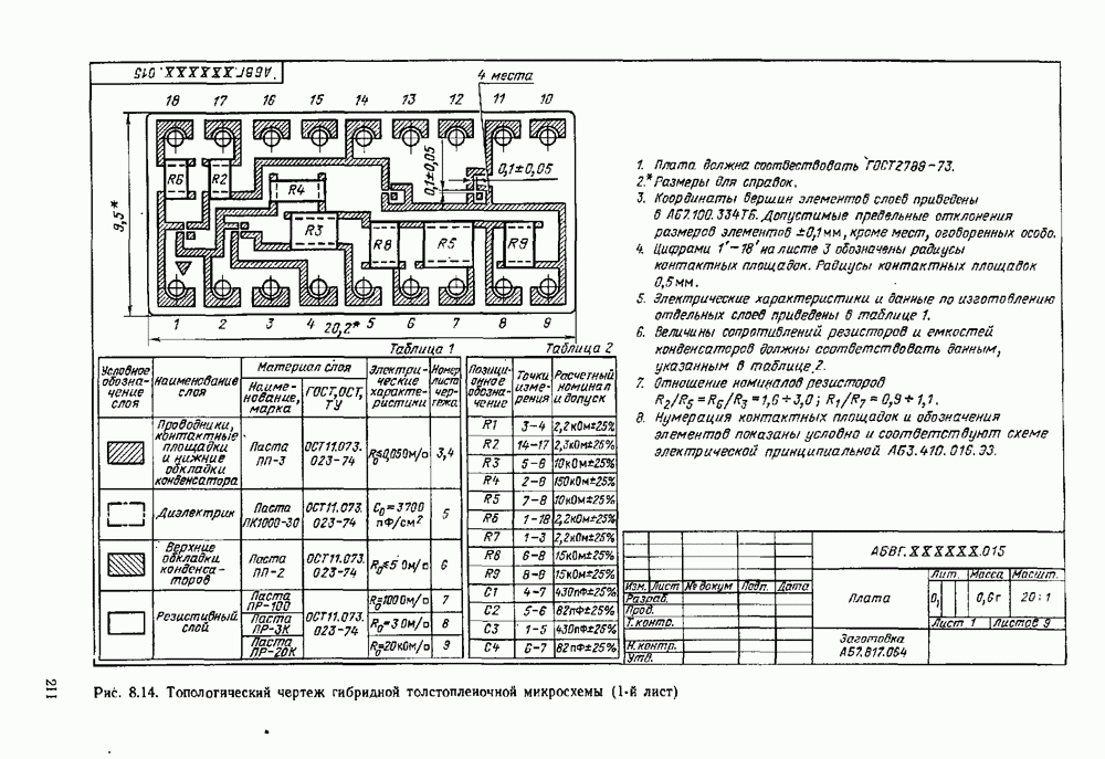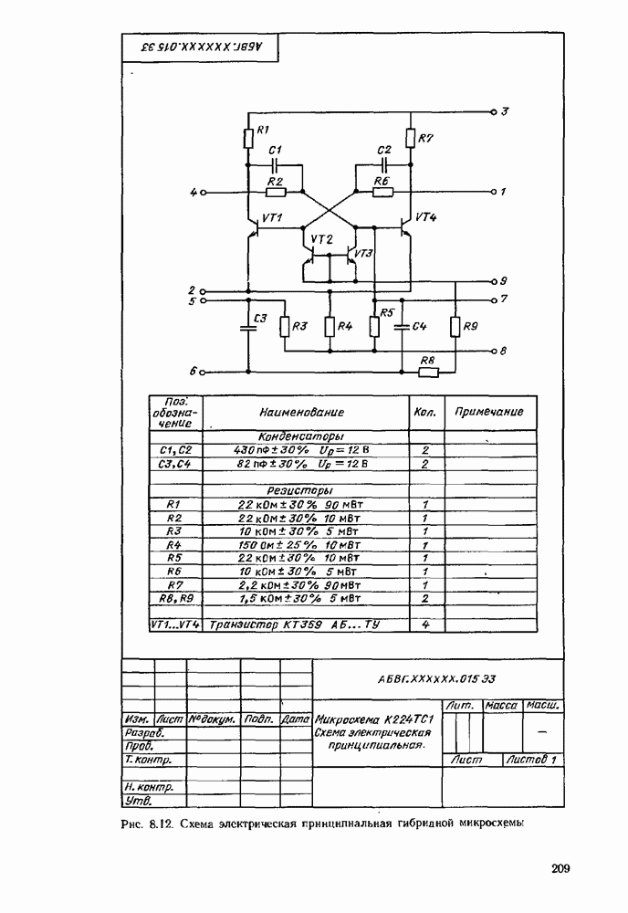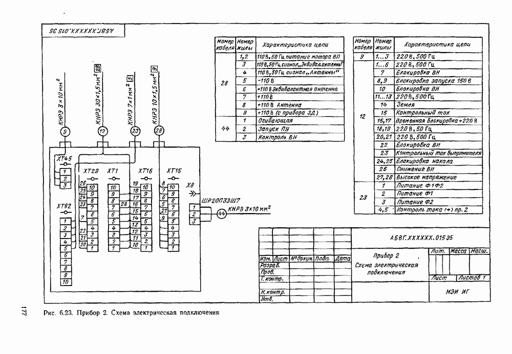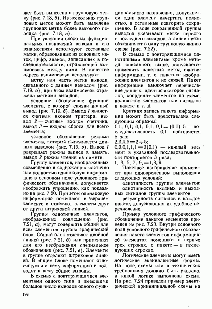 (кликните для просмотра скана) Рис. 1.7. (см. скан) Конструкторский документ—пояснительная записка Сборочный чертеж содержит упрощенное изображение сборочной единицы и другие данные, необходимые для ее изготовления (сборки). На сборочном чертеже (рис, 1.5) составные части сборочной единицы снабжаются полками-выносками, на которых проставляются номера позиций этих составных частей в соответствии с порядковым номером позиции в спецификации. На сборочном чертеже (рис. 1.5) приведены требования по условиям пайки п. 2 и габаритный размер по длине кабеля ВЧ после сборки. Схема представляет собой конструкторский документ, на котором в виде условных графических обозначений показаны составные части изделия, а также связи между ними. В зависимости от входящих в состав изделия элементов и связей между ними схемы подразделяют на следующие виды (ГОСТ 2.701-84): электрические, гидравлические, пневматические, газовые (кроме пневматических), кинематические, вакуумные, оптические, энергетические, деления, комбинированные. Назначение схемы определяет ее Рис. 1.8. (см. скан) Образец текста пояснительной записки тип: структурная, функциональная, принципиальная (полная), соединений (монтажная), подключения, общая, расположения, объединенная. Схема кинематическая принципиальная «Электропривод» (рис. 1.6) содержит: а) изображение схемы, которое состоит из условных графических обозначений элементов, связей между элементами, буквенно-цифровых позиционных обозначений элементов; б) перечень составных элементов схемы, выполненный в виде таблицы. По изображению можно представить передачу и преобразование движения в электроприводе от двигателя до ведомого звена. В перечне составных элементов разъясняются обозначения элементов и приводятся некоторые их параметры. Пояснительная записка (ГОСТ 2.106-68) содержит в общем случае сведения о назначении и области применения проектируемого изделия, техническую характеристику, описание устройства и принципа действия изделия, обоснование принятых при разработке технических решений, технико-экономические показатели. Первым листом пояснительной записки является титульный лист (рис. 1.7), который выполняется на формате А4 и содержит наименование министерства или ведомства, разработавшего документ, код изделия по общесоюзному классификатору продукции (ОКП), грифы согласования и утверждения, наименование изделия, обозначение документа, подписи разработчиков документа, год издания документа. Пример выполнения промежуточной страницы пояснительной записки приведен на рис. 1.8. (см. скан) Расчеты включают эскиз или схему рассчитываемого изделия, задачу расчета, данные для расчета, условия расчета, расчет, заключение. Из других конструкторских документов следует упомянуть: а) теоретический чертеж, который определяет геометрическую форму (обводы) изделия и координаты расположения составных частей; б) габаритный чертеж, содержащий контурное изображение изделия с габаритными, установочными и присоединительными размерами; в) монтажный чертеж, необходимый для монтажа изделия на месте применения. Каждый конструкторский документ имеет код по ГОСТ 2.102-68. Так, чертеж общего вида имеет код