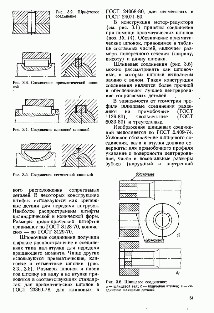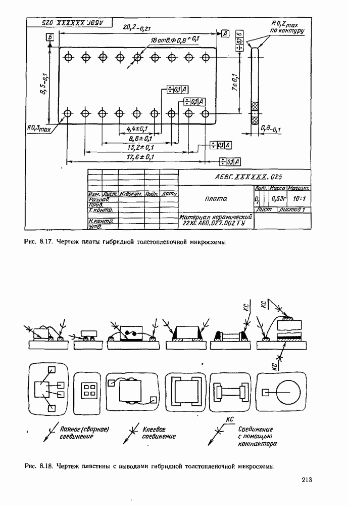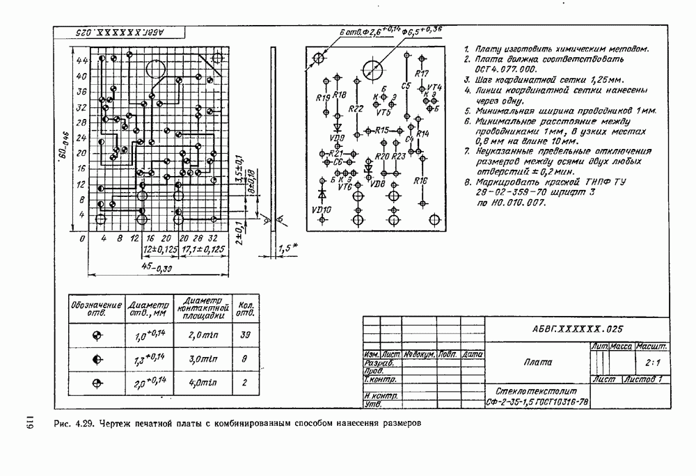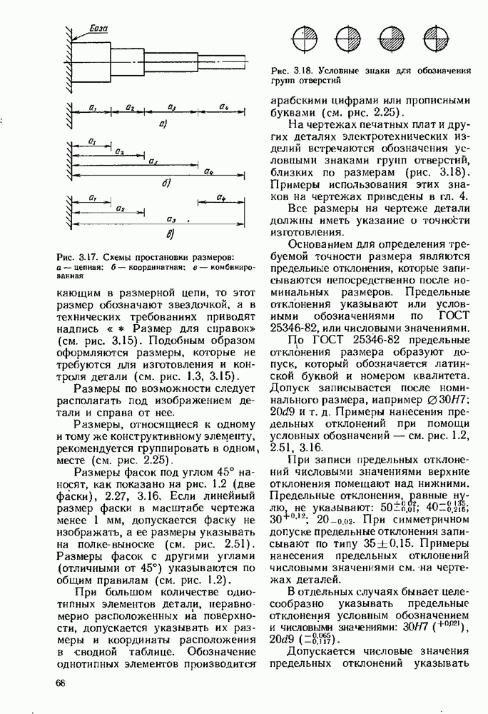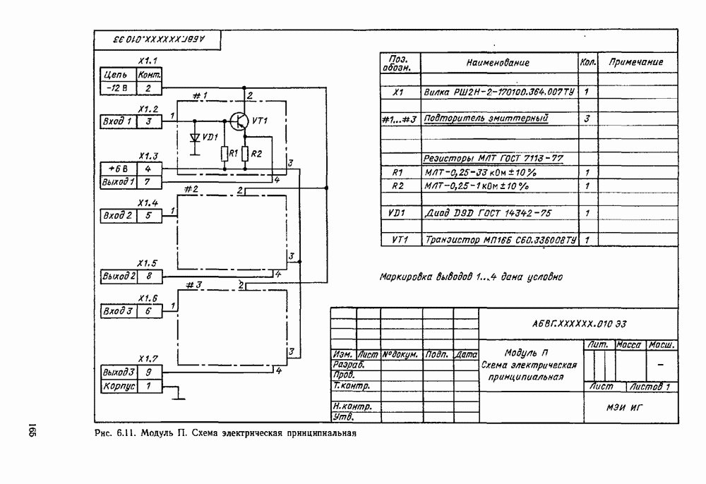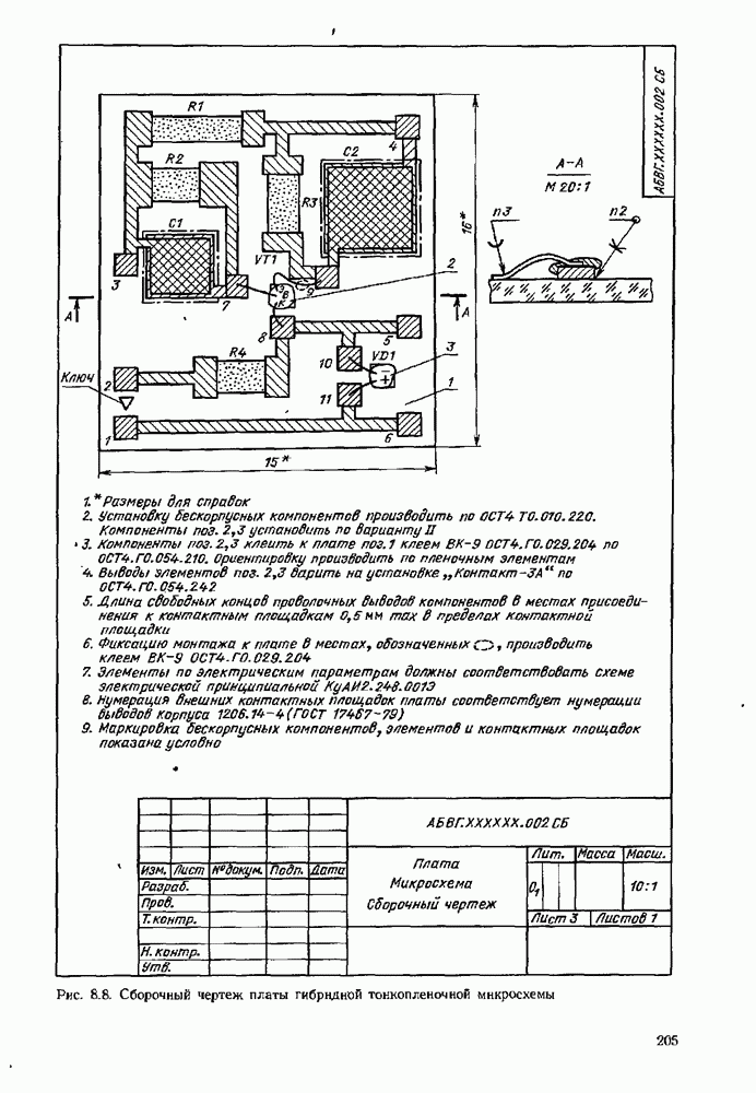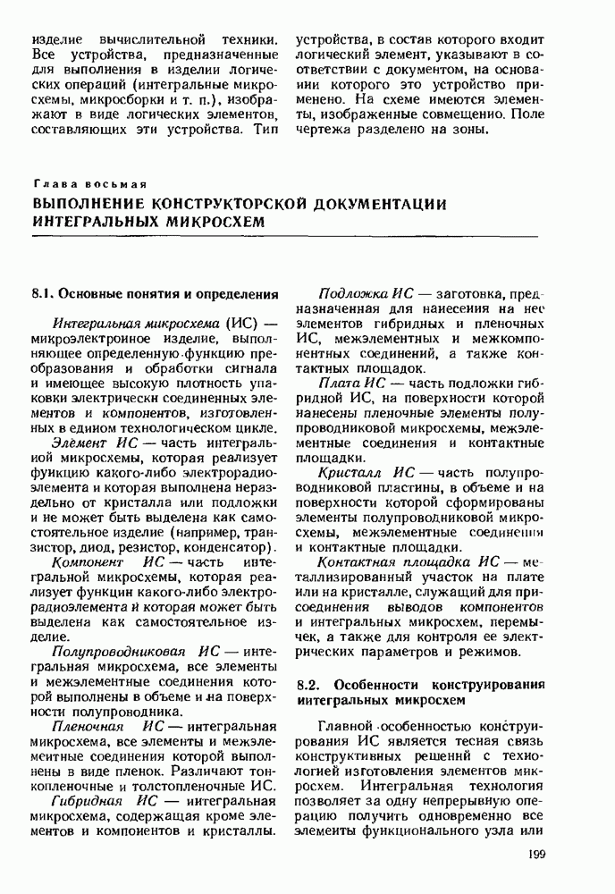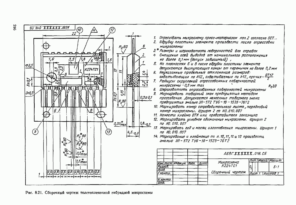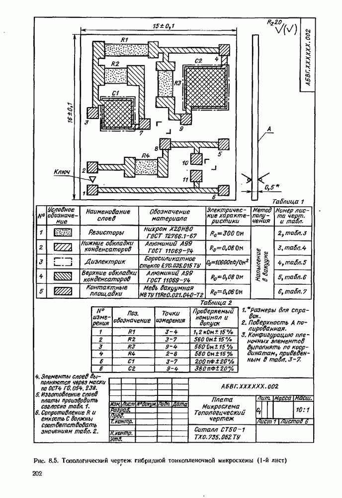 (кликните для просмотра скана) Рис. 1.7. (см. скан) Конструкторский документ—пояснительная записка Сборочный чертеж содержит упрощенное изображение сборочной единицы и другие данные, необходимые для ее изготовления (сборки). На сборочном чертеже (рис, 1.5) составные части сборочной единицы снабжаются полками-выносками, на которых проставляются номера позиций этих составных частей в соответствии с порядковым номером позиции в спецификации. На сборочном чертеже (рис. 1.5) приведены требования по условиям пайки п. 2 и габаритный размер по длине кабеля ВЧ после сборки. Схема представляет собой конструкторский документ, на котором в виде условных графических обозначений показаны составные части изделия, а также связи между ними. В зависимости от входящих в состав изделия элементов и связей между ними схемы подразделяют на следующие виды (ГОСТ 2.701-84): электрические, гидравлические, пневматические, газовые (кроме пневматических), кинематические, вакуумные, оптические, энергетические, деления, комбинированные. Назначение схемы определяет ее Рис. 1.8. (см. скан) Образец текста пояснительной записки тип: структурная, функциональная, принципиальная (полная), соединений (монтажная), подключения, общая, расположения, объединенная. Схема кинематическая принципиальная «Электропривод» (рис. 1.6) содержит: а) изображение схемы, которое состоит из условных графических обозначений элементов, связей между элементами, буквенно-цифровых позиционных обозначений элементов; б) перечень составных элементов схемы, выполненный в виде таблицы. По изображению можно представить передачу и преобразование движения в электроприводе от двигателя до ведомого звена. В перечне составных элементов разъясняются обозначения элементов и приводятся некоторые их параметры. Пояснительная записка (ГОСТ 2.106-68) содержит в общем случае сведения о назначении и области применения проектируемого изделия, техническую характеристику, описание устройства и принципа действия изделия, обоснование принятых при разработке технических решений, технико-экономические показатели. Первым листом пояснительной записки является титульный лист (рис. 1.7), который выполняется на формате А4 и содержит наименование министерства или ведомства, разработавшего документ, код изделия по общесоюзному классификатору продукции (ОКП), грифы согласования и утверждения, наименование изделия, обозначение документа, подписи разработчиков документа, год издания документа. Пример выполнения промежуточной страницы пояснительной записки приведен на рис. 1.8. (см. скан) Расчеты включают эскиз или схему рассчитываемого изделия, задачу расчета, данные для расчета, условия расчета, расчет, заключение. Из других конструкторских документов следует упомянуть: а) теоретический чертеж, который определяет геометрическую форму (обводы) изделия и координаты расположения составных частей; б) габаритный чертеж, содержащий контурное изображение изделия с габаритными, установочными и присоединительными размерами; в) монтажный чертеж, необходимый для монтажа изделия на месте применения. Каждый конструкторский документ имеет код по ГОСТ 2.102-68. Так, чертеж общего вида имеет код