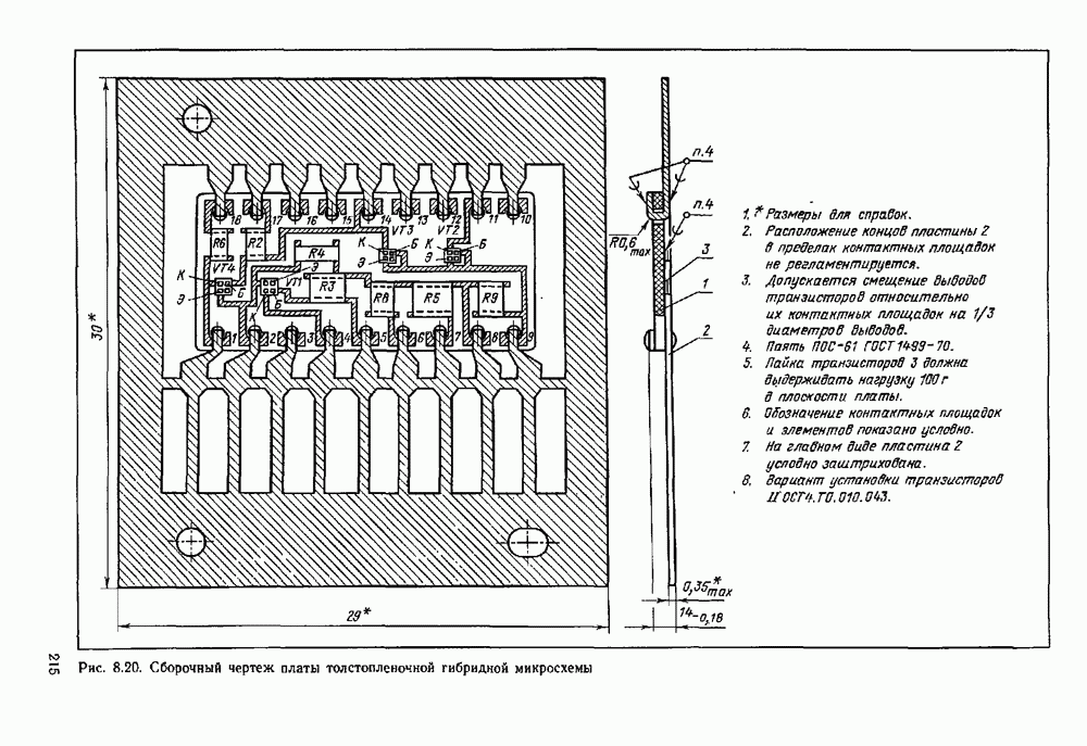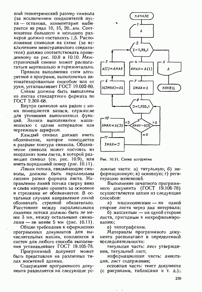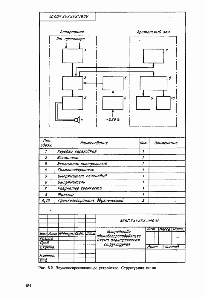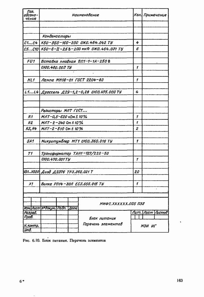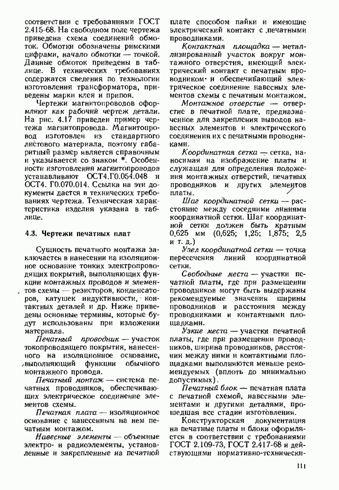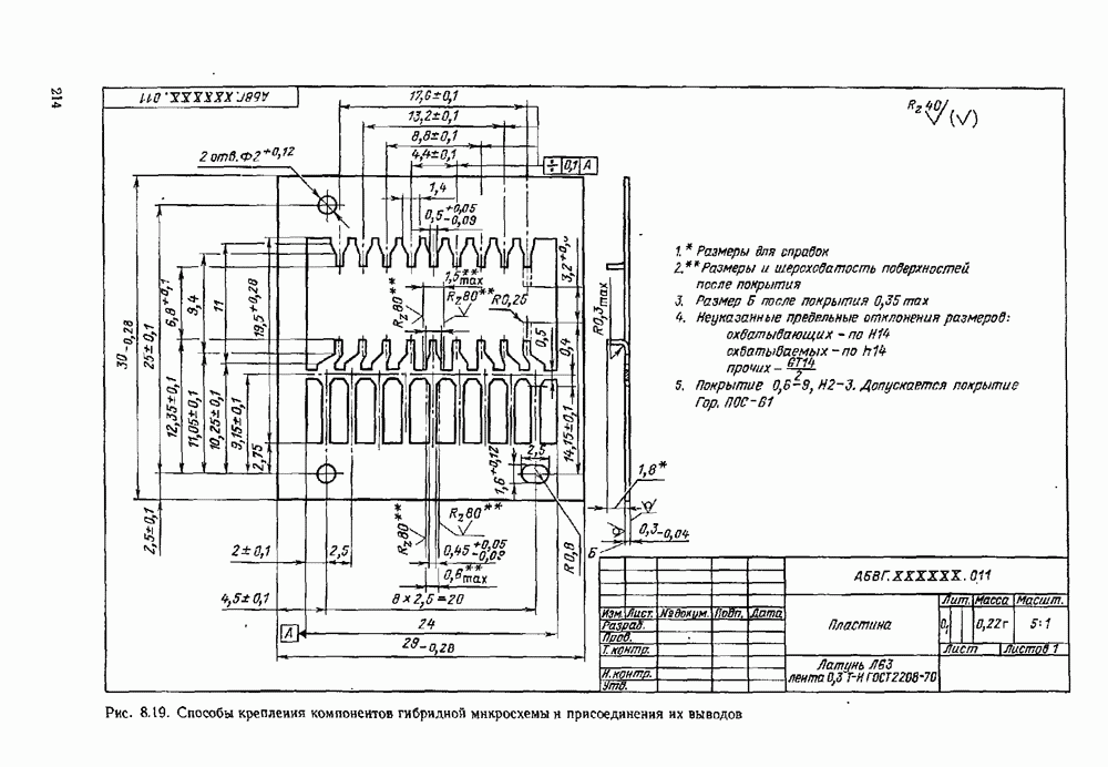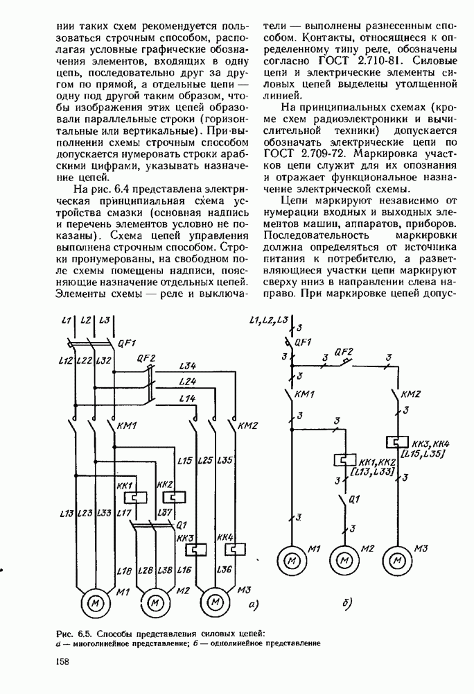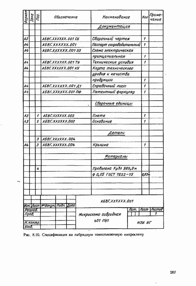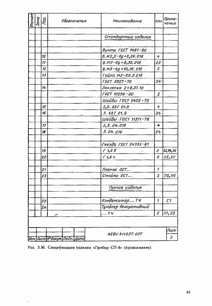 (кликните для просмотра скана) Рис. 1.7. (см. скан) Конструкторский документ—пояснительная записка Сборочный чертеж содержит упрощенное изображение сборочной единицы и другие данные, необходимые для ее изготовления (сборки). На сборочном чертеже (рис, 1.5) составные части сборочной единицы снабжаются полками-выносками, на которых проставляются номера позиций этих составных частей в соответствии с порядковым номером позиции в спецификации. На сборочном чертеже (рис. 1.5) приведены требования по условиям пайки п. 2 и габаритный размер по длине кабеля ВЧ после сборки. Схема представляет собой конструкторский документ, на котором в виде условных графических обозначений показаны составные части изделия, а также связи между ними. В зависимости от входящих в состав изделия элементов и связей между ними схемы подразделяют на следующие виды (ГОСТ 2.701-84): электрические, гидравлические, пневматические, газовые (кроме пневматических), кинематические, вакуумные, оптические, энергетические, деления, комбинированные. Назначение схемы определяет ее Рис. 1.8. (см. скан) Образец текста пояснительной записки тип: структурная, функциональная, принципиальная (полная), соединений (монтажная), подключения, общая, расположения, объединенная. Схема кинематическая принципиальная «Электропривод» (рис. 1.6) содержит: а) изображение схемы, которое состоит из условных графических обозначений элементов, связей между элементами, буквенно-цифровых позиционных обозначений элементов; б) перечень составных элементов схемы, выполненный в виде таблицы. По изображению можно представить передачу и преобразование движения в электроприводе от двигателя до ведомого звена. В перечне составных элементов разъясняются обозначения элементов и приводятся некоторые их параметры. Пояснительная записка (ГОСТ 2.106-68) содержит в общем случае сведения о назначении и области применения проектируемого изделия, техническую характеристику, описание устройства и принципа действия изделия, обоснование принятых при разработке технических решений, технико-экономические показатели. Первым листом пояснительной записки является титульный лист (рис. 1.7), который выполняется на формате А4 и содержит наименование министерства или ведомства, разработавшего документ, код изделия по общесоюзному классификатору продукции (ОКП), грифы согласования и утверждения, наименование изделия, обозначение документа, подписи разработчиков документа, год издания документа. Пример выполнения промежуточной страницы пояснительной записки приведен на рис. 1.8. (см. скан) Расчеты включают эскиз или схему рассчитываемого изделия, задачу расчета, данные для расчета, условия расчета, расчет, заключение. Из других конструкторских документов следует упомянуть: а) теоретический чертеж, который определяет геометрическую форму (обводы) изделия и координаты расположения составных частей; б) габаритный чертеж, содержащий контурное изображение изделия с габаритными, установочными и присоединительными размерами; в) монтажный чертеж, необходимый для монтажа изделия на месте применения. Каждый конструкторский документ имеет код по ГОСТ 2.102-68. Так, чертеж общего вида имеет код