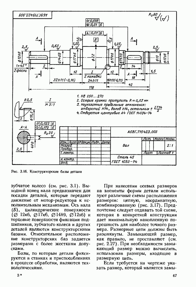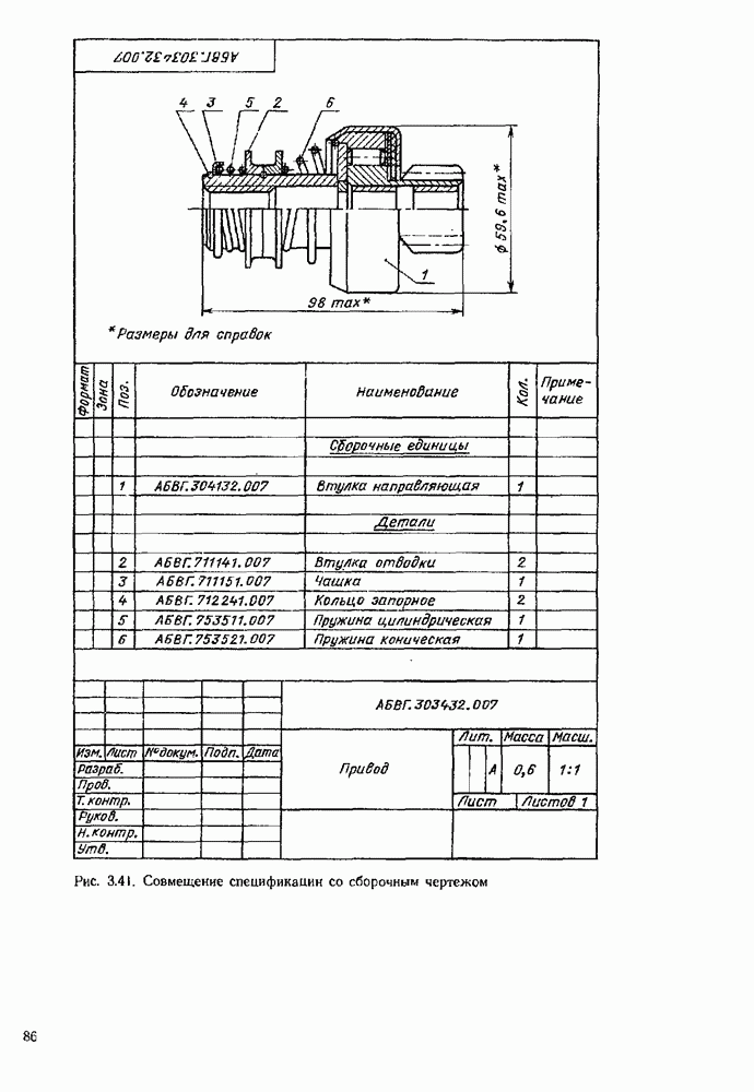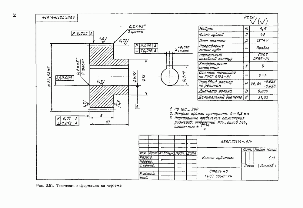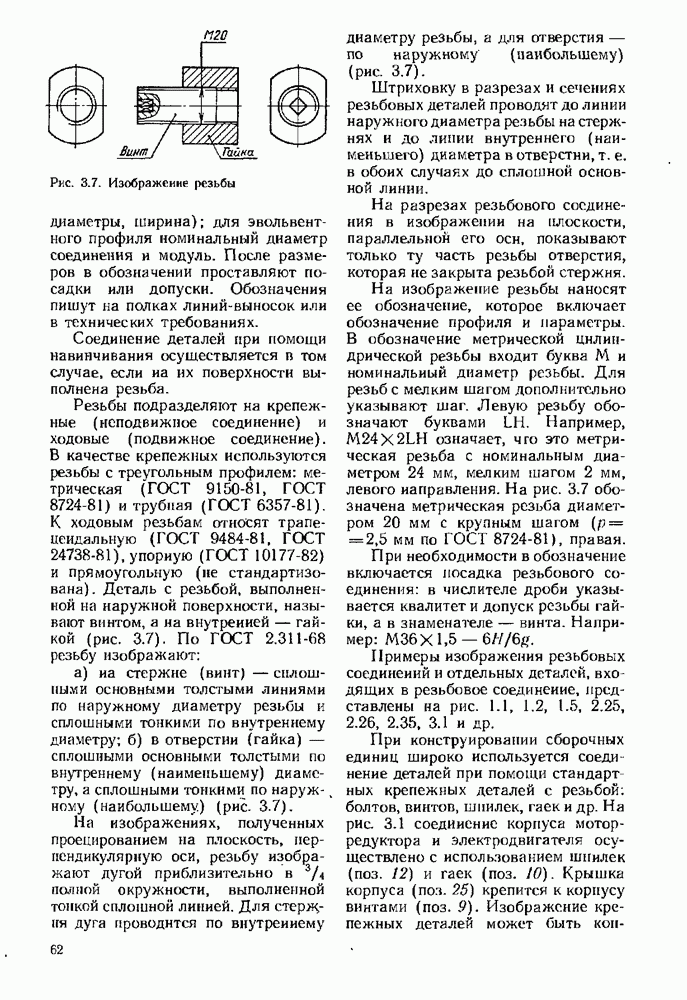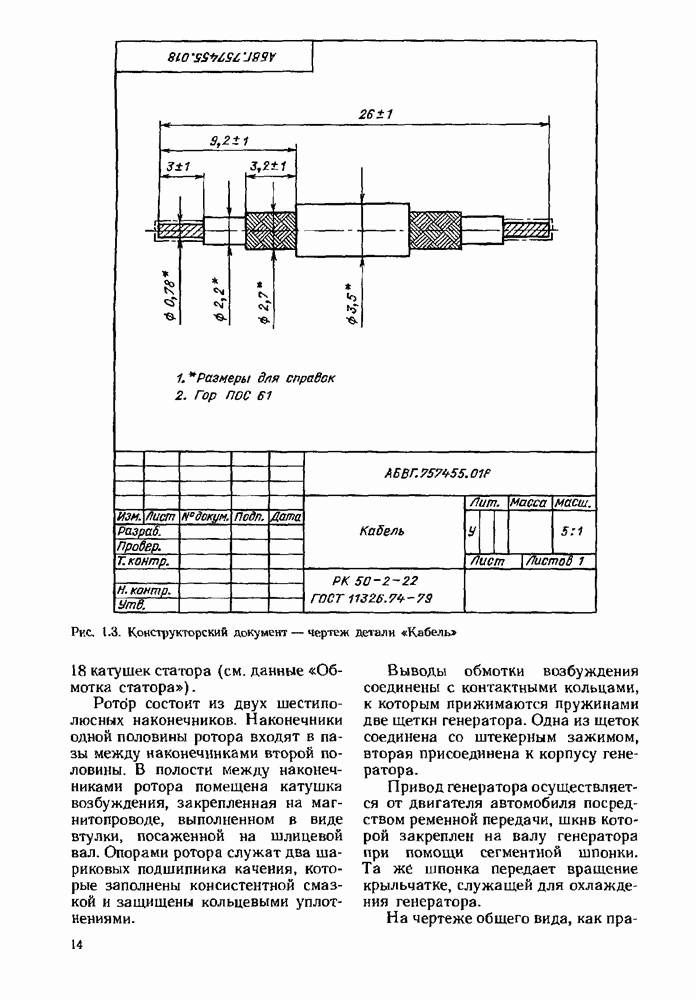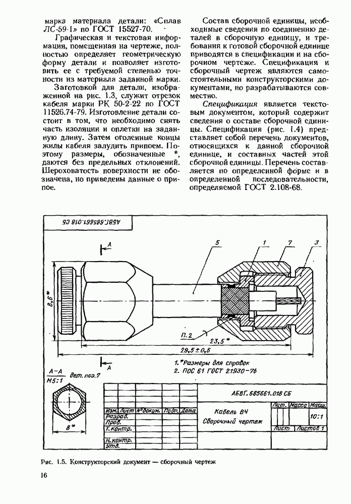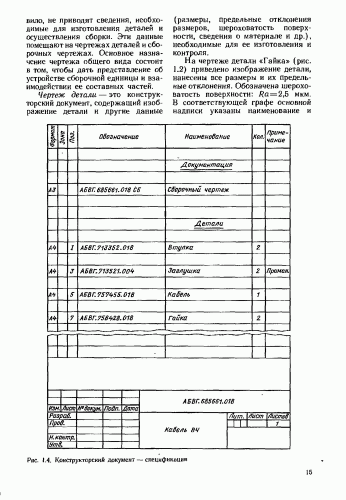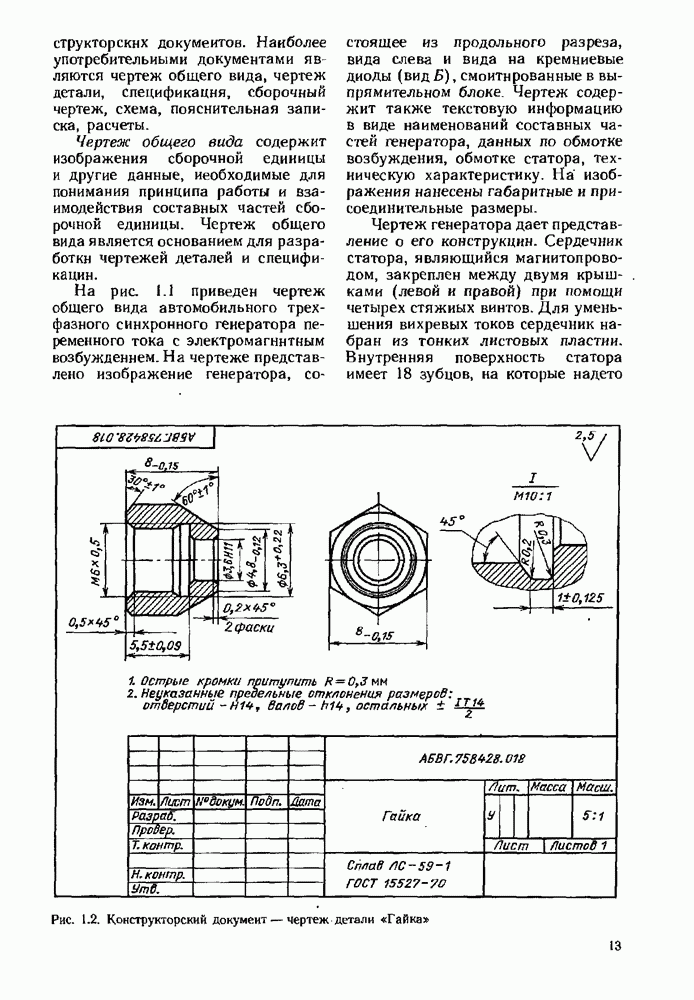 Рис. 1.2. Конструкторский документ — чертеж детали «Гайка» Рис. 1.3. (см. скан) Конструкторский документ — чертеж детали «Кабель» 18 катушек статора (см. данные «Обмотка статора»). Ротор состоит из двух шестиполюсных наконечников. Наконечники одной половины ротора входят в пазы между наконечниками второй половины. В полости между наконечниками ротора помещена катушка возбуждения, закрепленная на магнитопроводе, выполненном в виде втулки, посаженной на шлицевой вал. Опорами ротора служат два шариковых подшипника качения, которые заполнены консистентной смазкой и защищены кольцевыми уплотнениями. Выводы обмотки возбуждения соединены с контактными кольцами, к которым прижимаются пружинами две щетки генератора. Одна из щеток соединена со штекерным зажимом, вторая присоединена к корпусу генератора. Привод генератора осуществляется от двигателя автомобиля посредством ременной передачи, шкнв которой закреплен на валу генератора при помощи сегментной шпонки. Та же шпонка передает вращение крыльчатке, служащей для охлаждения генератора. На чертеже общего вида, как правило, не приводят сведения, необходимые для изготовления деталей и осуществления сборки. Эти данные помещают на чертежах деталей и сборочных чертежах. Основное назначение чертежа общего вида состоит в том, чтобы дать представление об устройстве сборочной единицы и взаимодействии ее составных частей. Чертеж детали — это конструкторский документ, содержащий изображение детали и другие данные (размеры, предельные отклонения размеров, шероховатость поверхности, сведения о материале и др.), необходимые для ее изготовления и контроля. На чертеже детали «Гайка» (рис. 1.2) приведено изображение детали, нанесены все размеры и их предельные отклонения. Обозначена шероховатость поверхности: Рис. 1.4. (см. скан) Конструкторский Документ — спецификация марка материала детали: «Сплав ЛС-59-1» по ГОСТ 15527-70. Графическая и текстовая информация, помещенная на чертеже, полностью определяет геометрическую форму детали и позволяет изготовить ее с требуемой степенью точности из материала заданной марки. Заготовкой для детали, изображенной на рис. 1.3, служит отрезок кабеля марки РК 50-2-22 по ГОСТ 11526,74-79. Изготовление детали состоит в том, что необходимо снять часть изоляции и оплетки на заданную длину. Затем оголенные концы жилы кабеля залудить припоем. Поэтому размеры, обозначенные *, даются без предельных отклонений. Шероховатость поверхности не обозначена, но приведены данные о припое. Состав сборочной единицы, необходимые сведения по соединению деталей в сборочную единицу, и требования к готовой сборочной единице приводятся в спецификации и на сборочном чертеже. Спецификация и сборочный чертеж являются самостоятельными конструкторскими документами, но разрабатываются совместно. Спецификация является текстовым документом, который содержит сведения о составе сборочной единицы. Спецификация (рис. 1.4) представляет собой перечень документов, относящихся к данной сборочной единице, и составных частей этой сборочной единицы. Перечень составляется по определенной форме и в определенной последовательности, определяемой ГОСТ 2.108-68. Рис. 1.5. (см. скан) Конструкторский документ — сборочный чертеж