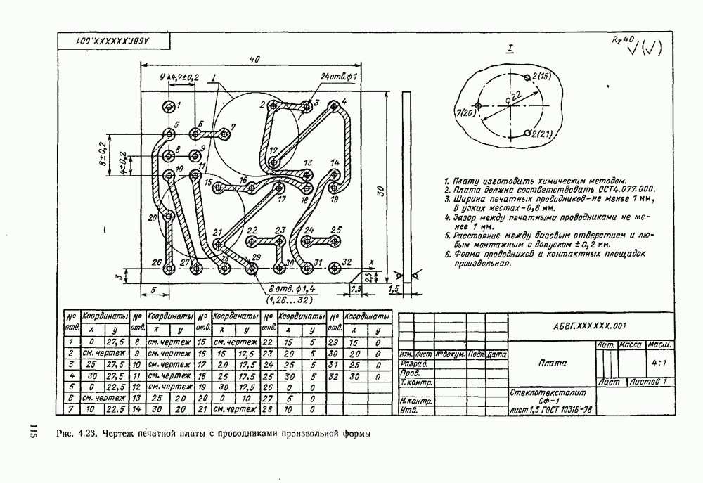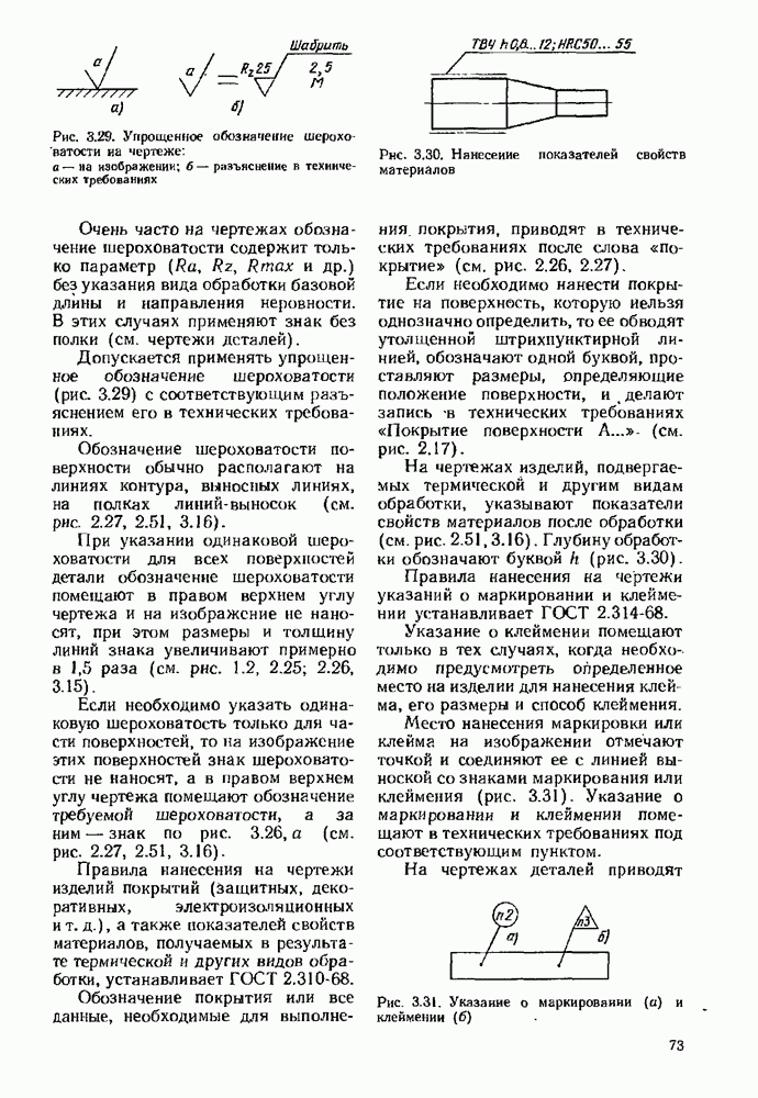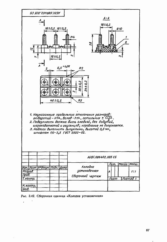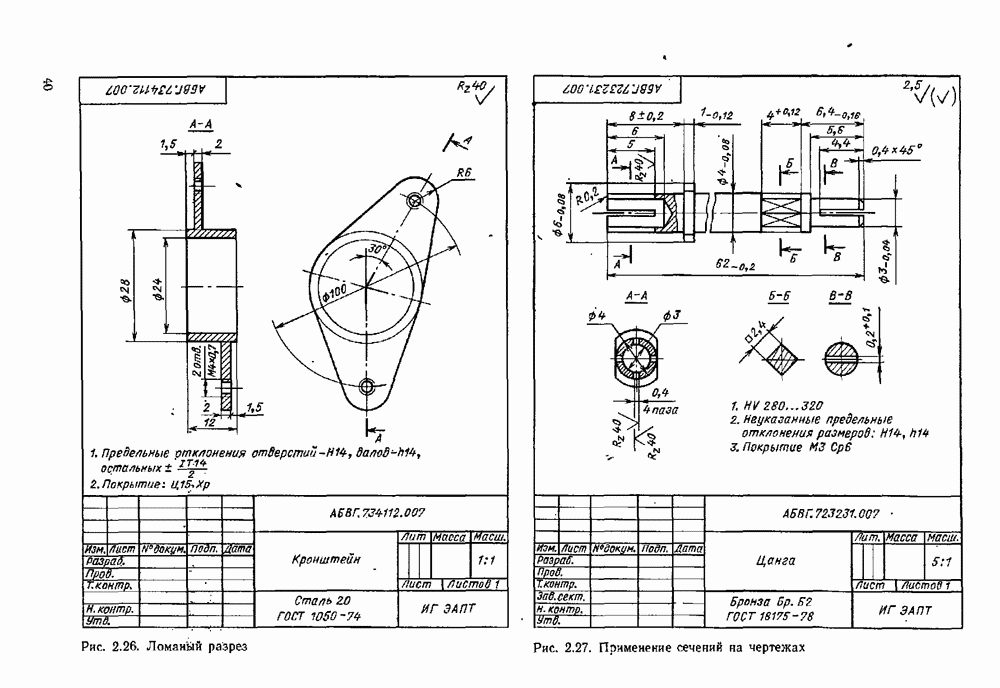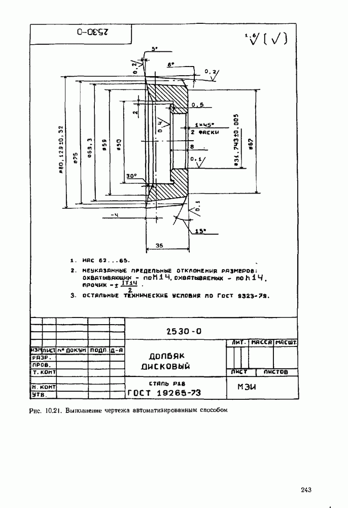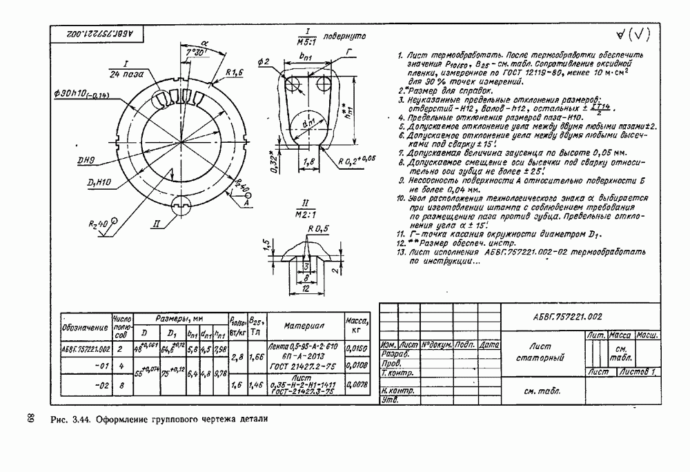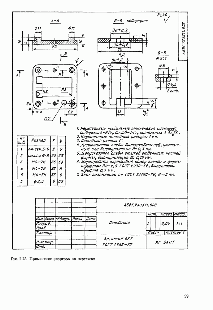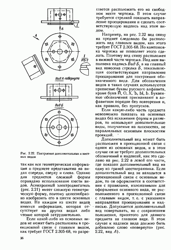 Рис. 1.2. Конструкторский документ — чертеж детали «Гайка» Рис. 1.3. (см. скан) Конструкторский документ — чертеж детали «Кабель» 18 катушек статора (см. данные «Обмотка статора»). Ротор состоит из двух шестиполюсных наконечников. Наконечники одной половины ротора входят в пазы между наконечниками второй половины. В полости между наконечниками ротора помещена катушка возбуждения, закрепленная на магнитопроводе, выполненном в виде втулки, посаженной на шлицевой вал. Опорами ротора служат два шариковых подшипника качения, которые заполнены консистентной смазкой и защищены кольцевыми уплотнениями. Выводы обмотки возбуждения соединены с контактными кольцами, к которым прижимаются пружинами две щетки генератора. Одна из щеток соединена со штекерным зажимом, вторая присоединена к корпусу генератора. Привод генератора осуществляется от двигателя автомобиля посредством ременной передачи, шкнв которой закреплен на валу генератора при помощи сегментной шпонки. Та же шпонка передает вращение крыльчатке, служащей для охлаждения генератора. На чертеже общего вида, как правило, не приводят сведения, необходимые для изготовления деталей и осуществления сборки. Эти данные помещают на чертежах деталей и сборочных чертежах. Основное назначение чертежа общего вида состоит в том, чтобы дать представление об устройстве сборочной единицы и взаимодействии ее составных частей. Чертеж детали — это конструкторский документ, содержащий изображение детали и другие данные (размеры, предельные отклонения размеров, шероховатость поверхности, сведения о материале и др.), необходимые для ее изготовления и контроля. На чертеже детали «Гайка» (рис. 1.2) приведено изображение детали, нанесены все размеры и их предельные отклонения. Обозначена шероховатость поверхности: Рис. 1.4. (см. скан) Конструкторский Документ — спецификация марка материала детали: «Сплав ЛС-59-1» по ГОСТ 15527-70. Графическая и текстовая информация, помещенная на чертеже, полностью определяет геометрическую форму детали и позволяет изготовить ее с требуемой степенью точности из материала заданной марки. Заготовкой для детали, изображенной на рис. 1.3, служит отрезок кабеля марки РК 50-2-22 по ГОСТ 11526,74-79. Изготовление детали состоит в том, что необходимо снять часть изоляции и оплетки на заданную длину. Затем оголенные концы жилы кабеля залудить припоем. Поэтому размеры, обозначенные *, даются без предельных отклонений. Шероховатость поверхности не обозначена, но приведены данные о припое. Состав сборочной единицы, необходимые сведения по соединению деталей в сборочную единицу, и требования к готовой сборочной единице приводятся в спецификации и на сборочном чертеже. Спецификация и сборочный чертеж являются самостоятельными конструкторскими документами, но разрабатываются совместно. Спецификация является текстовым документом, который содержит сведения о составе сборочной единицы. Спецификация (рис. 1.4) представляет собой перечень документов, относящихся к данной сборочной единице, и составных частей этой сборочной единицы. Перечень составляется по определенной форме и в определенной последовательности, определяемой ГОСТ 2.108-68. Рис. 1.5. (см. скан) Конструкторский документ — сборочный чертеж