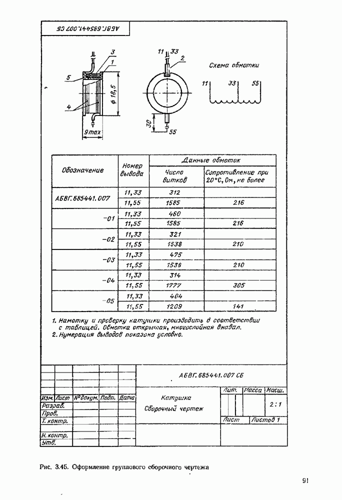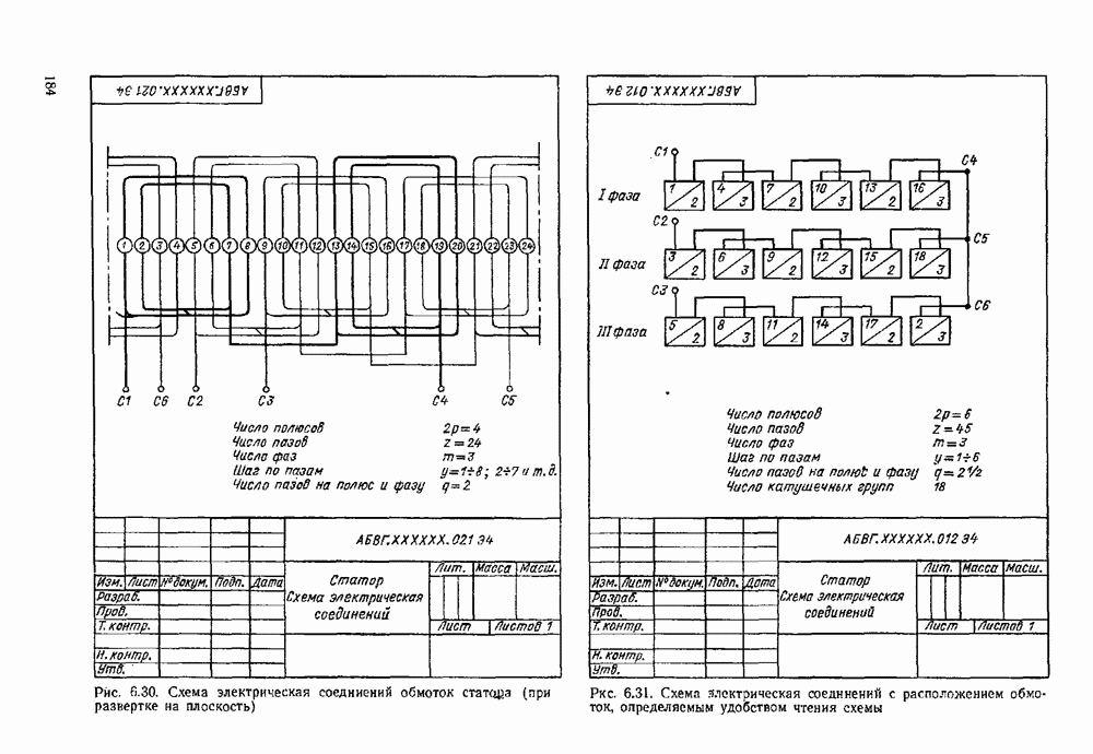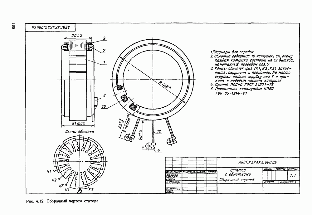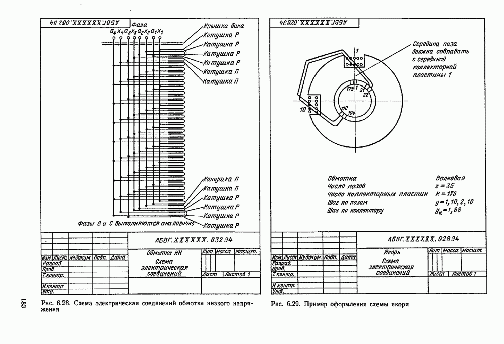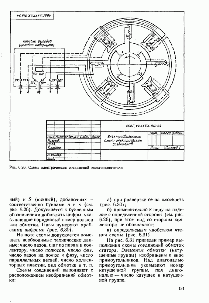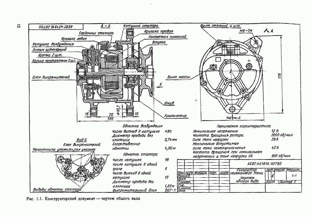 (кликните для просмотра скана) конструкторских документов. Наиболее употребительными документами являются чертеж общего вида, чертеж детали, спецификация, сборочный чертеж, схема, пояснительная записка, расчеты. Чертеж общего вида содержит изображения сборочной единицы и другие данные, необходимые для понимания принципа работы и взаимодействия составных частей сборочной единицы. Чертеж общего вида является основанием для разработки чертежей деталей и спецификации. На рис. 1.1 приведен чертеж общего вида автомобильного трехфазного синхронного генератора переменного тока с электромагнитным возбуждением. На чертеже представлено изображение генератора, состоящее из продольного разреза, вида слева и вида на кремниевые диоды (вид Б), смонтированные в выпрямительном блоке. Чертеж содержит также текстовую информацию в виде наименований составных частей генератора, данных по обмотке возбуждения, обмотке статора, техническую характеристику. На изображения нанесены габаритные и присоединительные размеры. Чертеж генератора дает представление о его конструкции. Сердечник статора, являющийся магнитопроводом, закреплен между двумя крышками (левой и правой) при помощи четырех стяжиых винтов. Для уменьшения вихревых токов сердечник набран из тонких листовых пластин. Внутренняя поверхность статора имеет 18 зубцов, на которые надето