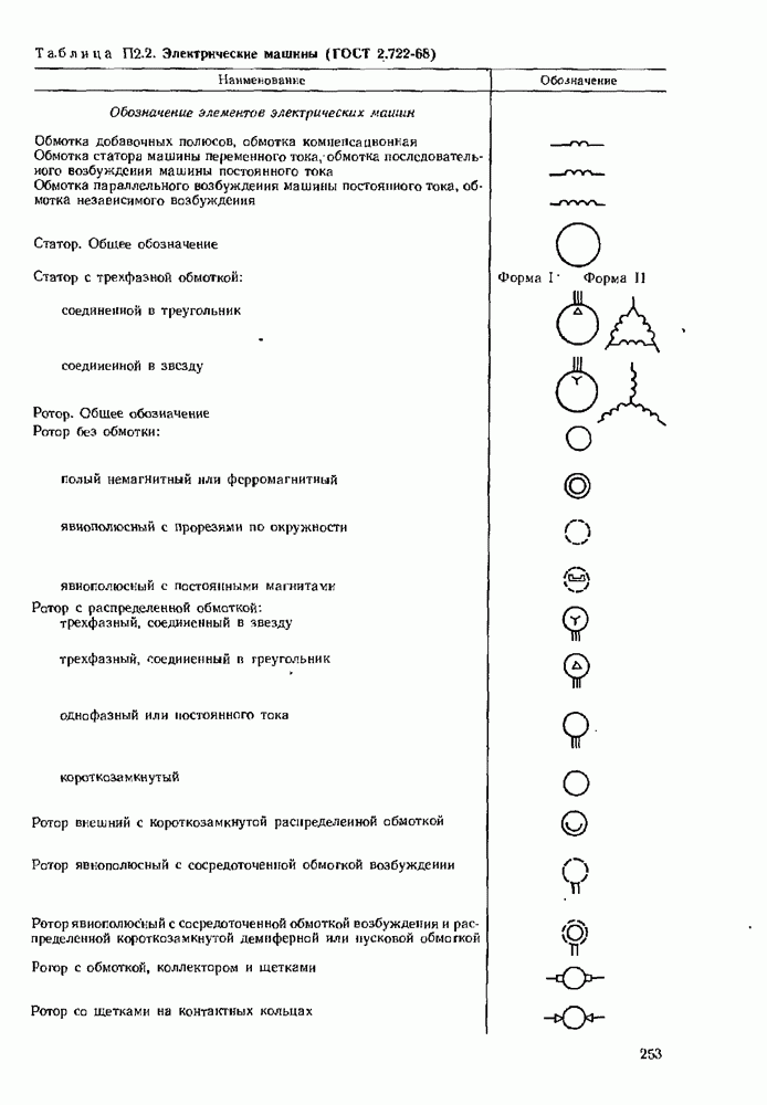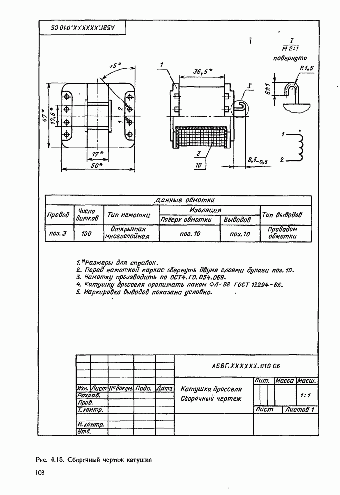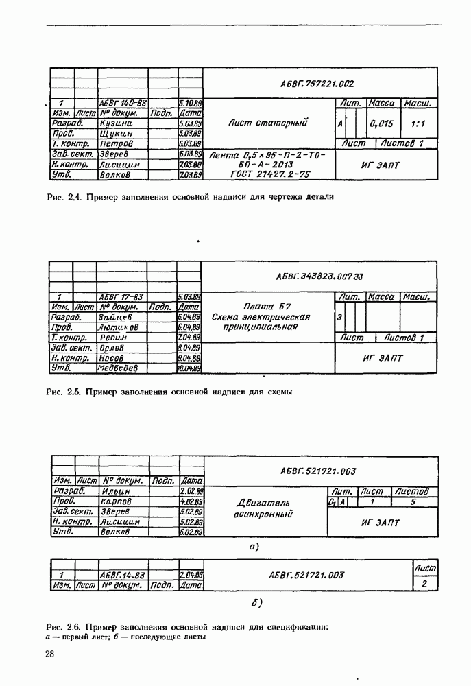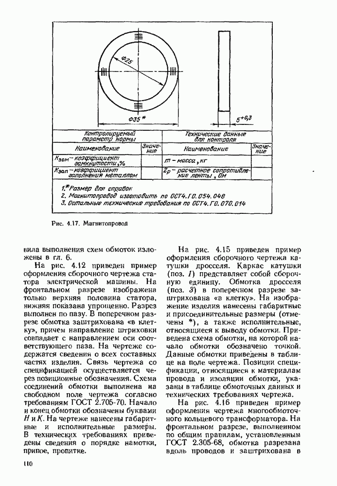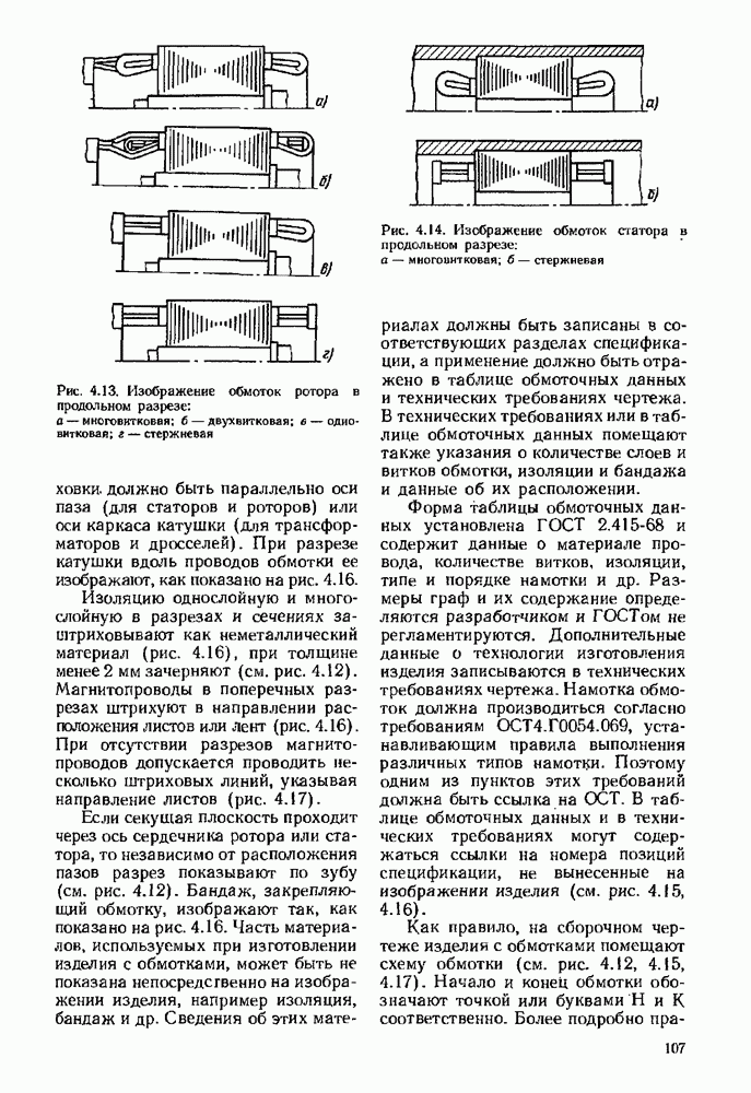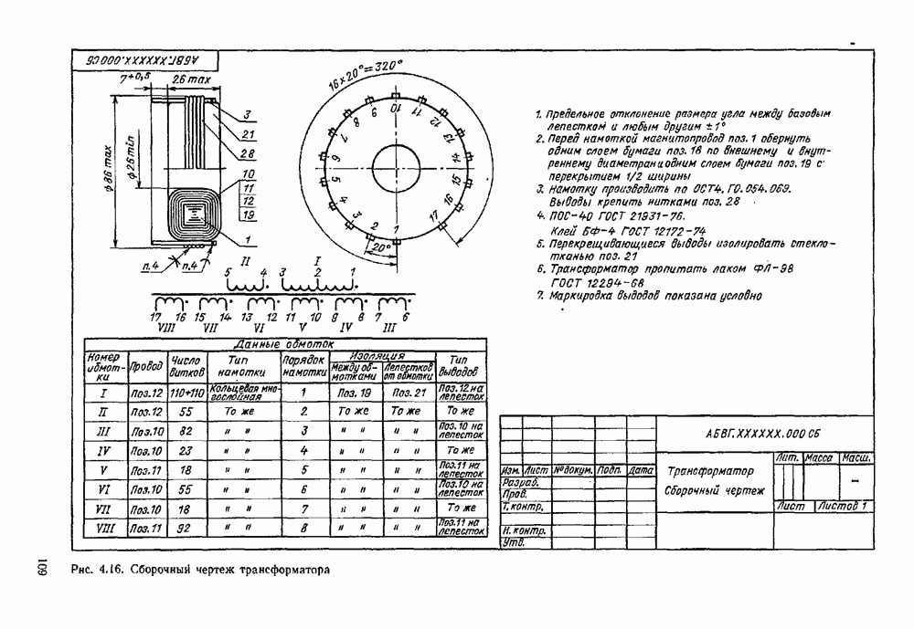 (кликните для просмотра скана) конструкторских документов. Наиболее употребительными документами являются чертеж общего вида, чертеж детали, спецификация, сборочный чертеж, схема, пояснительная записка, расчеты. Чертеж общего вида содержит изображения сборочной единицы и другие данные, необходимые для понимания принципа работы и взаимодействия составных частей сборочной единицы. Чертеж общего вида является основанием для разработки чертежей деталей и спецификации. На рис. 1.1 приведен чертеж общего вида автомобильного трехфазного синхронного генератора переменного тока с электромагнитным возбуждением. На чертеже представлено изображение генератора, состоящее из продольного разреза, вида слева и вида на кремниевые диоды (вид Б), смонтированные в выпрямительном блоке. Чертеж содержит также текстовую информацию в виде наименований составных частей генератора, данных по обмотке возбуждения, обмотке статора, техническую характеристику. На изображения нанесены габаритные и присоединительные размеры. Чертеж генератора дает представление о его конструкции. Сердечник статора, являющийся магнитопроводом, закреплен между двумя крышками (левой и правой) при помощи четырех стяжиых винтов. Для уменьшения вихревых токов сердечник набран из тонких листовых пластин. Внутренняя поверхность статора имеет 18 зубцов, на которые надето