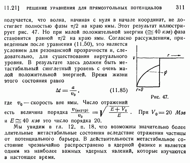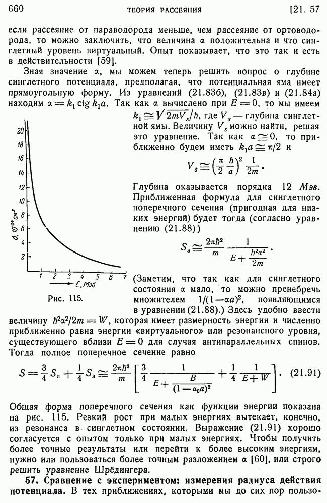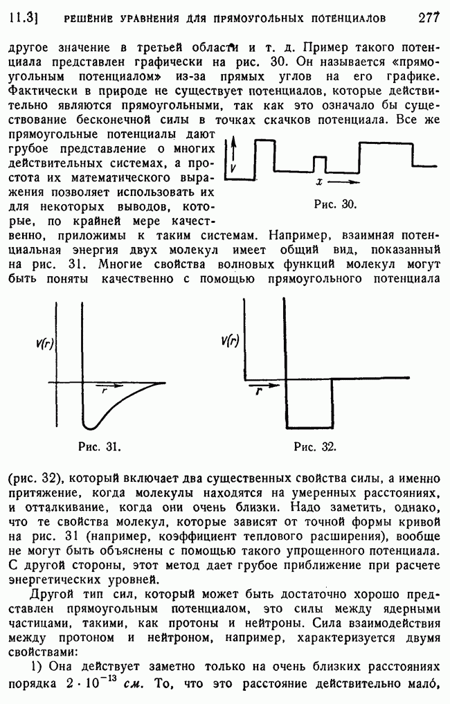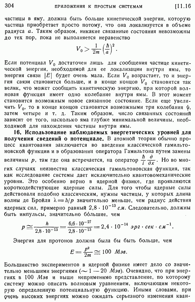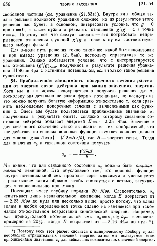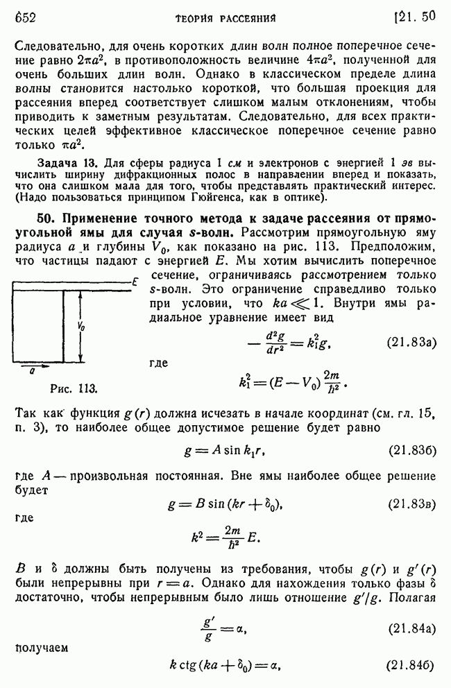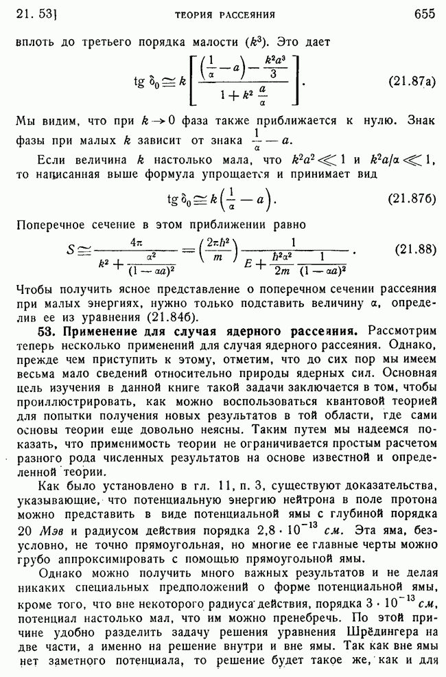 То, что борновское приближение оказалось столь подходящим, весьма плодотворно отразилось на развитии атомной теории, так как в противном случае разработка теории строения атома надолго затормозилась бы просто вследствие математических трудностей. Однако можно легко показать, что при рассеянии на ядрах борновское приближение непригодно, за исключением случая очень высоких энергий рассеиваемых частиц (100 Мэв или выше). Чтобы показать это, воспользуемся прямоугольной ямой, моделирующей потенциал ядерных сил, как это рассматривалось в гл. 11, п. 3. Можно